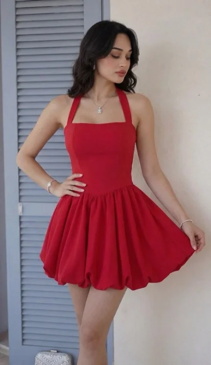 Gecenin tüm bakışlarını üzerinizde toplamaya hazır mısınız? Bu iddialı kırmızı mezuniyet balon elbise, enerjik rengi ve sezonun en hit trendi olan hacimli etek kesimiyle özel anlarınızın favorisi olacak. Boyundan bağlamalı (halter yaka) tasarımı ve vücudu toparlayan dabıl kumaş kalitesi ile kusursuz bir silüet yaratıyor.