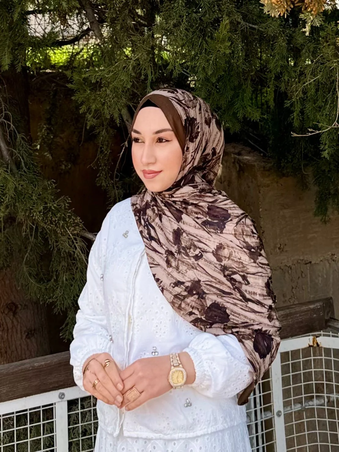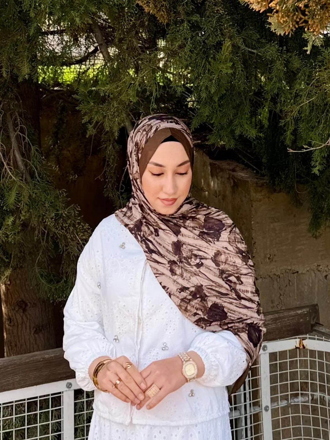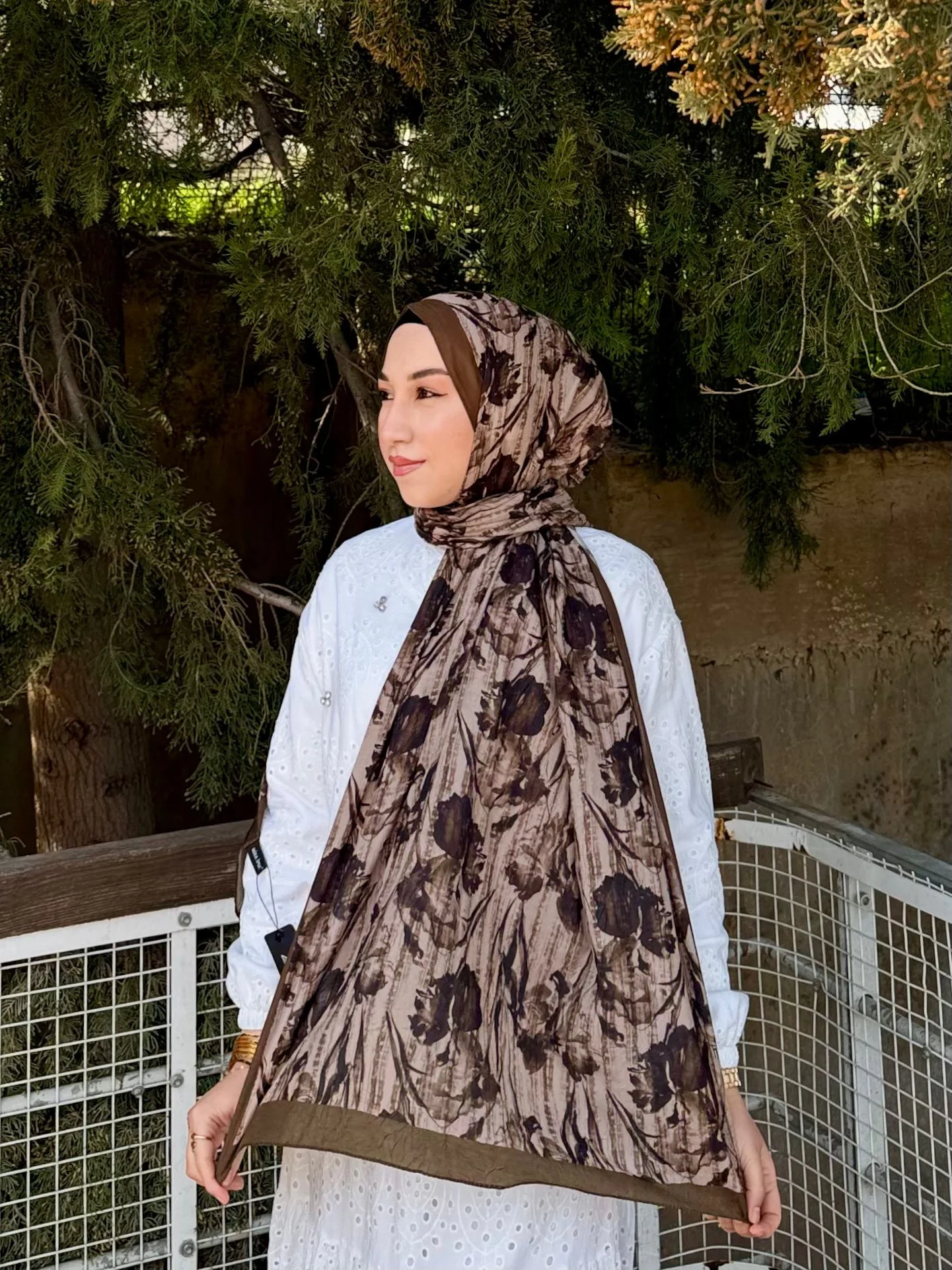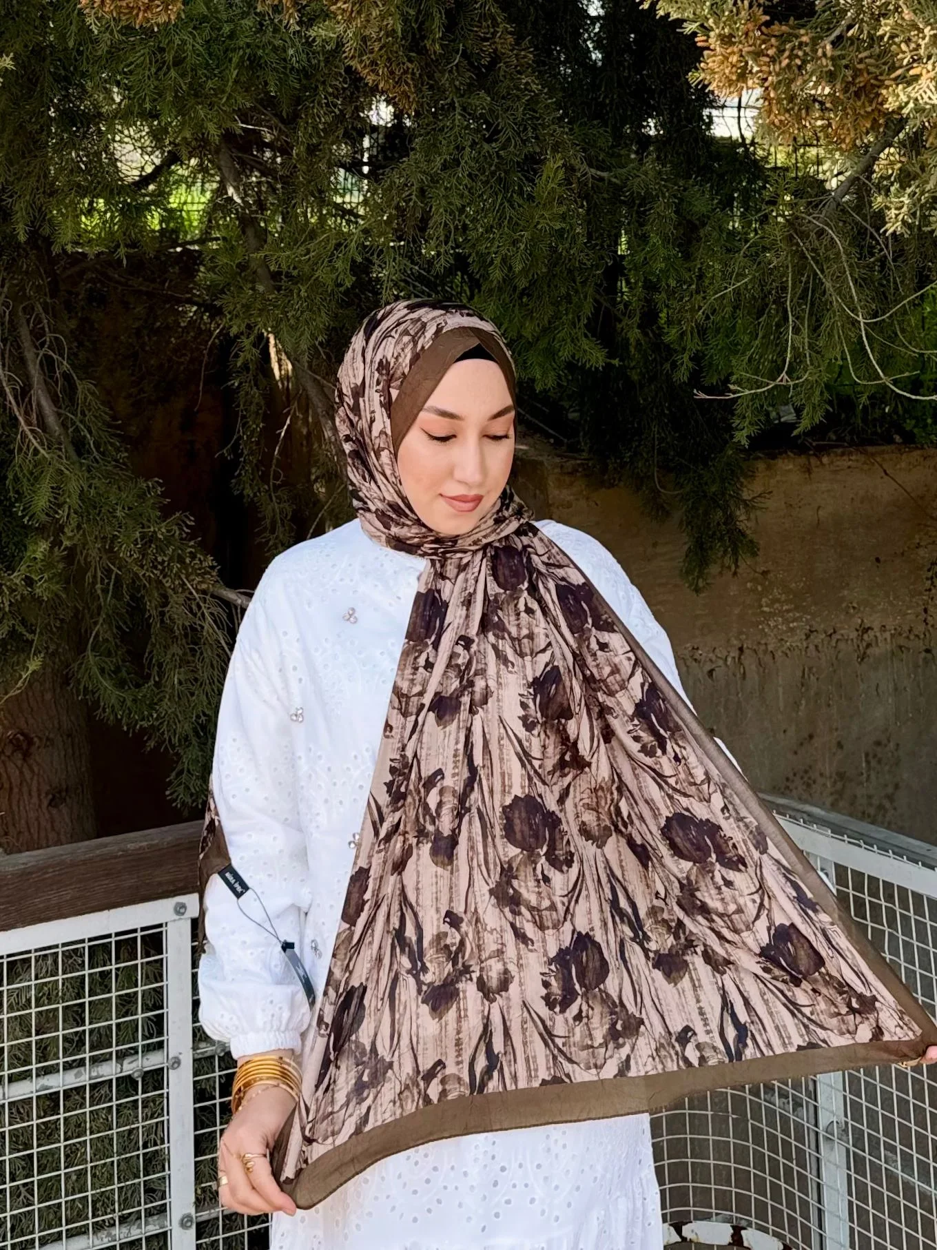 Bu kahve floral desenli bambu şalı, görseldeki gibi beyaz fisto bir tunik veya taba rengi keten bir kap ile kombinleyerek asil bir görünüm yakalayabilirsiniz. Gold takılarla kahvenin sıcak tonlarını vurgulayarak Pinterest estetiğini tarzınıza yansıtın.