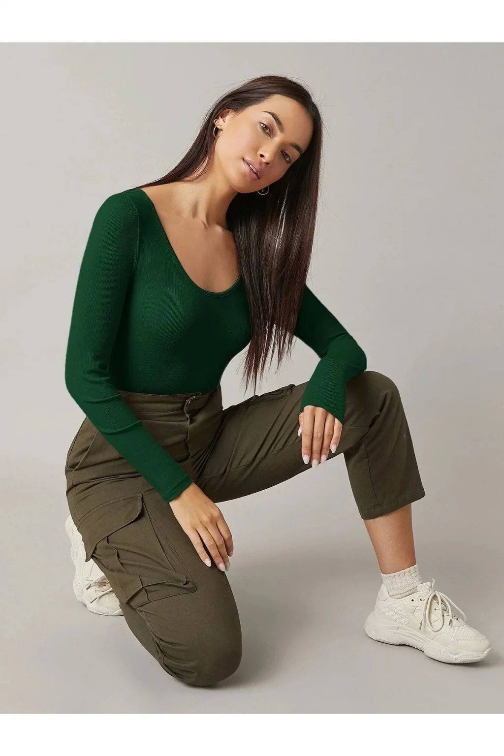Kadın Koyu Yeşil Uzun Kollu Ipek Jarse Bodysuit