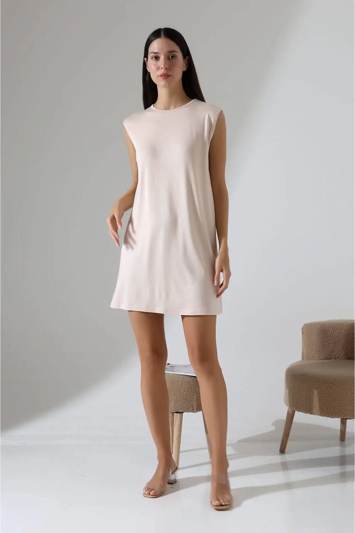 Kadın Bisiklet Yaka Vatkalı Kolsuz Oversize Penye T-shirt Tunik Elbise - Krem