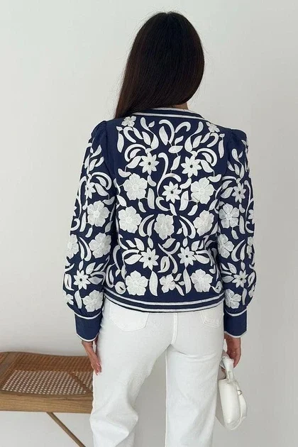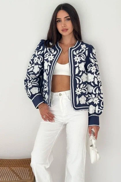 Yoğun Nakış İşçiliği: Ceketin tamamını kaplayan beyaz floral (çiçeksi) nakışlar, baskı değil %100 işleme olup kabartmalı ve kaliteli bir dokuya sahiptir.