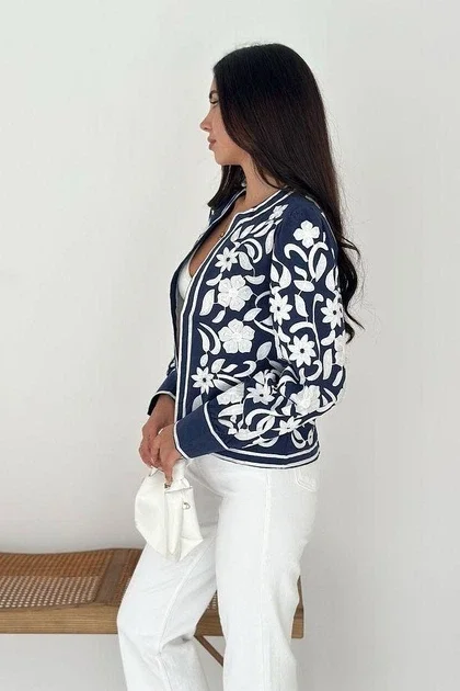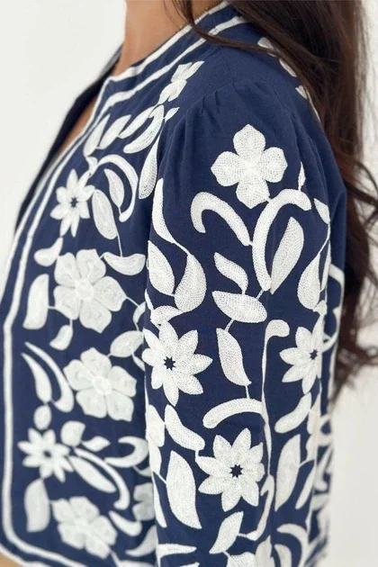 Üzerinizde bir sanat eseri taşıyın... Bu özel tasarım lacivert keten nakışlı ceket, zemin rengiyle kontrast oluşturan yoğun beyaz çiçek işlemeleriyle tüm bakışları üzerine çekiyor. Etnik desenlerin modern "Bomber Ceket" formuyla buluştuğu bu parça, serin yaz akşamları ve bahar ayları için gardırobunuzun en şık tamamlayıcısı olacak.