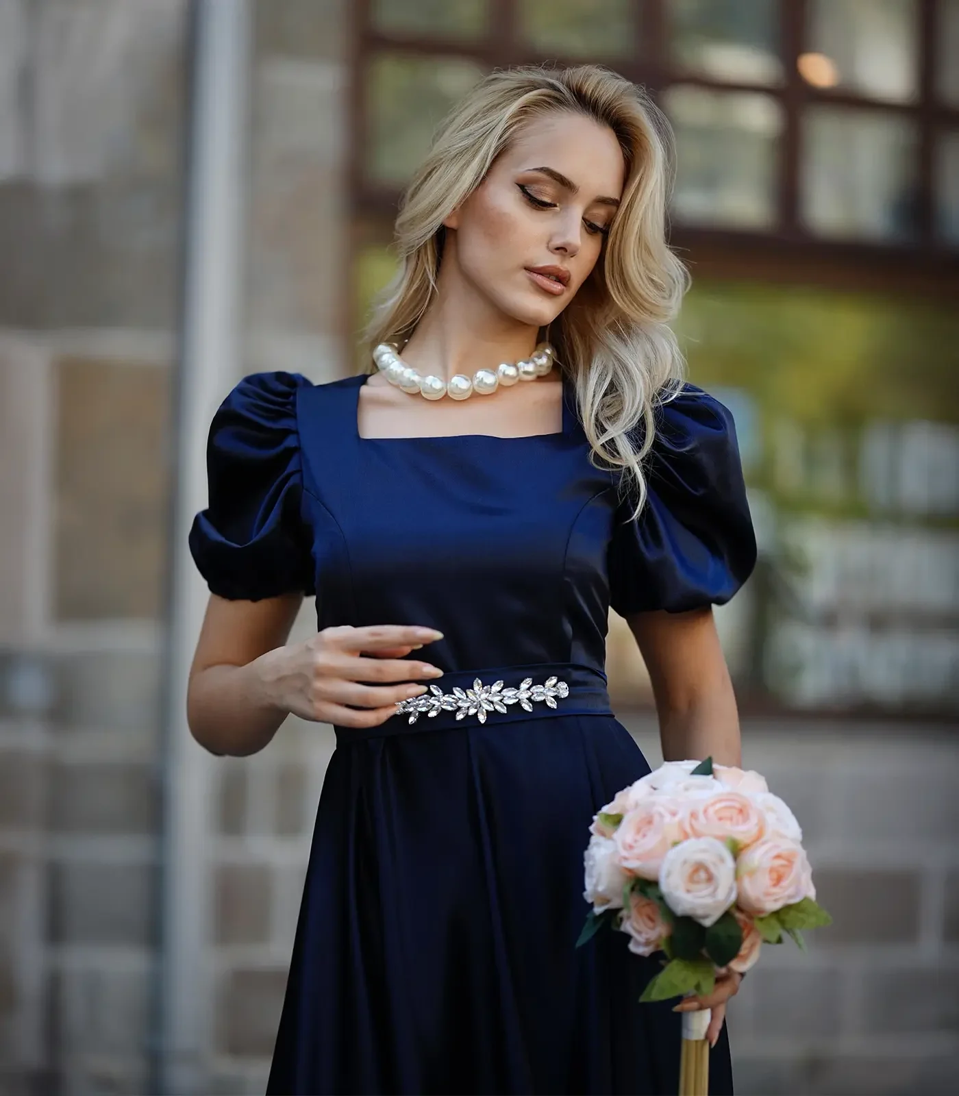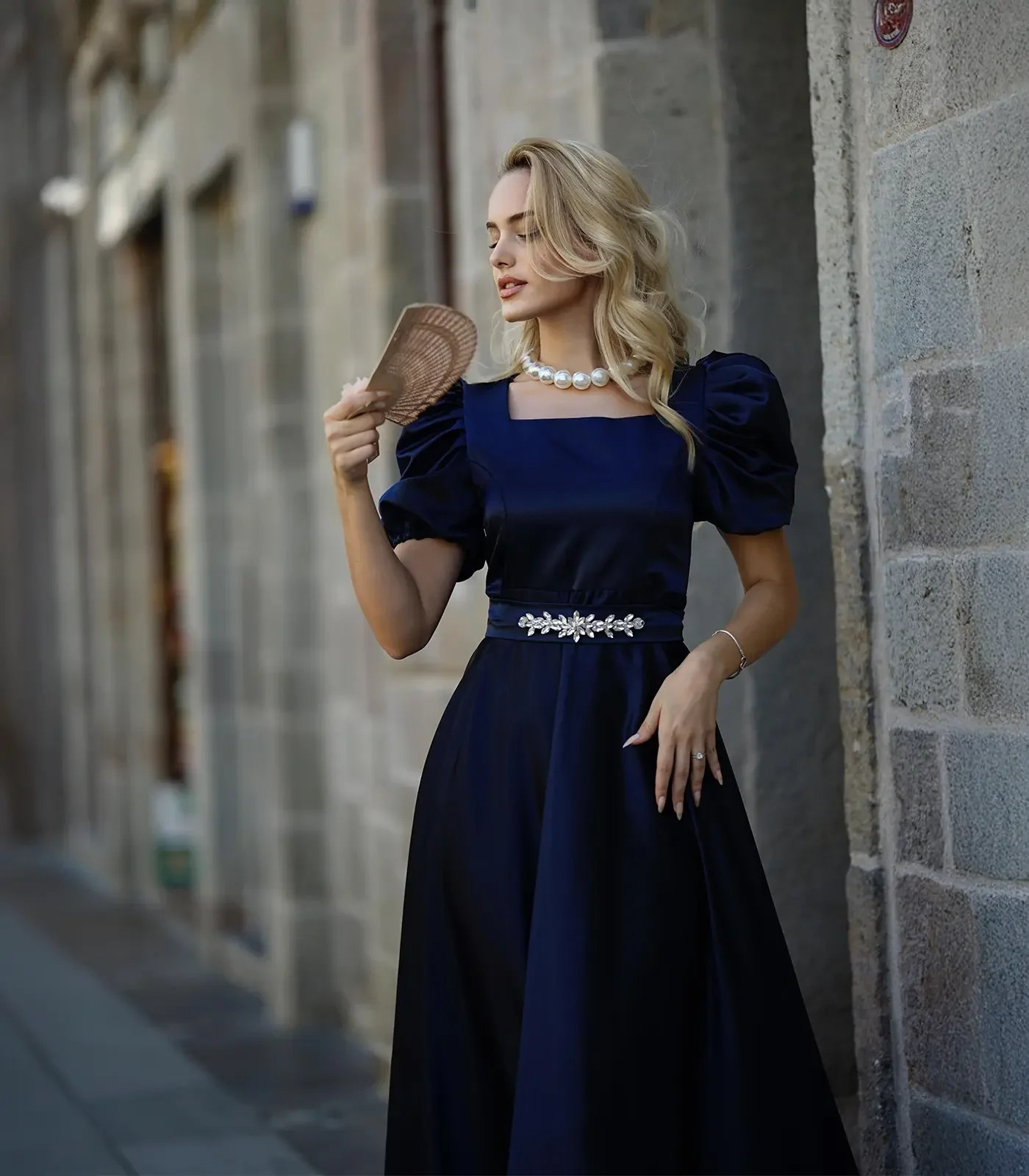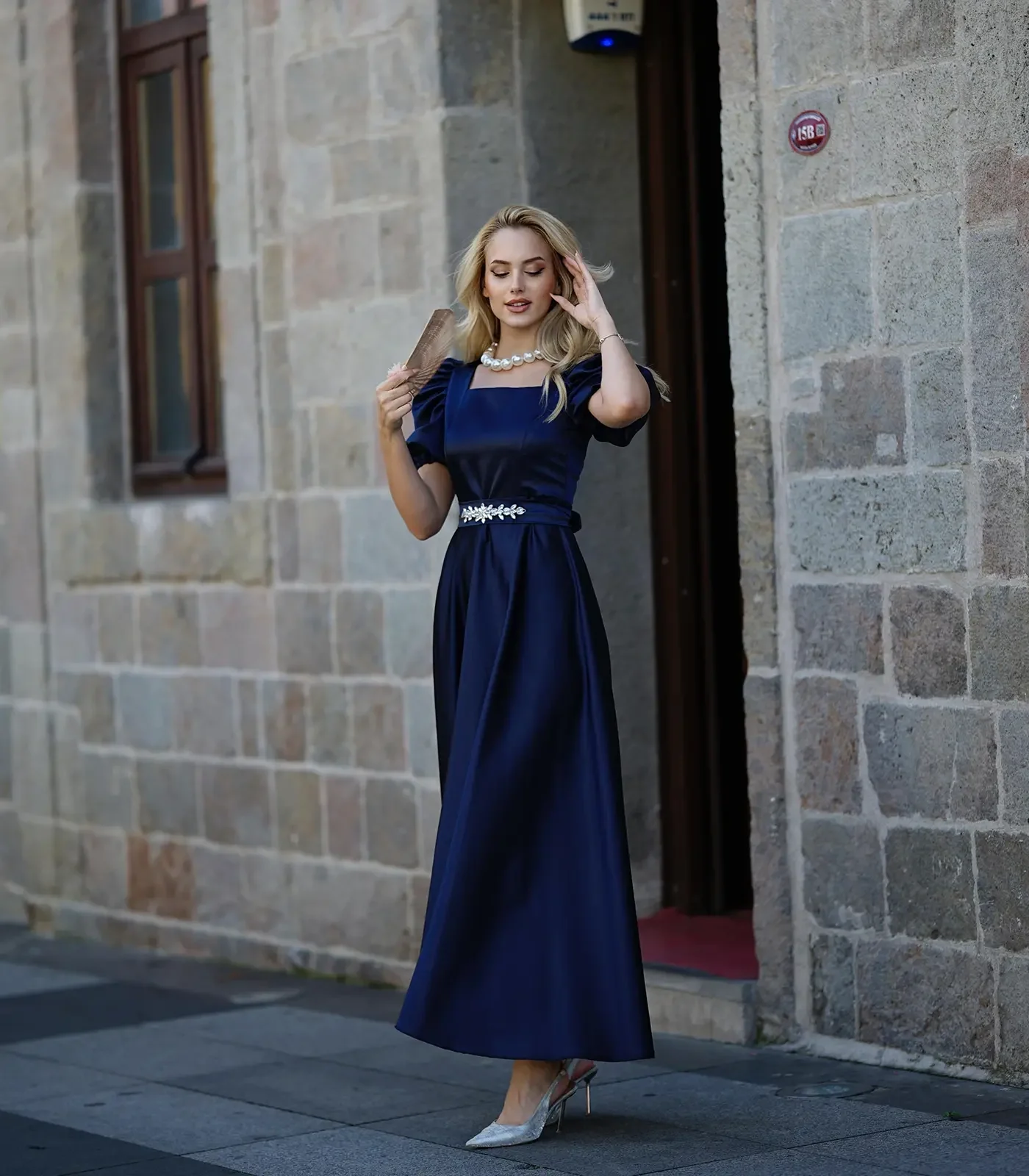Zarafetin en asil haliyle tanışın... Bu büyüleyici lacivert saten elbise, "Royal" (Kraliyet) tarzının sofistike detaylarını günümüze taşıyor. Kare yakanın boynu uzun gösteren etkisi, omuzlara nostaljik bir hacim katan karpuz kolları ve belinizi bir mücevher gibi saran taşlı kemeriyle, özel davetlerin tartışmasız en şık kadını olacaksınız.