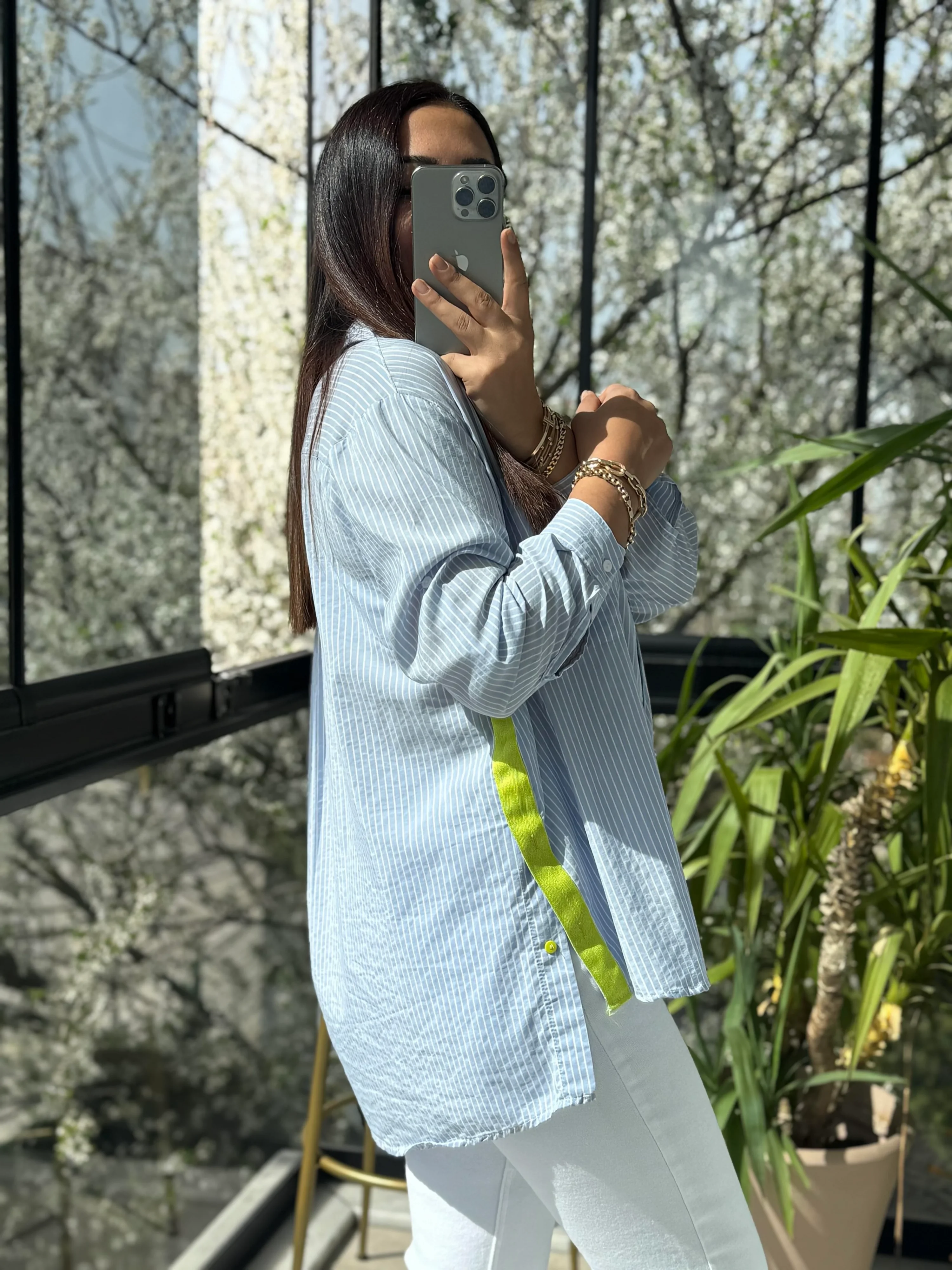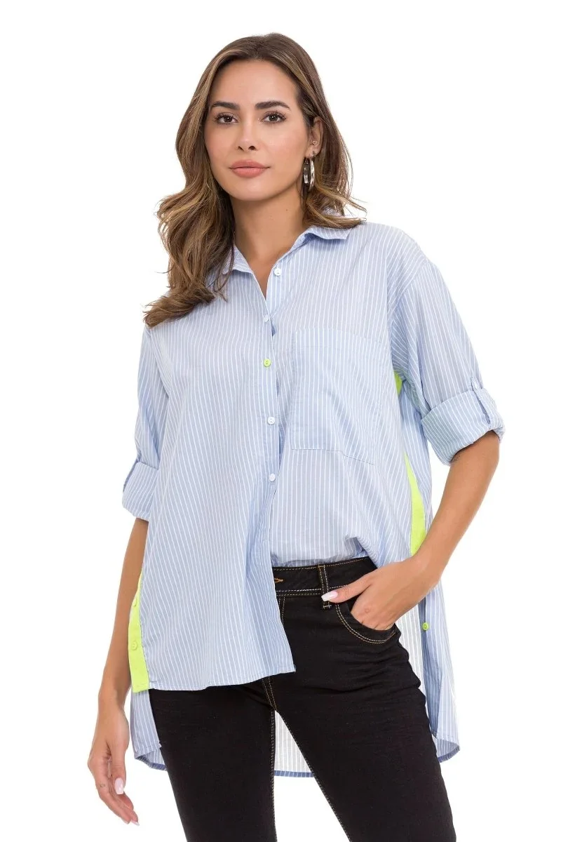 Zamansız çizgiler, modern bir dokunuşla buluştu! Bu mavi çizgili keten gömlek, klasik tasarımını yan kısımlarındaki sürpriz neon sarı panellerle hareketlendiriyor. Hem ofis şıklığına hem de hafta sonu rahatlığına uyum sağlayan bu parça, keten kumaşın ferahlığını trend detaylarla birleştiriyor.