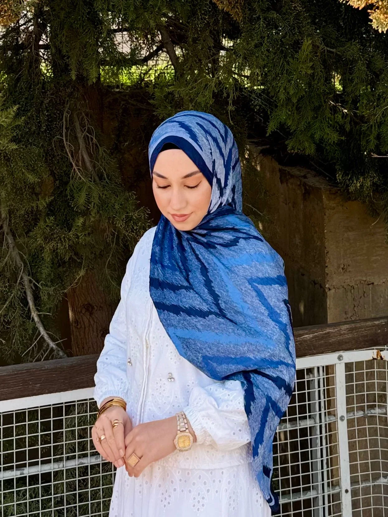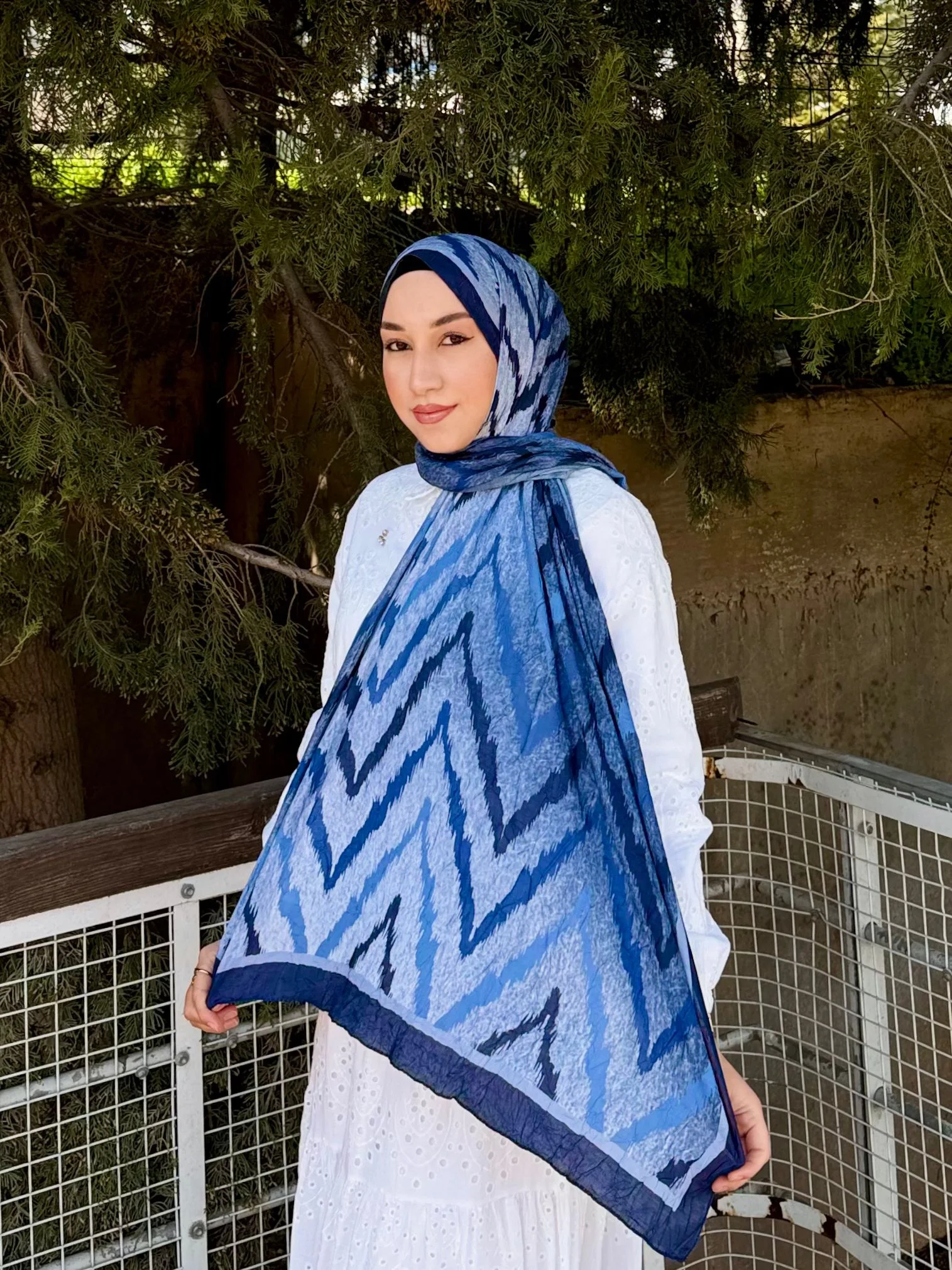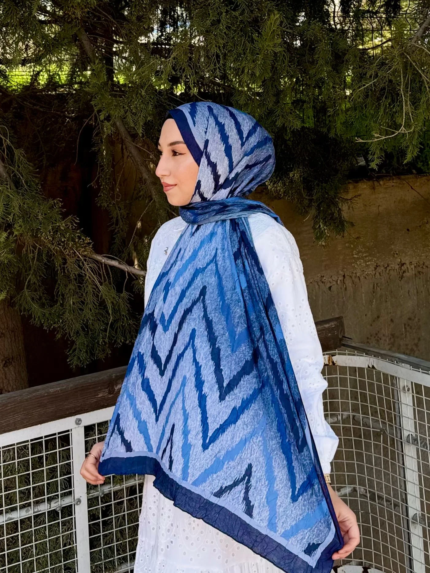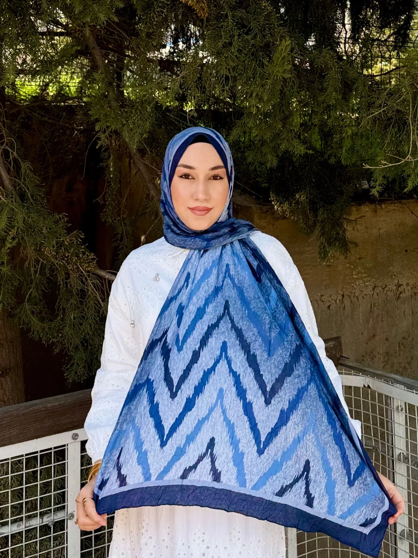 Modern geometrik çizgilerin bambu lifinin eşsiz yumuşaklığıyla buluştuğu bu zikzak desenli şal, stilinize dinamik bir dokunuş katıyor. Mavi ve lacivert tonlarının fırça darbesi efektli geçişleri, pamuklu içeriğin sunduğu nefes alan yapı sayesinde gün boyu konforlu bir kullanım vadediyor.