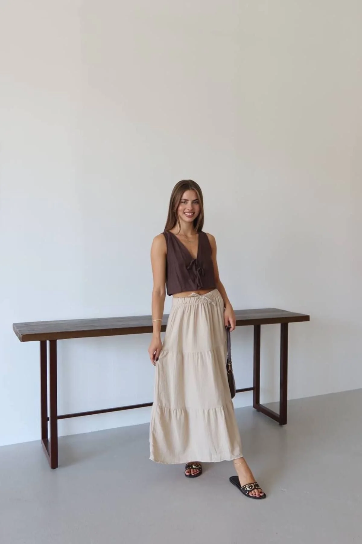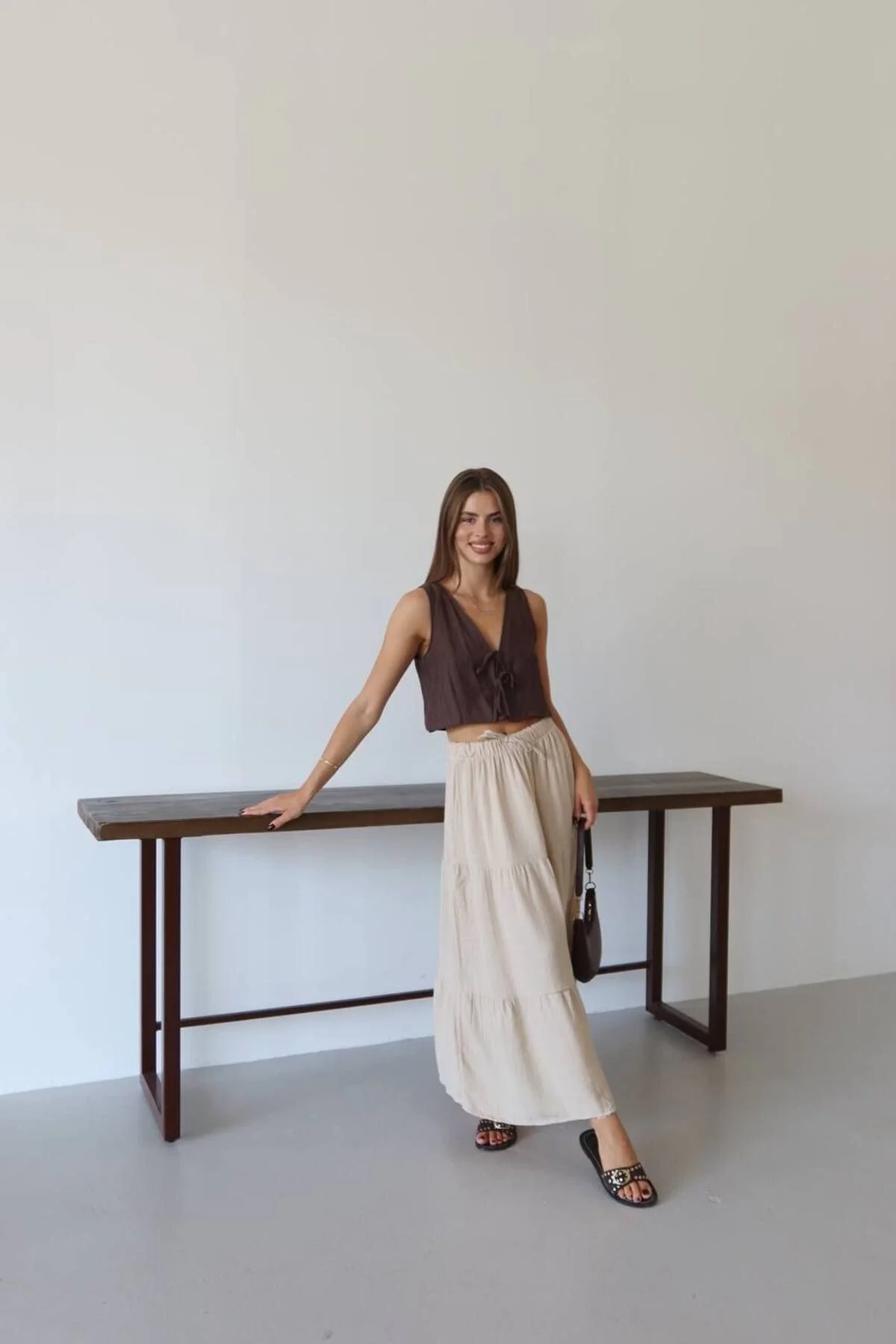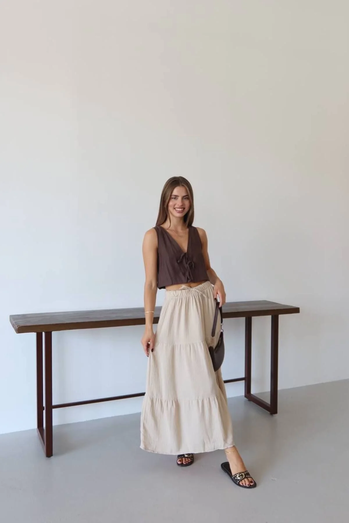 Kadın Yüksek Bel Beli Lastikli ve Bağcıklı Kat Kat Astarlı Poplin Uzun Etek - Bej