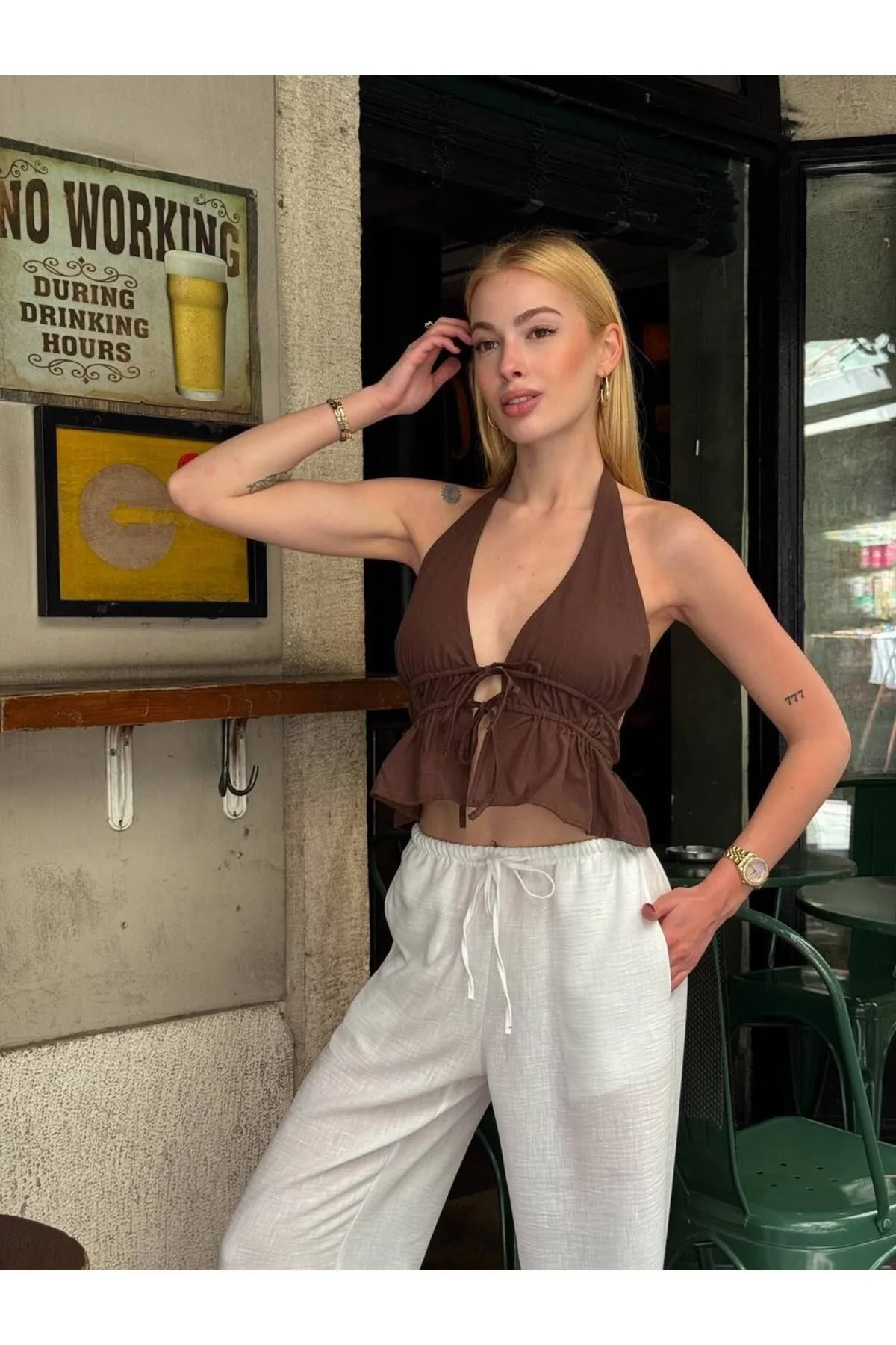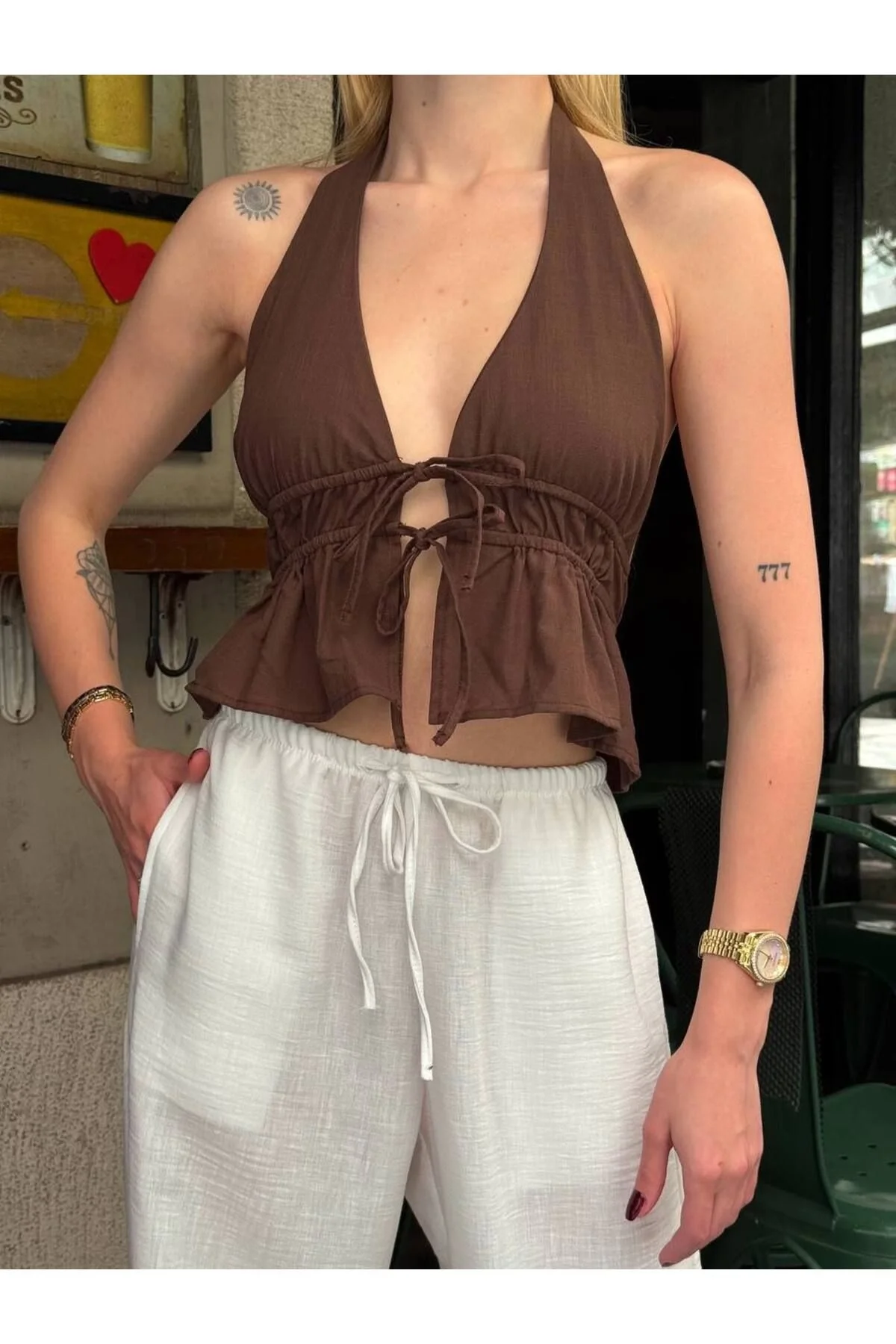 Arkası açık ve boyundan bağlamalı tasarım Yumuşak, nefes alan pamuk keten kumaş Crop kesim ve büzgülü detaylar Hafif dökümlü ve bohem stil Yaz kombinleri için ideal Manken üzerindeki S beden