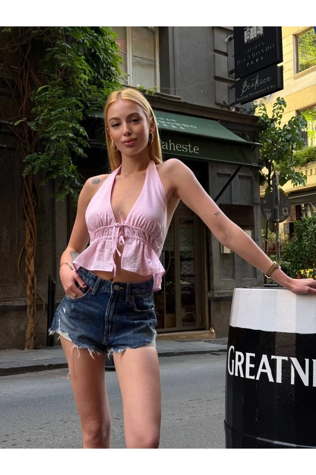 Arkası açık ve boyundan bağlamalı tasarım Yumuşak, nefes alan pamuk keten kumaş Crop kesim ve büzgülü detaylar Hafif dökümlü ve bohem stil Yaz kombinleri için ideal Manken üzerindeki S beden