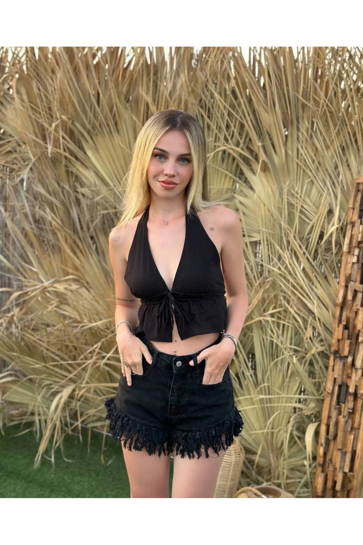 Arkası açık ve boyundan bağlamalı tasarım Yumuşak, nefes alan pamuk keten kumaş Crop kesim ve büzgülü detaylar Hafif dökümlü ve bohem stil Yaz kombinleri için ideal Manken üzerindeki S beden