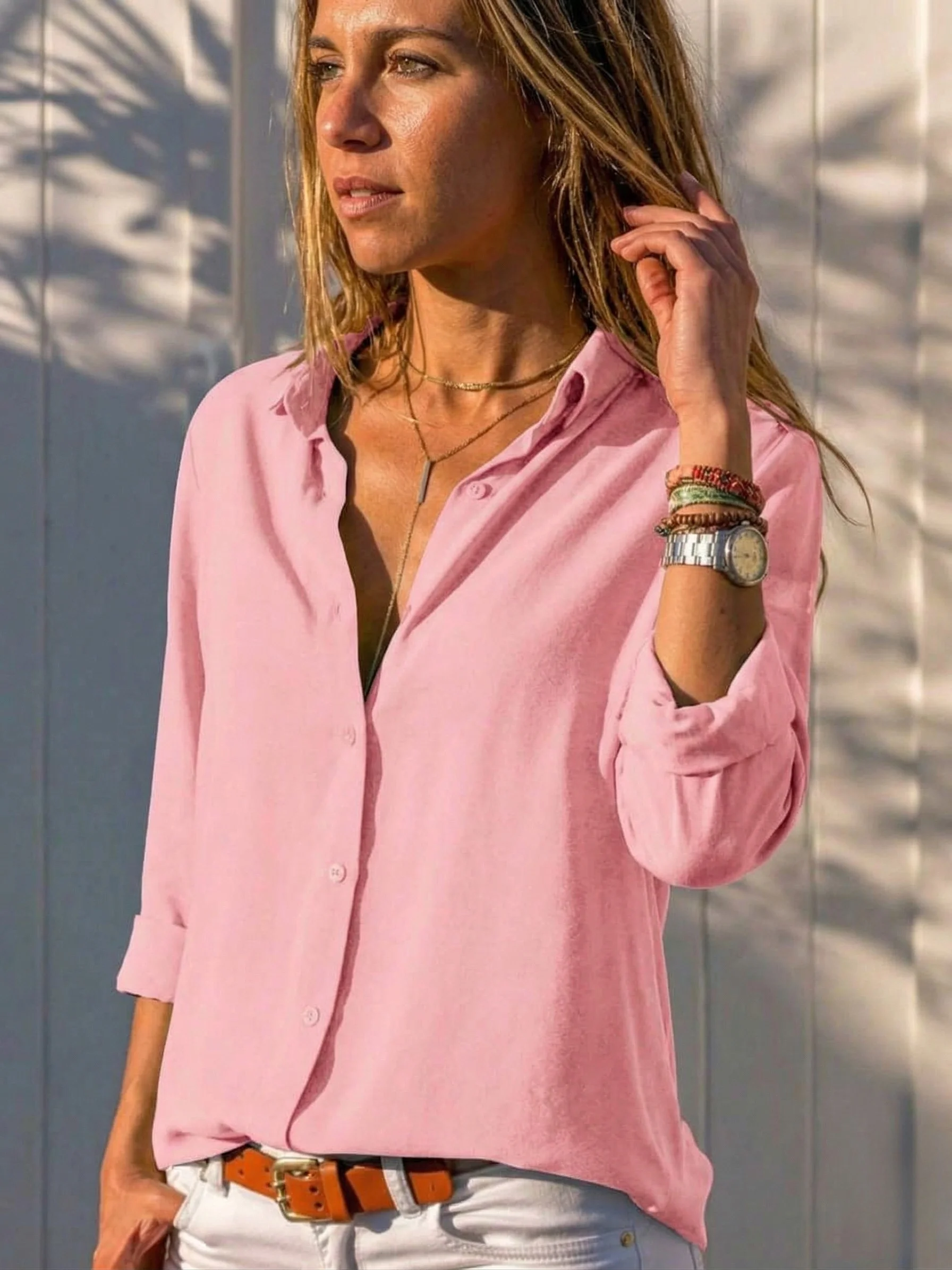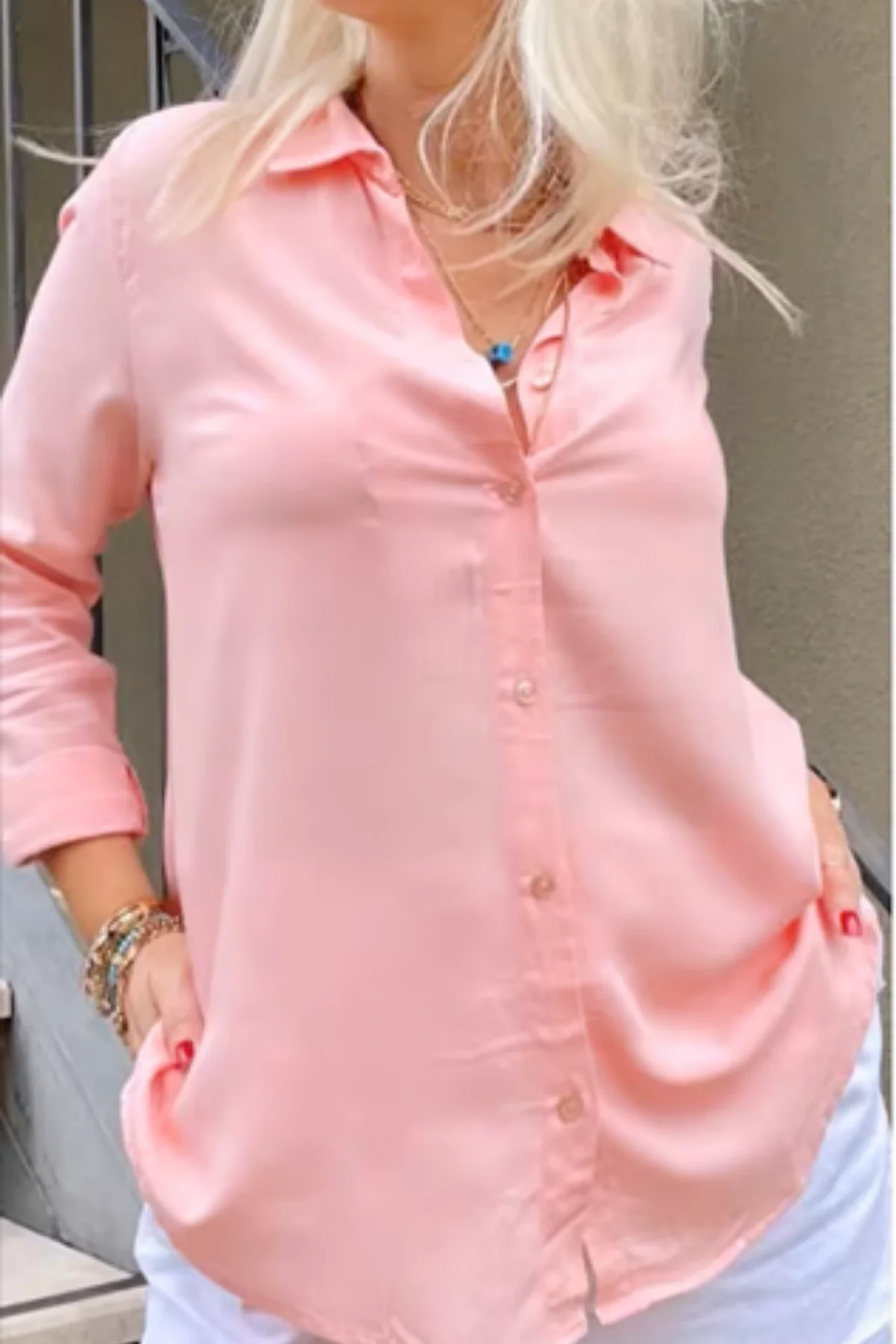 Bu pembe dokuma gömleği, beyaz yüksek bel bir pantolon ve gümüş aksesuarlarla tamamlayarak modern bir yaz şıklığı yakalayabilirsiniz. Daha spor bir görünüm için kollarını kıvırıp jean pantolonlarla eşleştirerek günlük tarzınızı ön plana çıkarın.