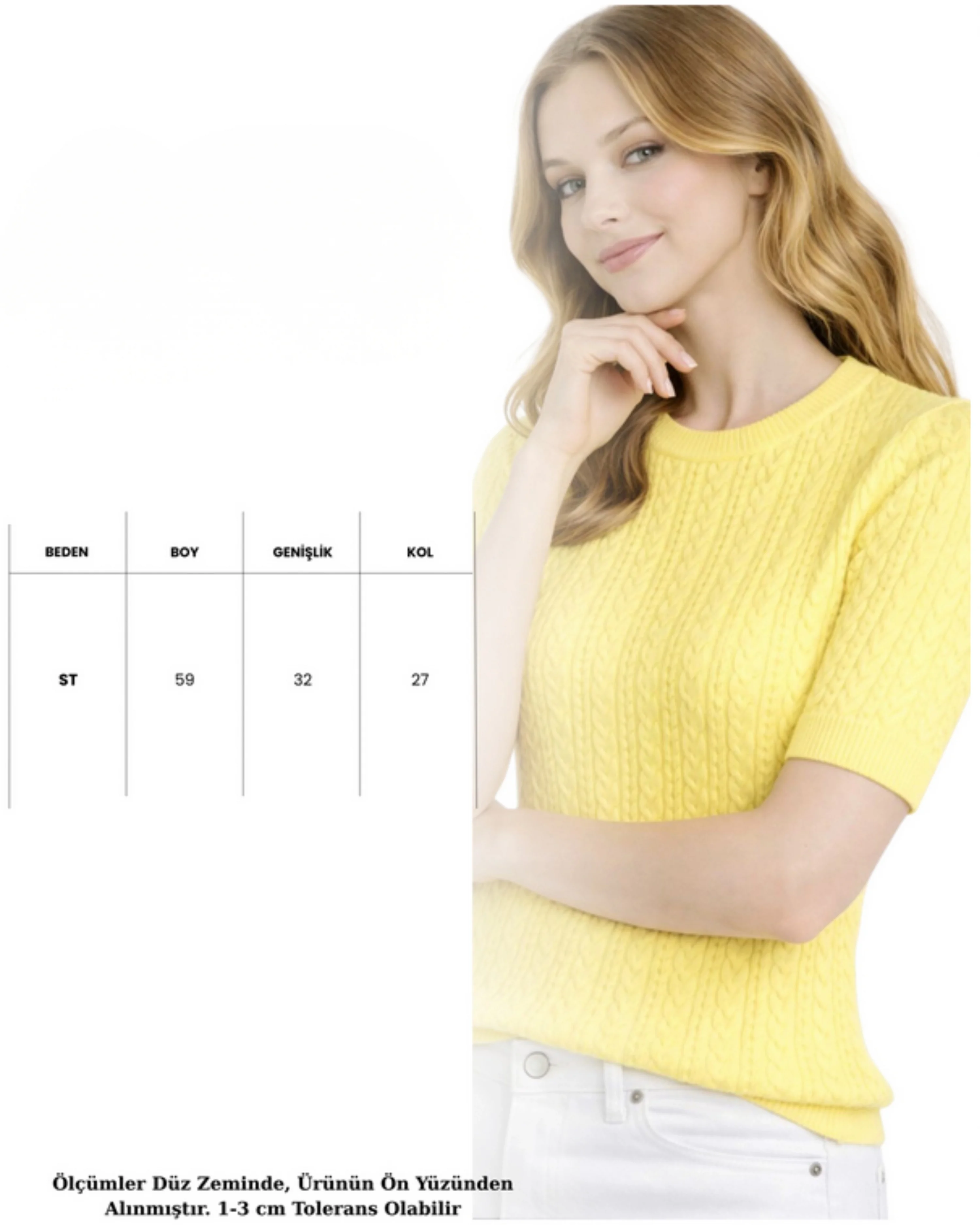 Güneşin sıcaklığını ve yazın en neşeli enerjisini gardırobunuza taşıyın... Bu kısa kollu sarı triko bluz, yumuşacık örme dokusu ve kendinden klasik saç örgü deseniyle hem ofiste hem de günlük hayatta ferah ve şık bir duruş sergiliyor. Mevsim geçişlerinin ve serin yaz akşamlarının tartışmasız en favori kurtarıcı parçası olmaya aday.