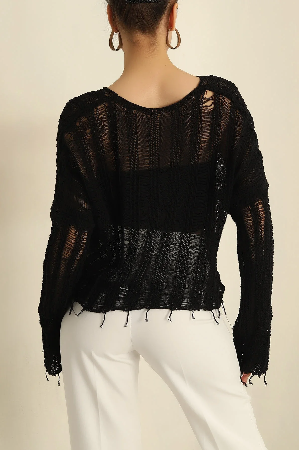 Sokak modasının asi ruhunu gardırobunuza taşıyın! Bu siyah ajurlu örme bluz, yırtık doku detayları ve salaş kesimiyle çabasız bir şıklık sunuyor. Etek ucundaki ince püsküller ve modern grunge tarzı, iddiasını ortaya koyan kadınlar için tasarlandı.