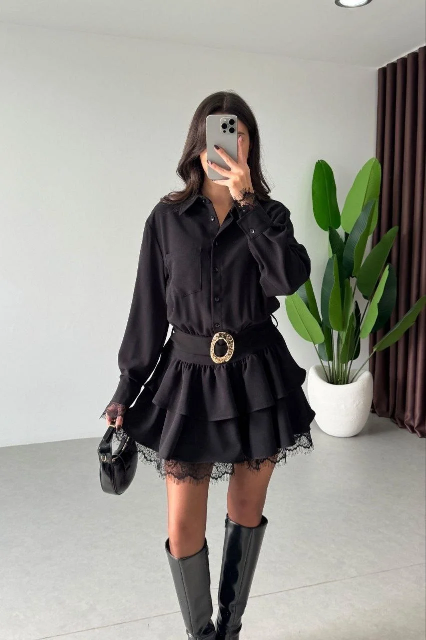 Siyahın asil ve gizemli gücü... İkili takım illüzyonu yaratan bu siyah gömlek yaka elbise, "Coquette" trendinin romantik detaylarını siyahın zamansız şıklığıyla buluşturuyor. Tek parça giy-çık rahatlığını, koldan ve etek ucundan süzülen siyah dantel detayları ile birleştirerek size adeta iddialı bir Paris zarafeti sunuyor. Elbiseye dahil olan tokalı kemeri ise kombinin altın vuruşunu yapıyor.