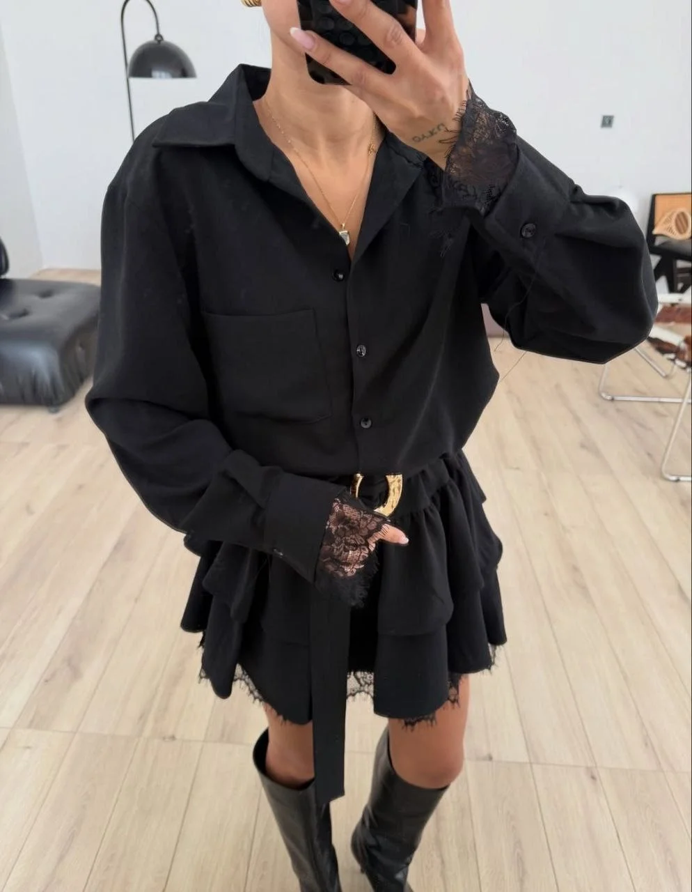 Siyah Dantel Zarafeti: Gömlek manşetlerinden ve eteğin altından zarifçe görünen siyah dantel (güpür) detayları, dökümlü siyah kumaşla birleşerek tasarıma sofistike ve lüks bir derinlik katar.