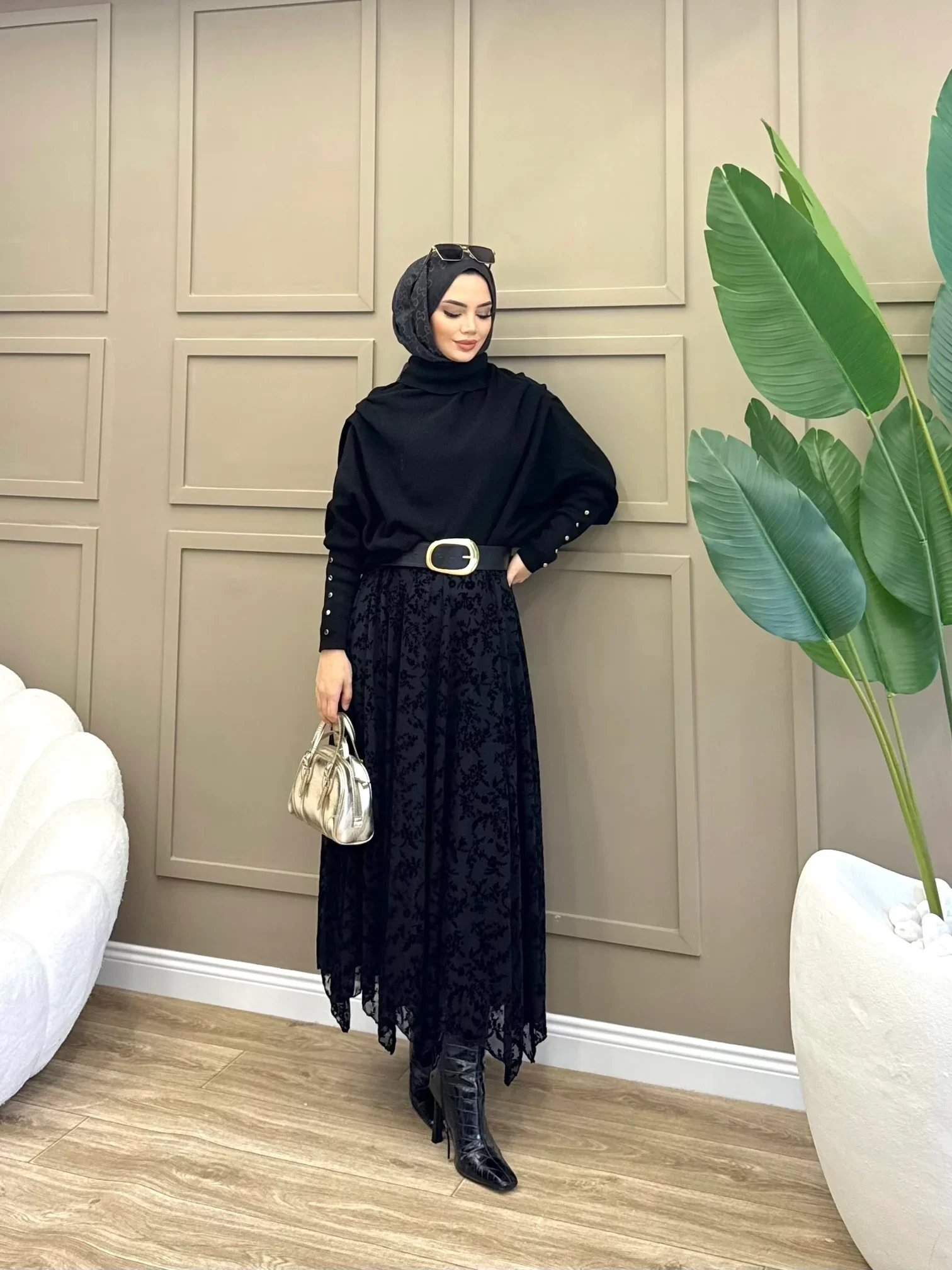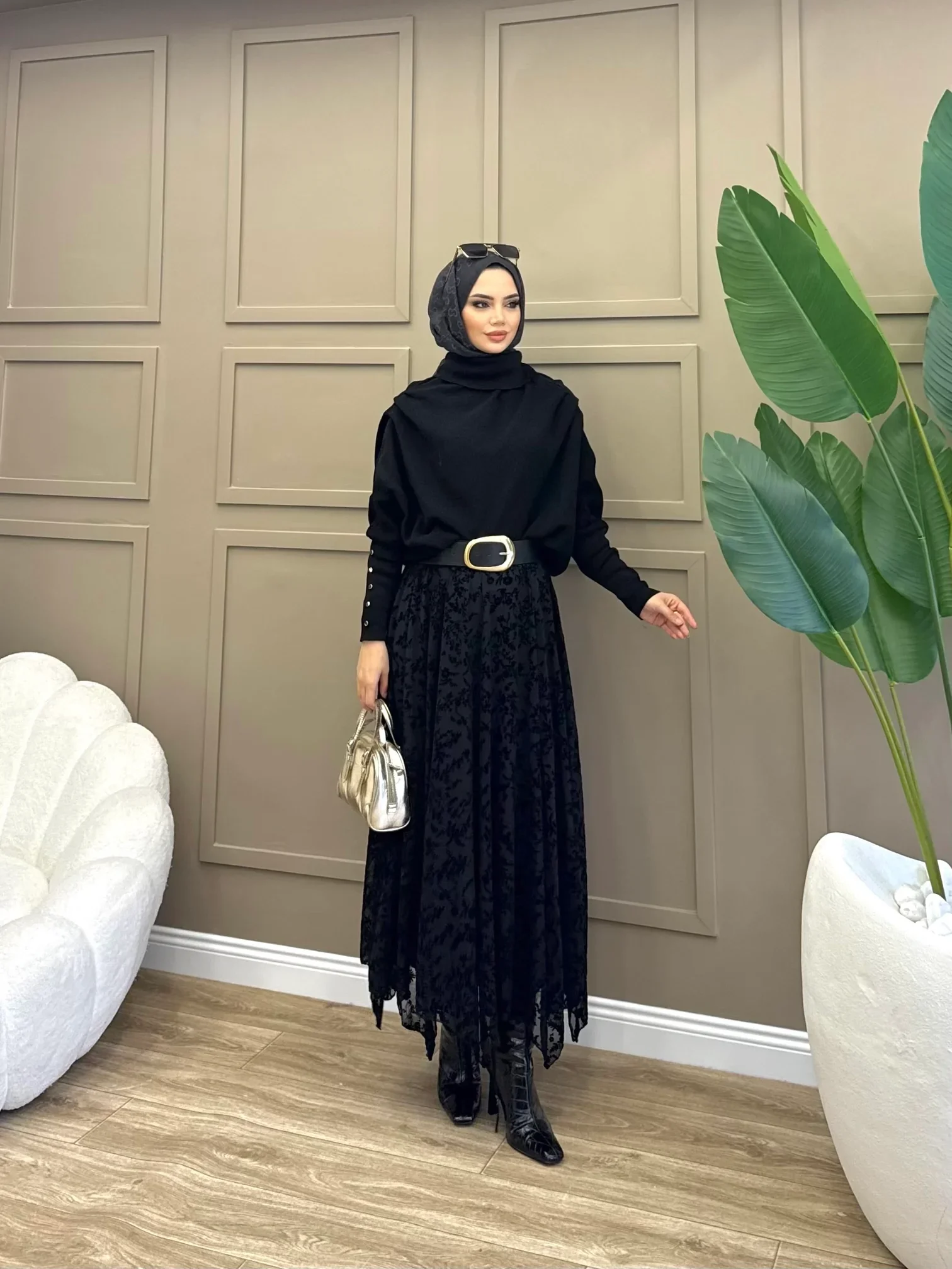 Kadife Dokulu Desenler: Tül zemin üzerine işlenen siyah flok (kadife tozu) baskılar, eteğe üç boyutlu bir derinlik ve lüks bir hissiyat kazandırır.