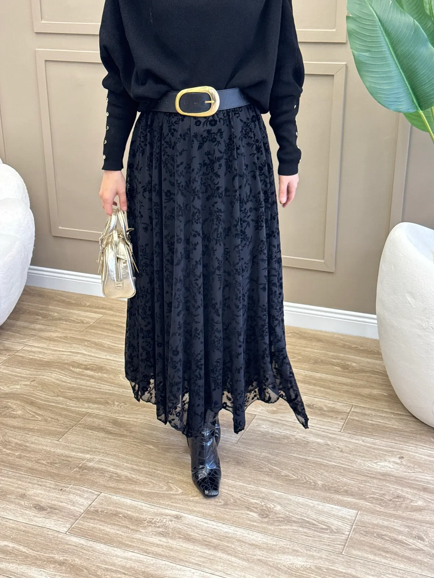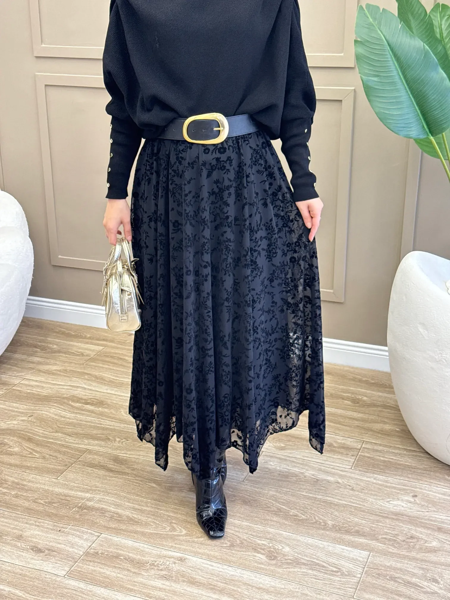 Masalsı bir dokunuş... Bu siyah flok baskılı tül etek, üzerindeki kadife dokulu çiçek desenleriyle (flok baskı) hareket kazanan, büyüleyici bir tasarıma sahip. Yürürken süzülen hafif yapısı ve tam boy astarı ile hem konforlu hem de son derece şık bir kullanım sunar. Asimetrik kesimli etek uçları, kombininize modern ve dinamik bir hava katar.