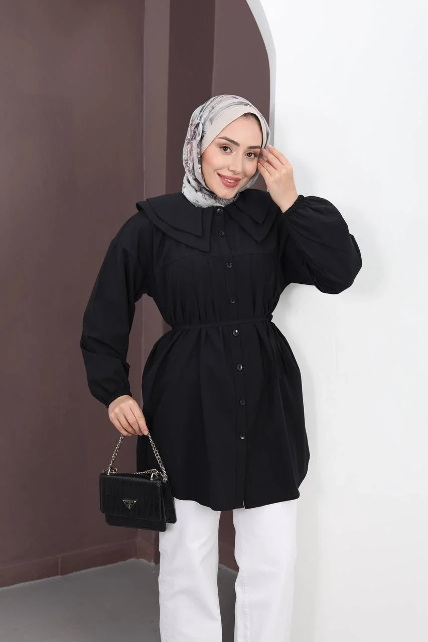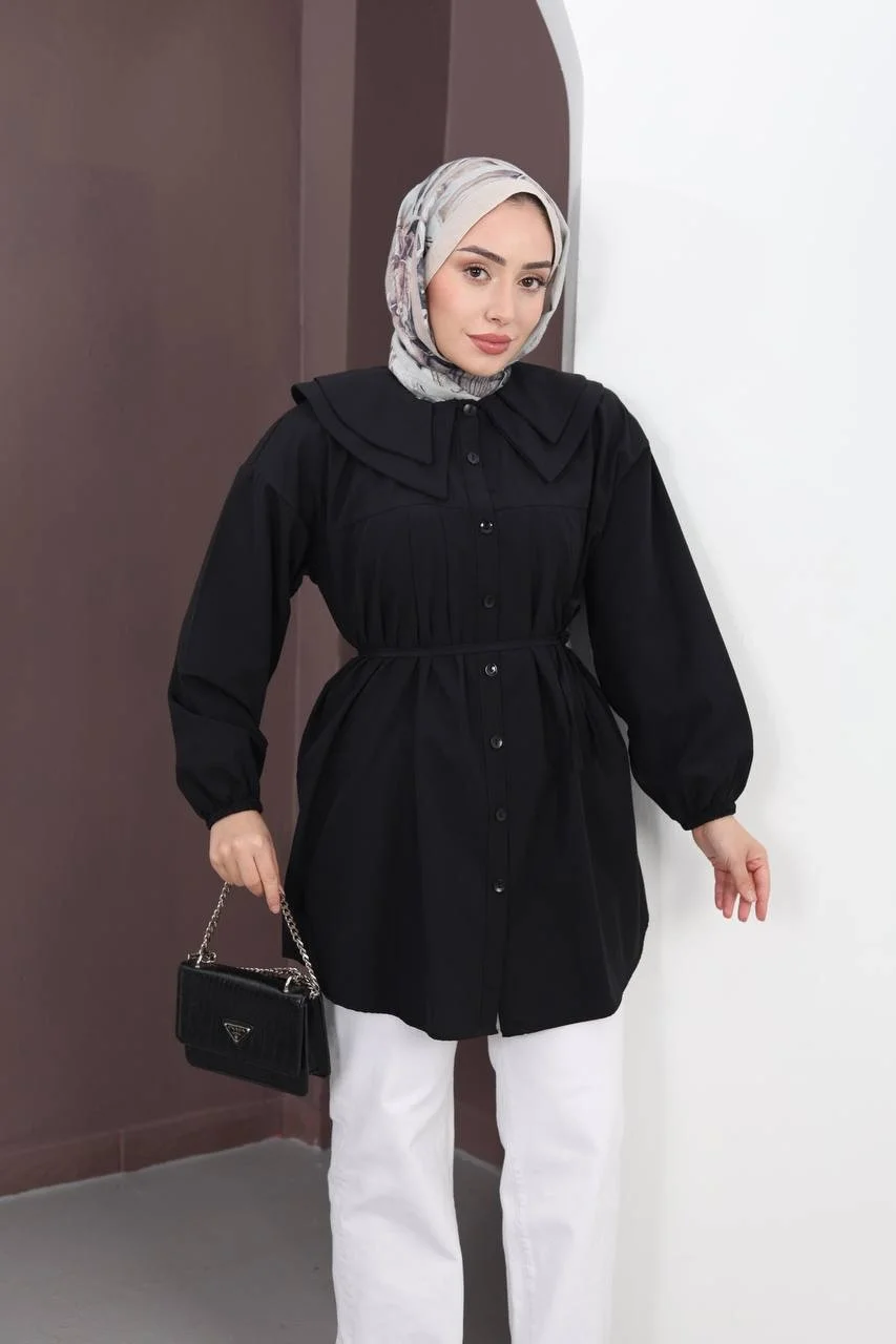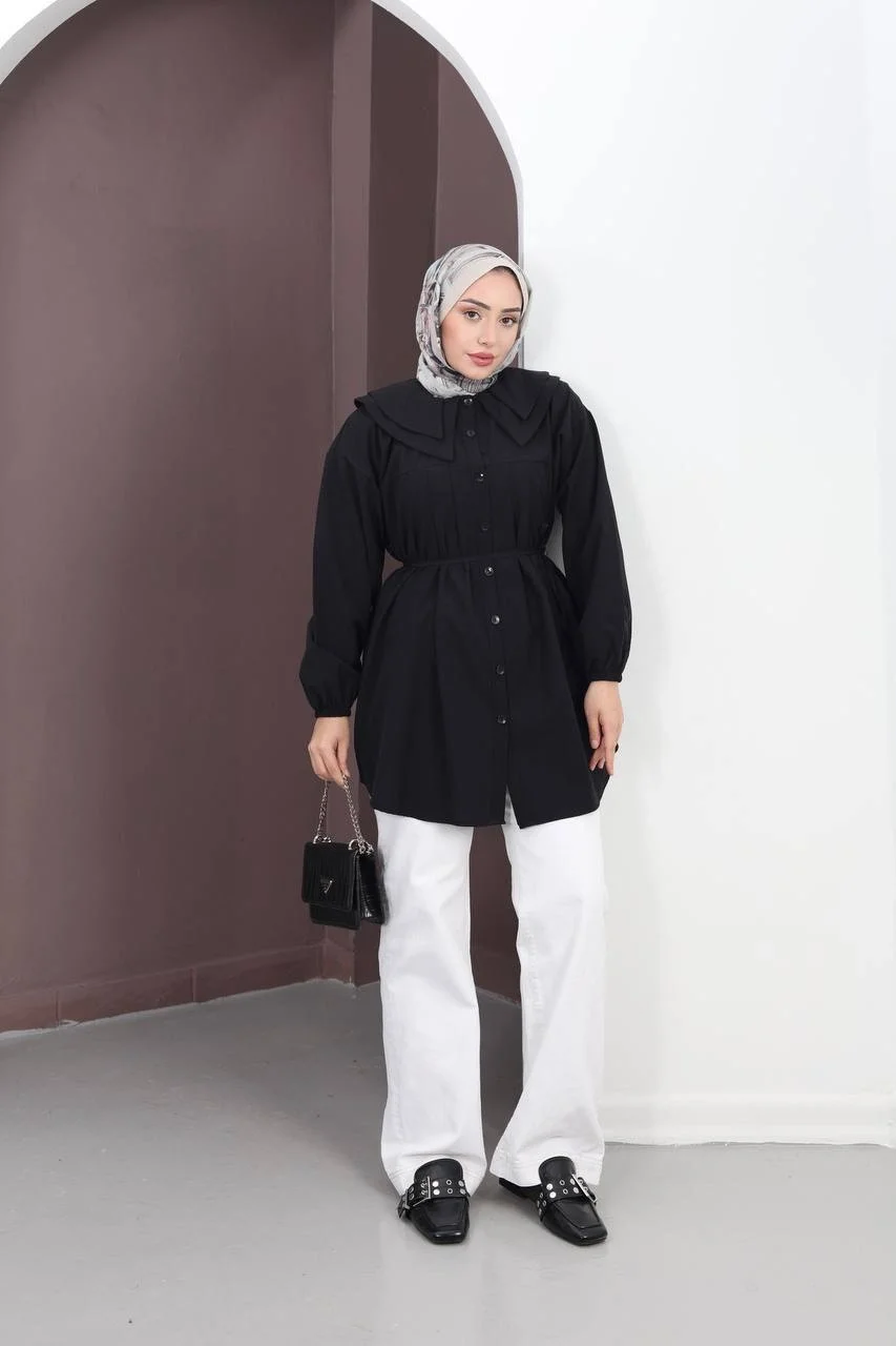 Bu çok yönlü siyah tuniği, baştan aşağı siyah (monokrom) giyinerek asil bir görünüm elde edebilirsiniz. Kontrast yaratmak isterseniz bej veya beyaz bol paça pantolonlarla tamamlayabilir, gümüş veya inci detaylı aksesuarlarla gece şıklığına taşıyabilirsiniz.