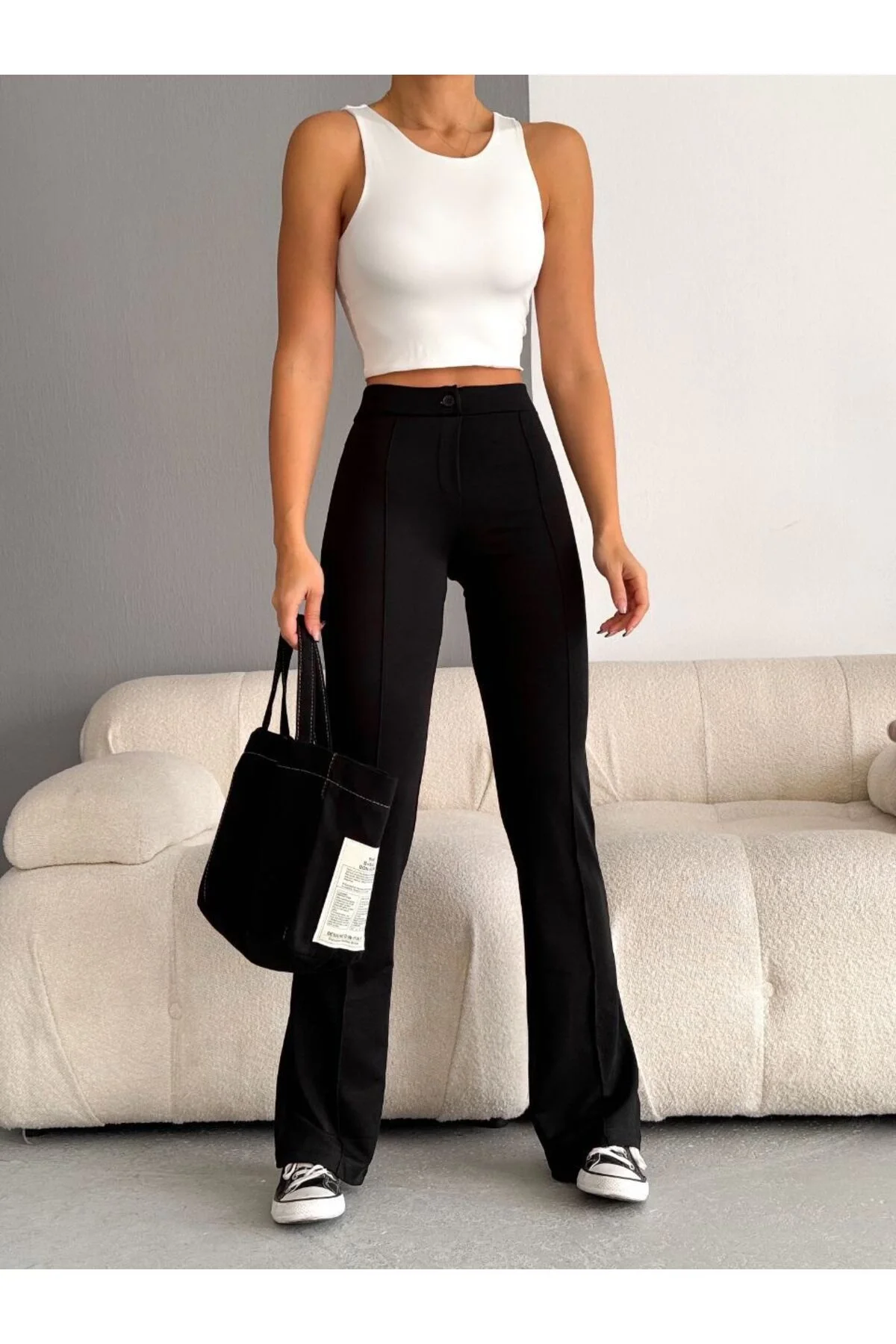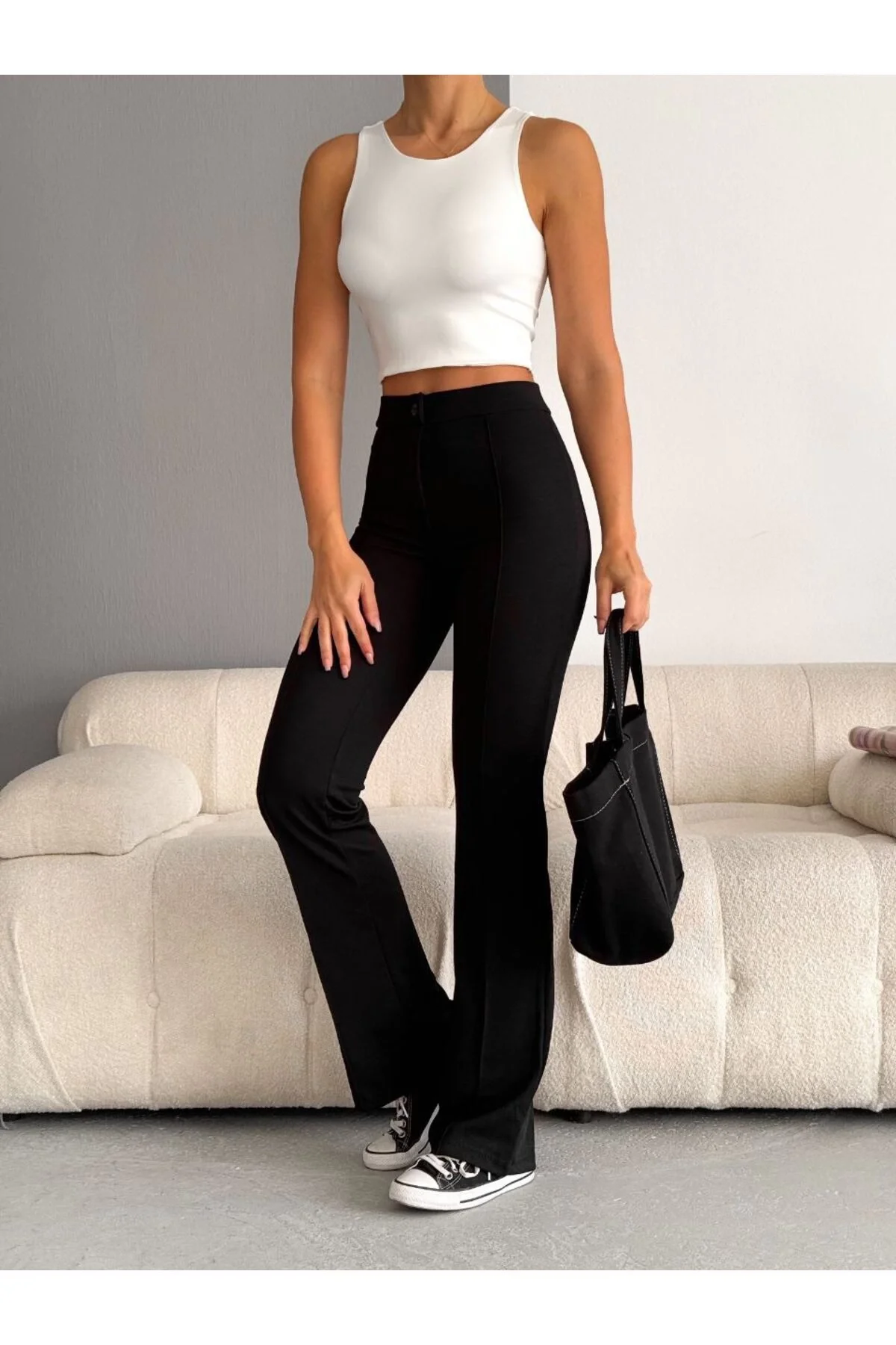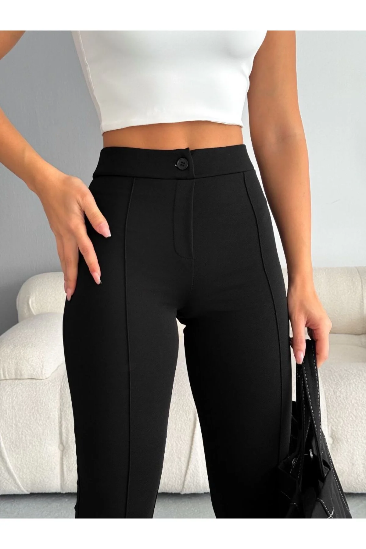 Kadın Yüksek Bel Önü Dikişli İspanyol Paça Vücudu Saran Krep Kumaş Pantolon - Siyah