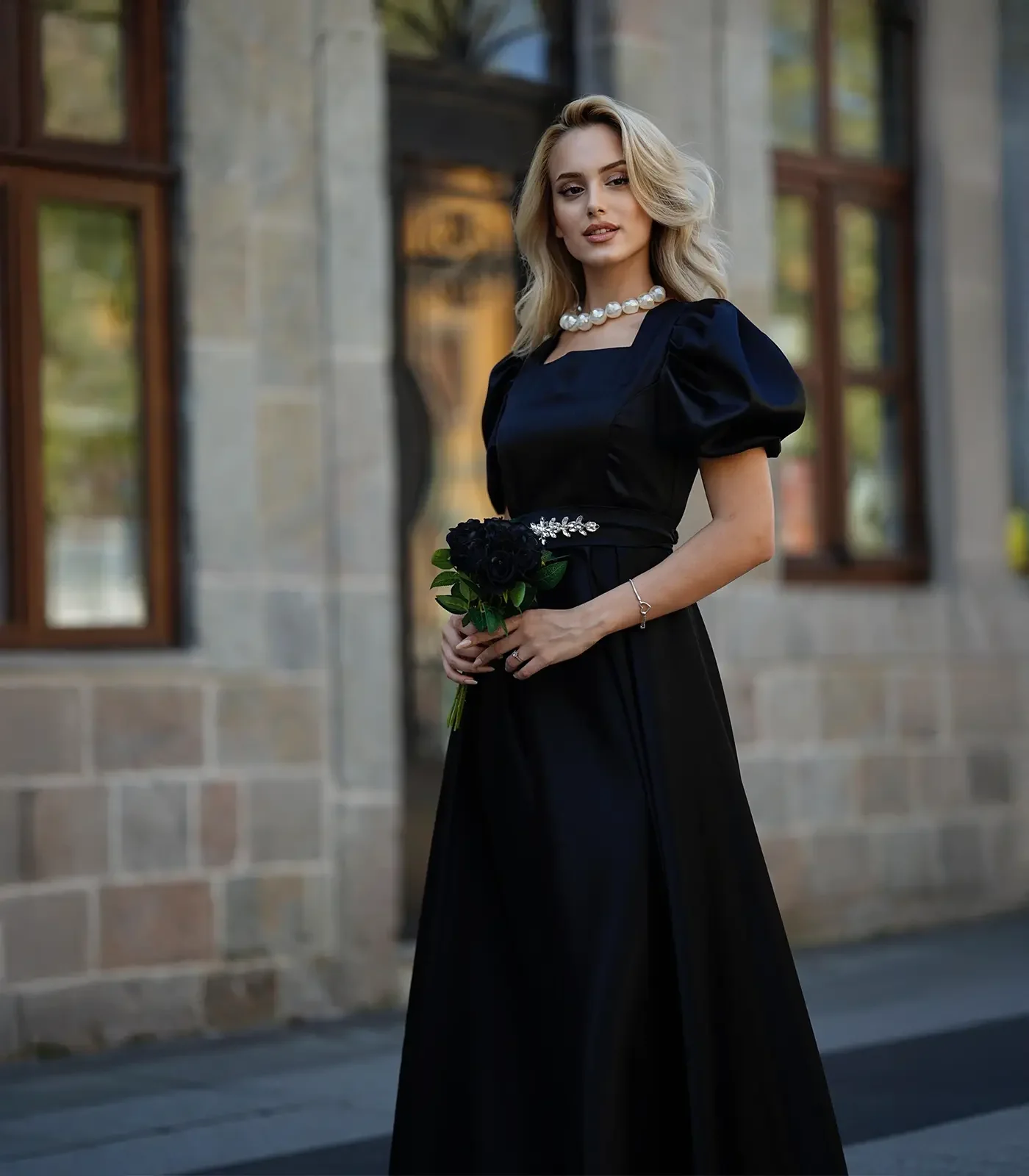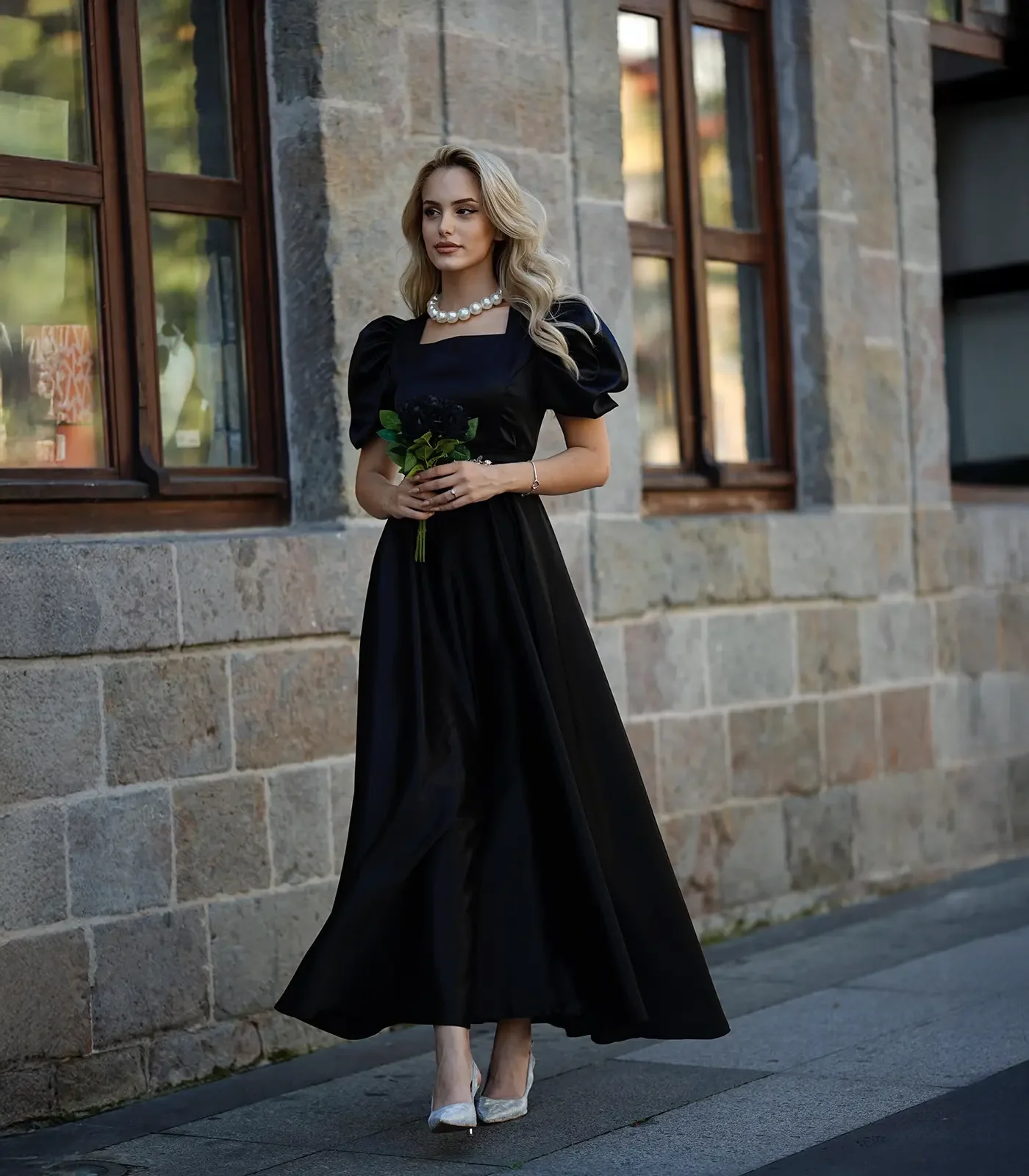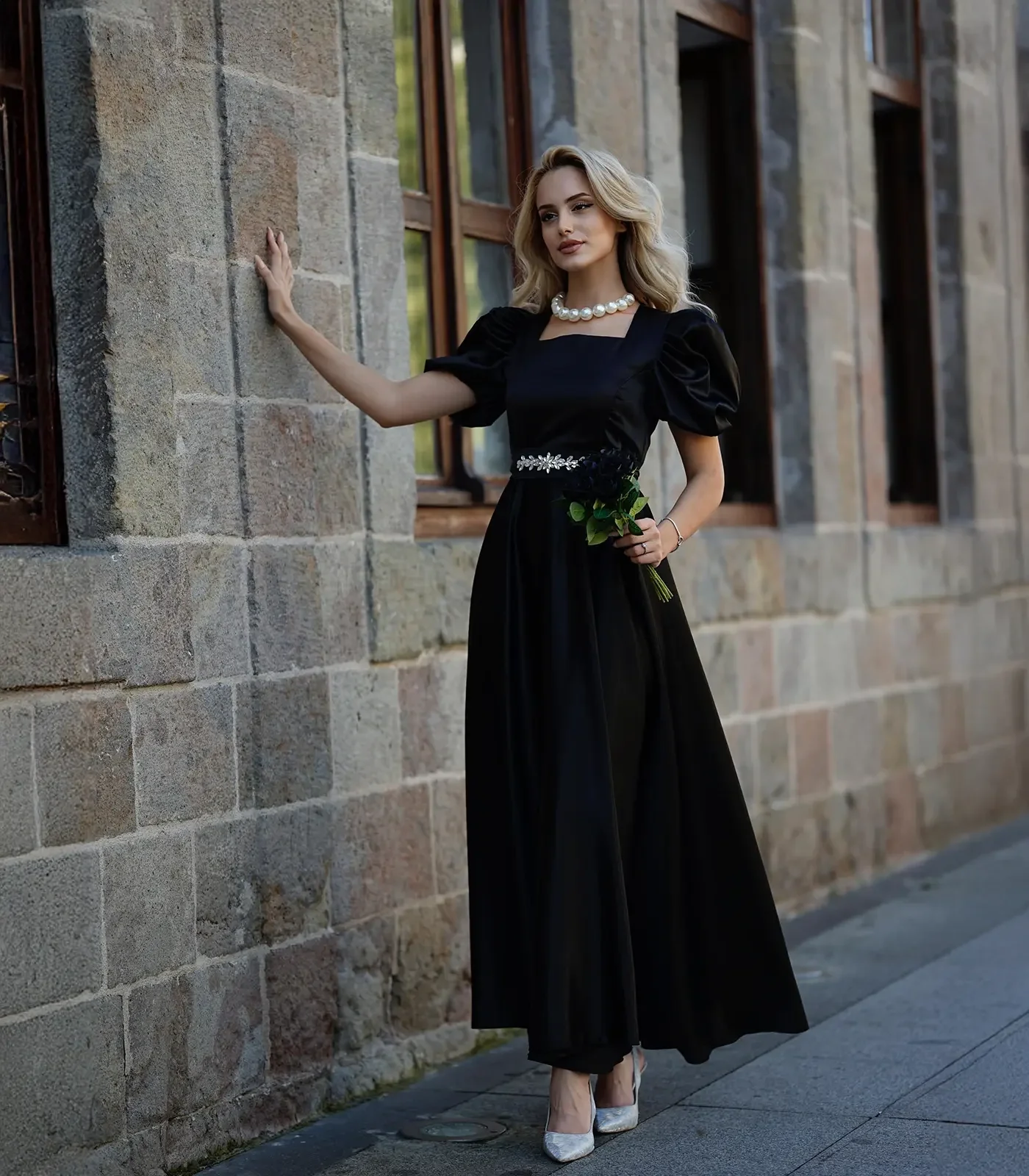 Siyahın vazgeçilmez asaleti ve zarafetin en saf haliyle tanışın... Bu büyüleyici siyah saten elbise, "Royal" (Kraliyet) tarzının sofistike detaylarını geceye taşıyor. Kare yakanın boynu uzun gösteren etkisi, omuzlara nostaljik bir hacim katan karpuz kolları ve belinizi bir mücevher gibi saran taşlı kemeriyle, özel davetlerin kusursuz kadını olacaksınız.
