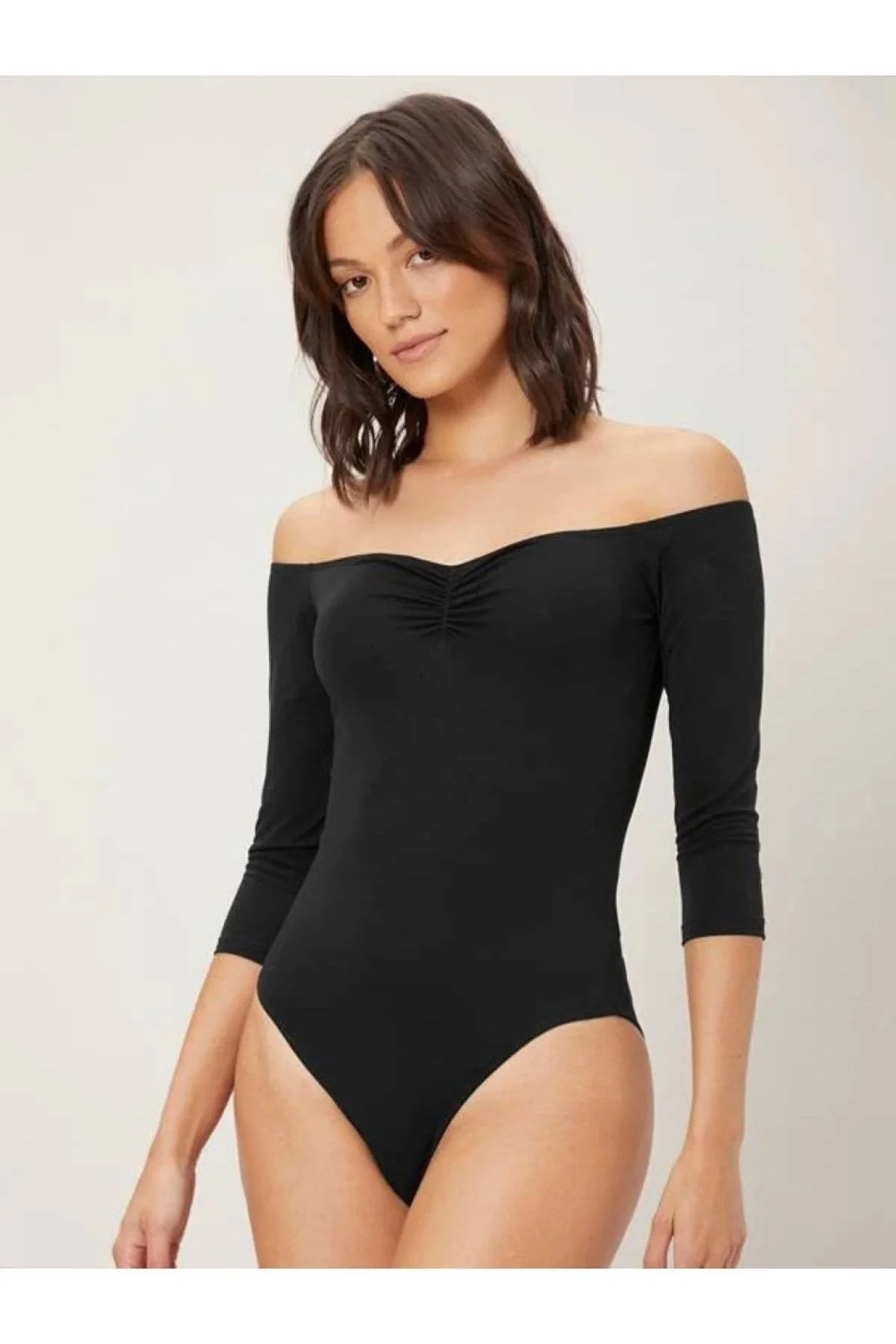 Omuzların zarafetini ön plana çıkaran **çift katlı sandy kumaş siyah madonna yaka bodysuit**. Feminen duruşu ve normal (slip) kesim konforuyla birleştiren bu parça, çıtçıtlı yapısı sayesinde gün boyu sabit ve pürüzsüz bir görünüm sağlar.
