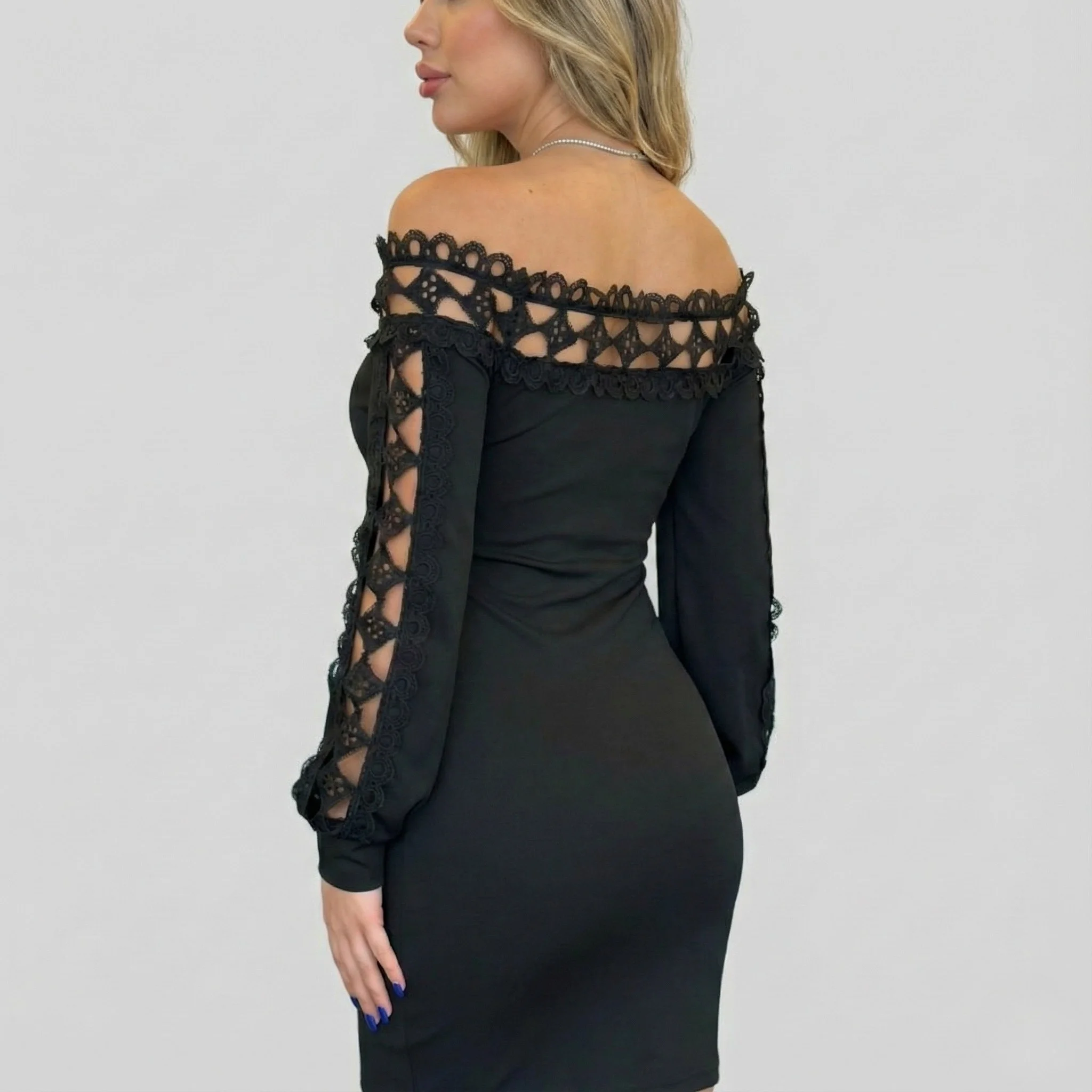 Bu siyah dantel detaylı elbise, gecenin yıldızı olmanız için yeterli. Onu şık bir stiletto veya topuklu sandalet, ışıltılı bir clutch çanta ve zarif takılarla tamamlayarak unutulmaz bir gece stili yaratın.