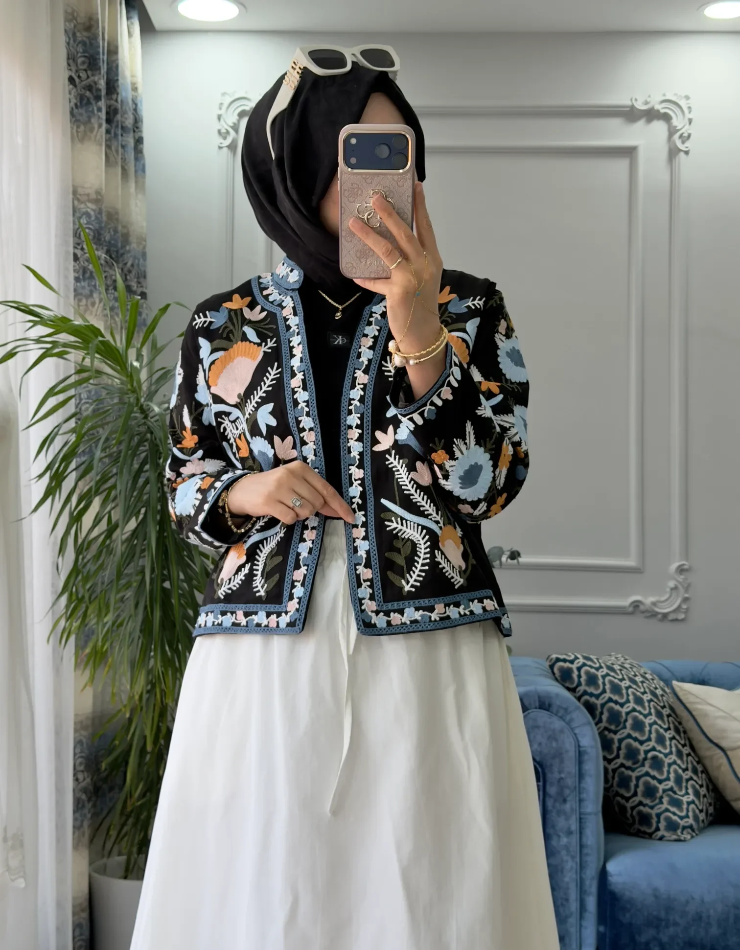Gardırobunuza renkli bir sanat eseri ekleyin... Bu özel tasarım siyah nakışlı kot ceket, koyu renk denim zemin üzerinde patlayan mavi, hardal ve pembe çiçek işlemeleriyle enerjinizi yükseltiyor. Geleneksel el işçiliğini modern sokak stiliyle harmanlayan bu parça, yakasız kesimi ve zarif biyeleriyle hem şık hem de bohem bir duruş sergiliyor.