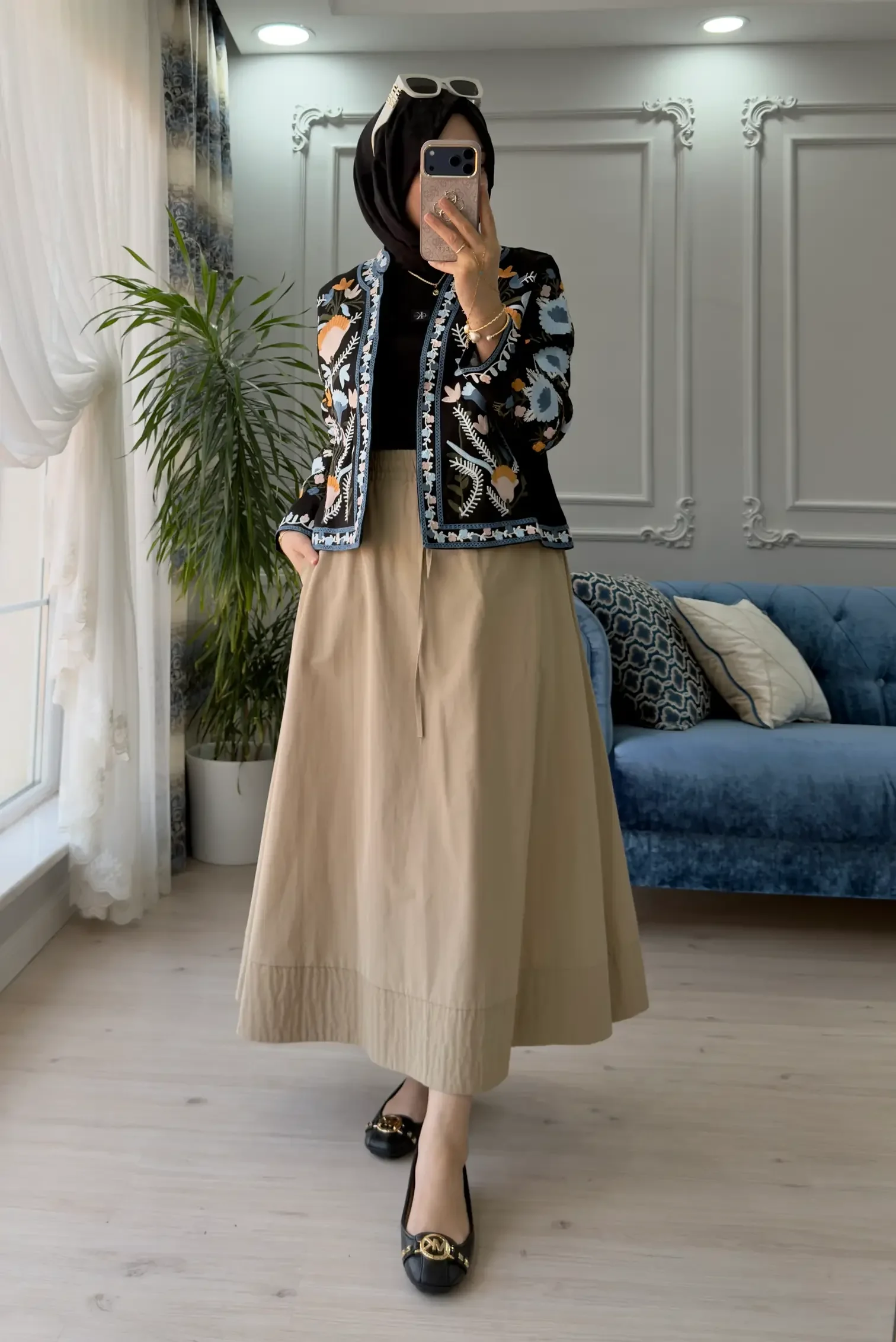 Bu rengarenk kot ceketi, görseldeki gibi açık renk (buz mavisi) jean pantolonlarla kombinleyerek nakışların renklerini ortaya çıkarabilirsiniz. İçine düz beyaz bir atlet giyip, altınıza hardal veya kiremit rengi bir pantolon çekerek nakışlardaki tonları yakalayabilirsiniz.