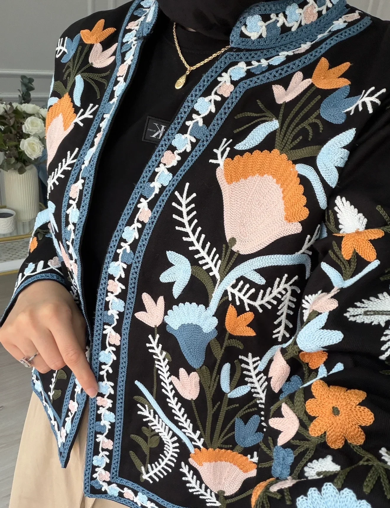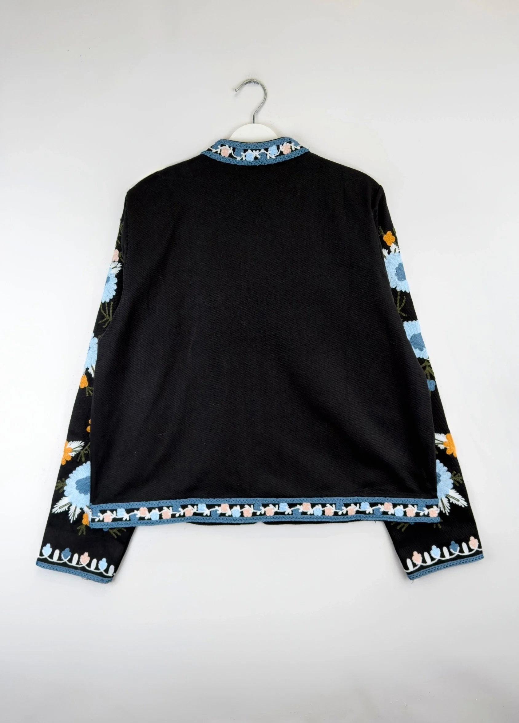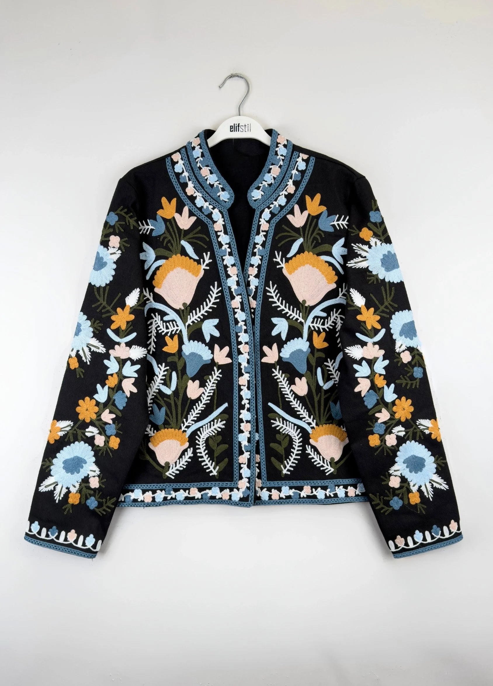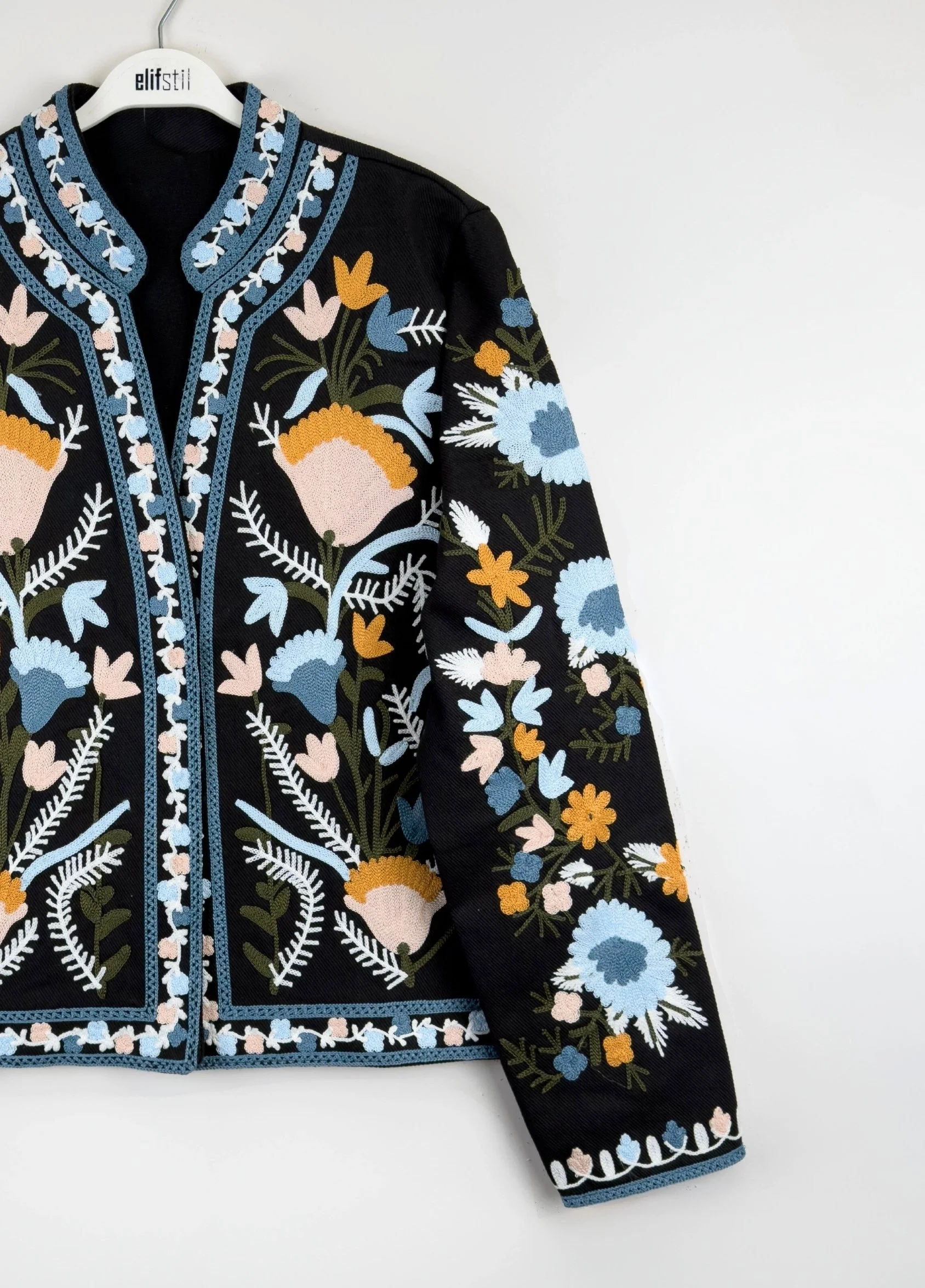 Canlı Renk Paleti: Koyu zemin üzerindeki pastel ve canlı renkli nakışlar, ceketi her renk alt giyimle kolayca kombinlenebilir hale getirir.