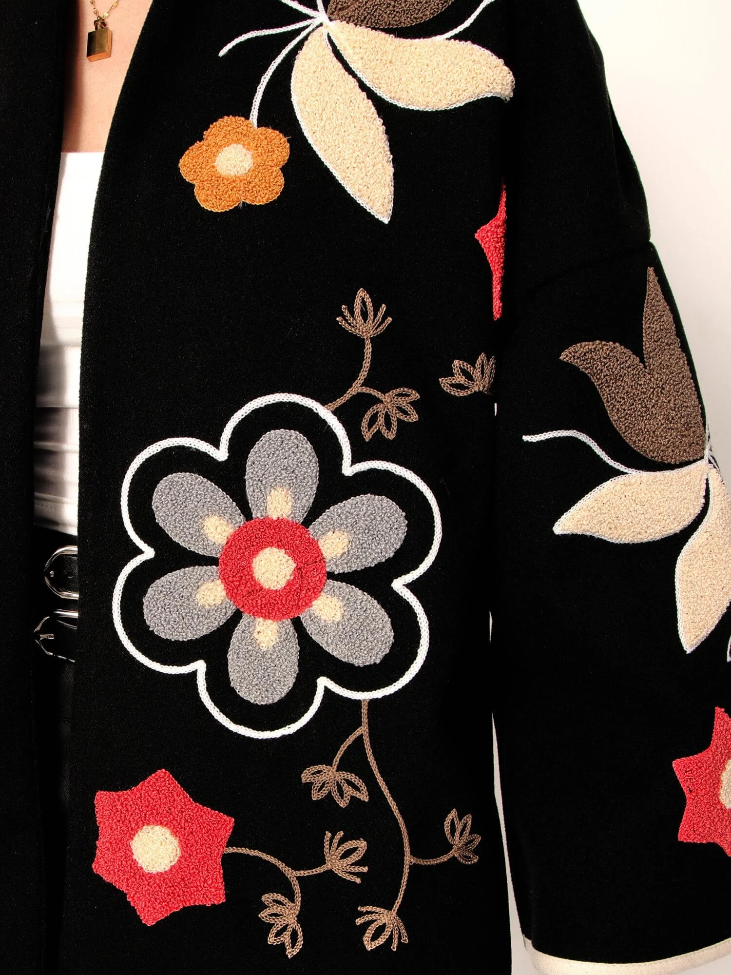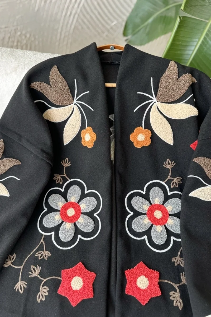 Sanatın ve konforun siyahla buluşması... Bu çarpıcı siyah kaşe ceket, koyu zemin üzerinde adeta parlayan krem, kiremit ve hardal renkli çiçek nakışlarıyla kış stilinize canlılık katıyor. Geniş kimono kolları ve kol uçlarındaki kontrast krem rengi biye detayları, tasarıma modern ve sofistike bir çerçeve çiziyor.