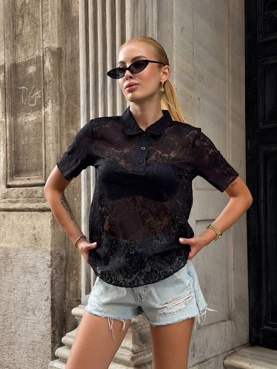 Cesur, dinamik ve kesinlikle çok havalı! Sokak stilinize seviye atlatacak bu transparan siyah dantel bluz, feminen dantel dokusunu maskülen polo yaka detayıyla birleştirerek mükemmel bir tezatlık yaratıyor. İçine giyeceğiniz braletler veya büstiyerlerle kendi tarzınızı baştan yaratabileceğiniz bu "katmanlama" (layering) parçası, gardırobunuzun en iddialı oyuncusu olacak.