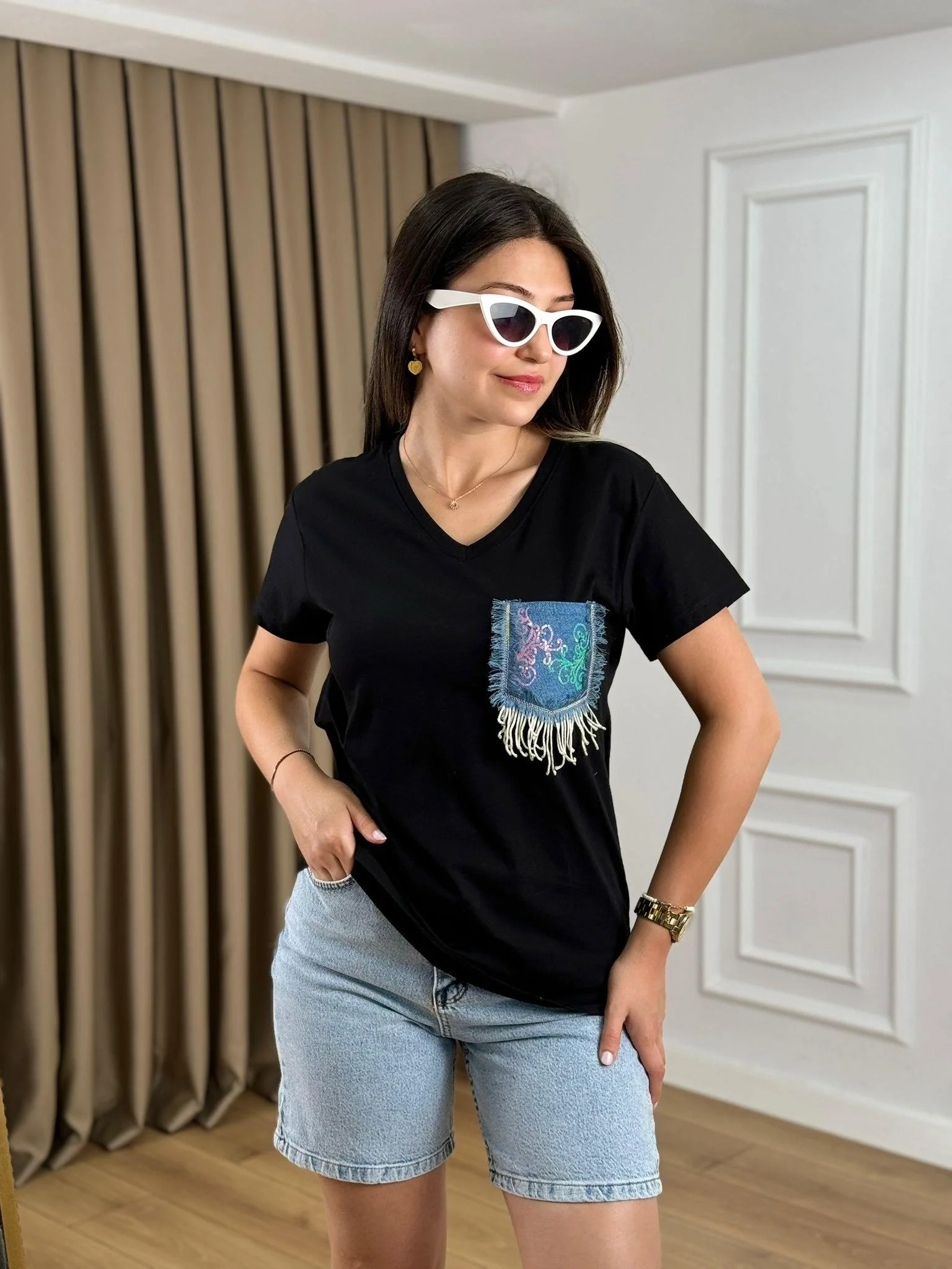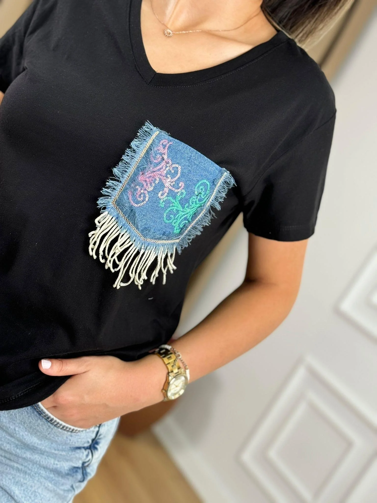 Sıradan tişörtlerin ötesine geçin! Bu siyah pamuklu v yaka tişört, göğüs kısmındaki buz mavisi denim cep detayıyla kontrast oluştururken, cep üzerindeki renkli payet işlemeleri ve sarkık püskülleriyle bohem-şık bir tarz sunuyor. %100 pamuk dokusuyla konforu, özgün tasarımıyla iddiayı bir arada yaşayın.