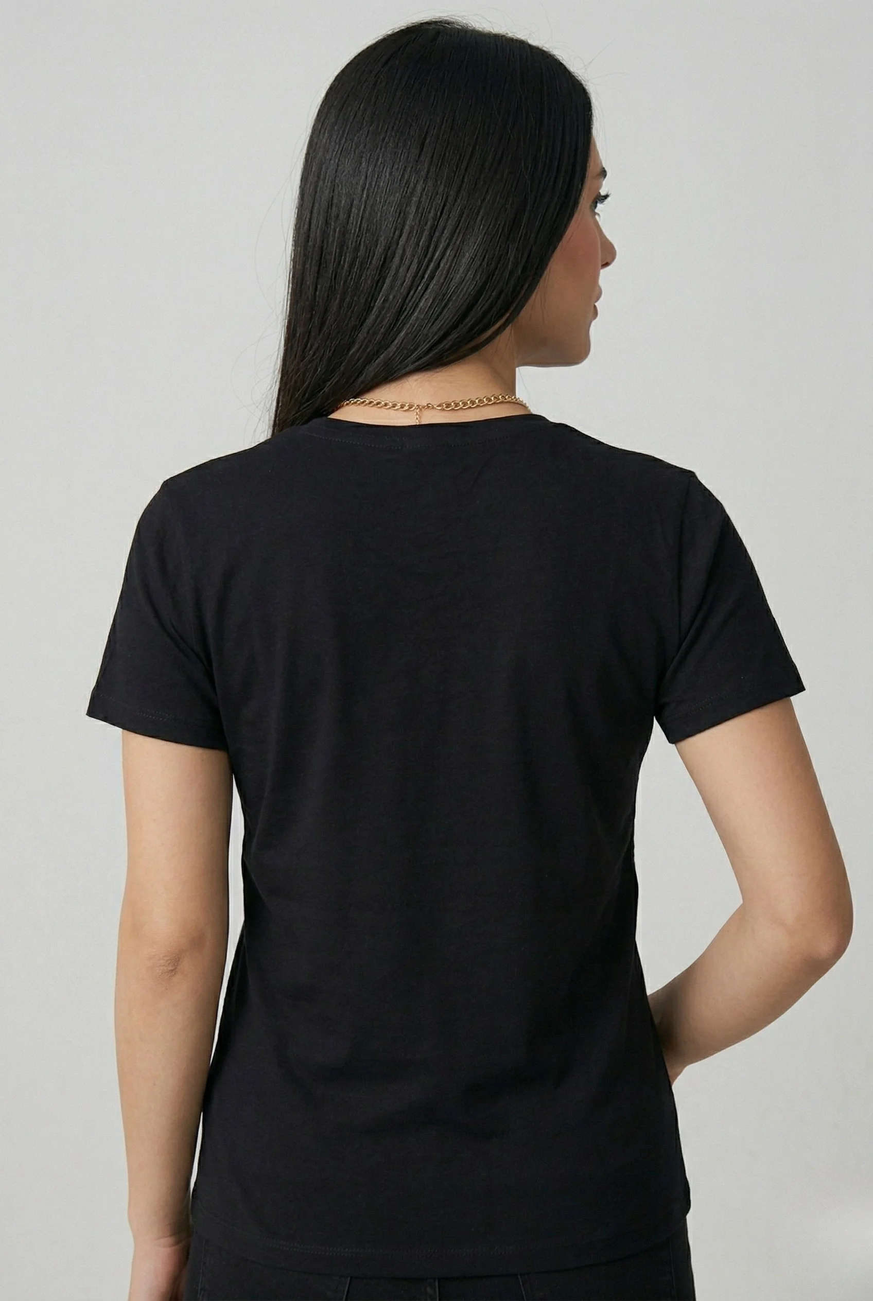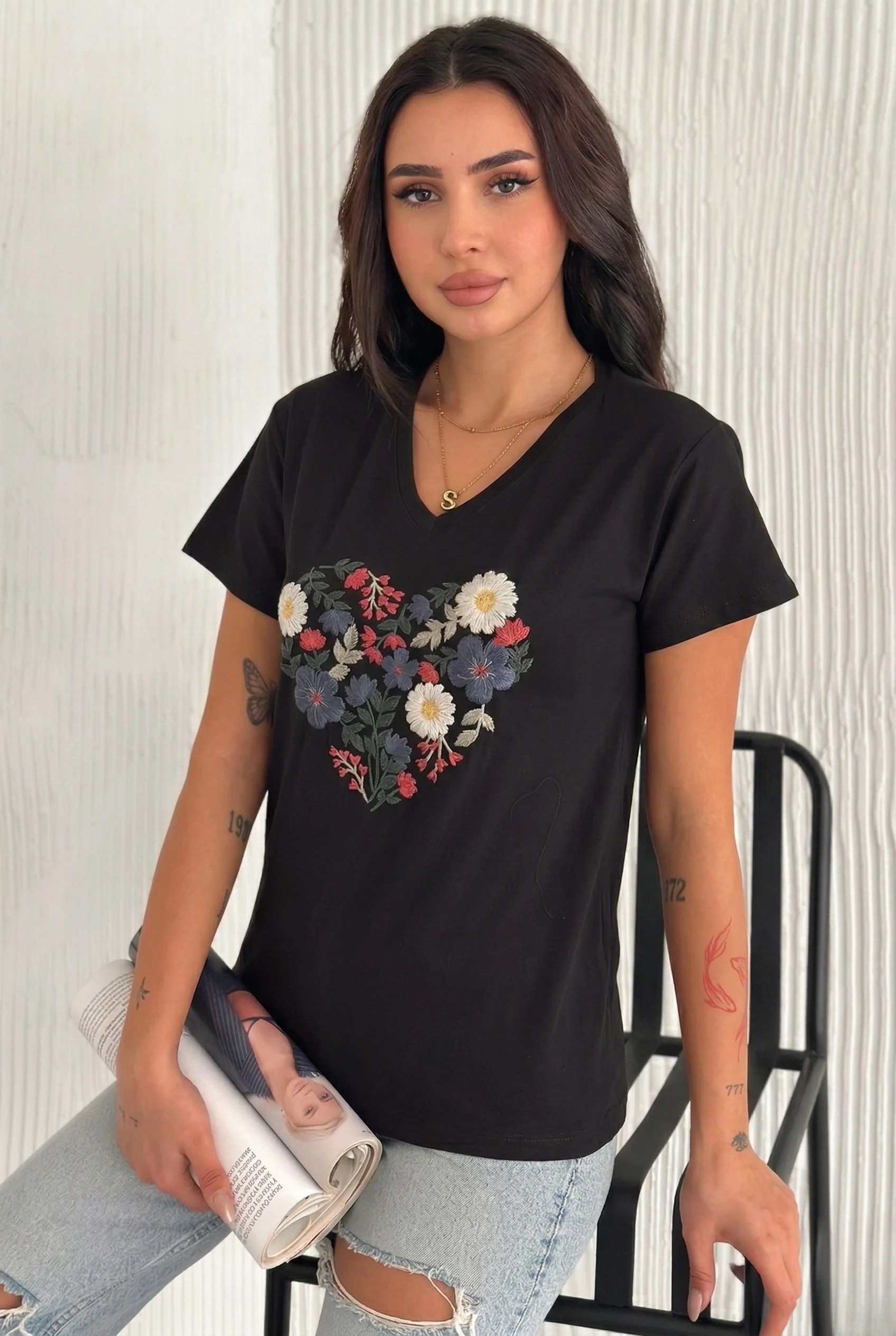 Sevginin en estetik hali nakışla buluştu! Bu siyah pamuklu V yaka tişört, göğüs kısmındaki kalp formuna getirilmiş rengarenk çiçek nakışlarıyla baharı stilinize taşıyor. %100 pamuklu kumaşın doğal yumuşaklığı ve canlı işleme detayları, gün boyu hem konforlu hem de şık hissetmenizi sağlayacak.