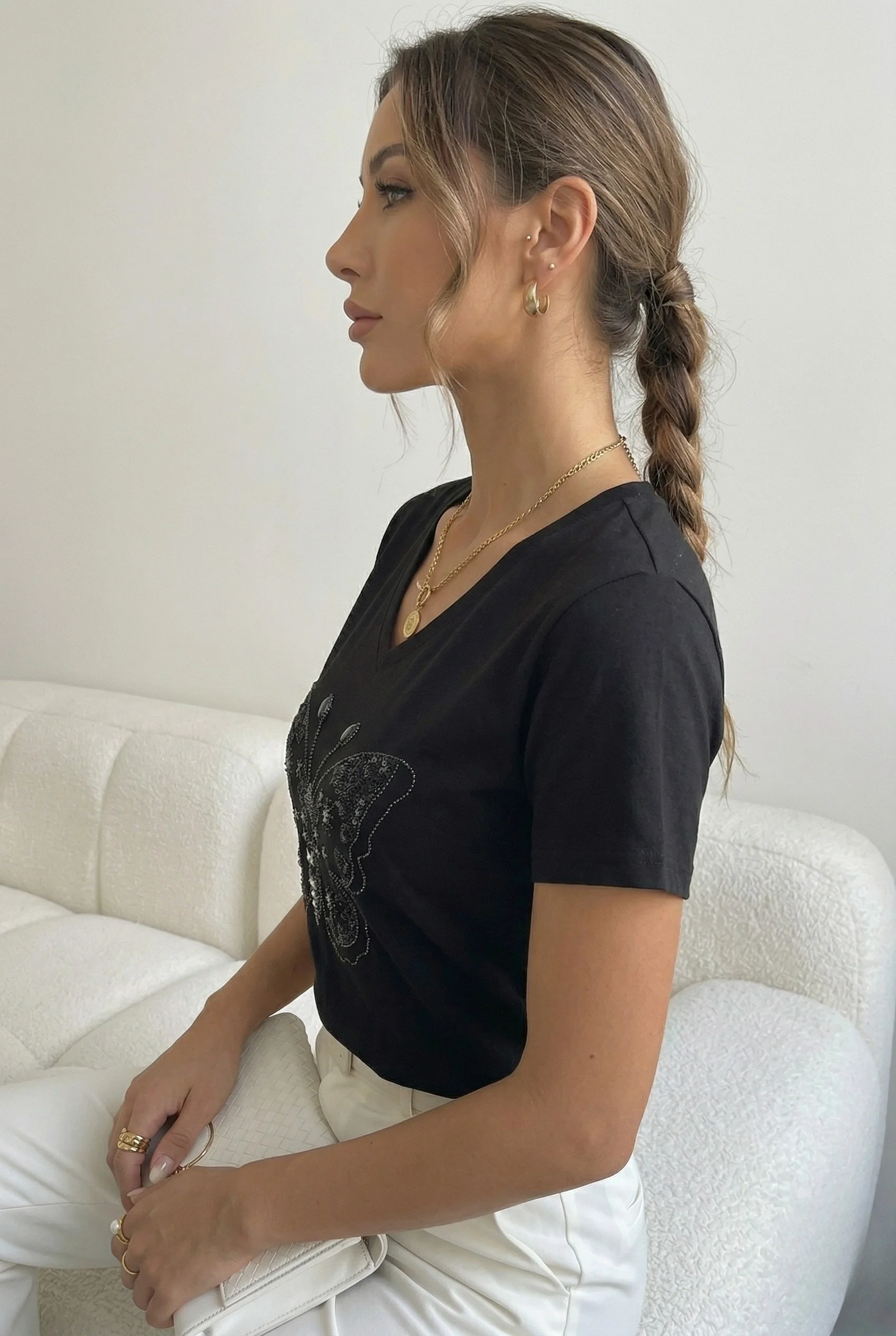 Bu özel tasarım kelebek işlemeli siyah tişörtü, beyaz bir jean veya kumaş pantolonla kombinleyerek işlemelerin kontrastını vurgulayabilirsiniz. Gold veya gümüş takılar ve şık bir portföy çanta ile akşam buluşmalarının yıldızı olun.