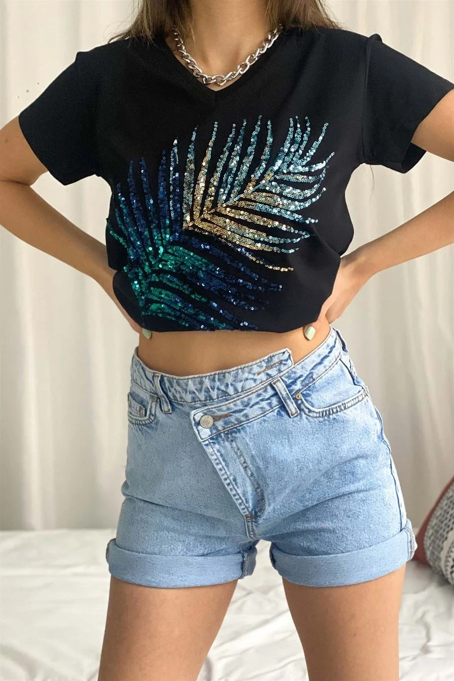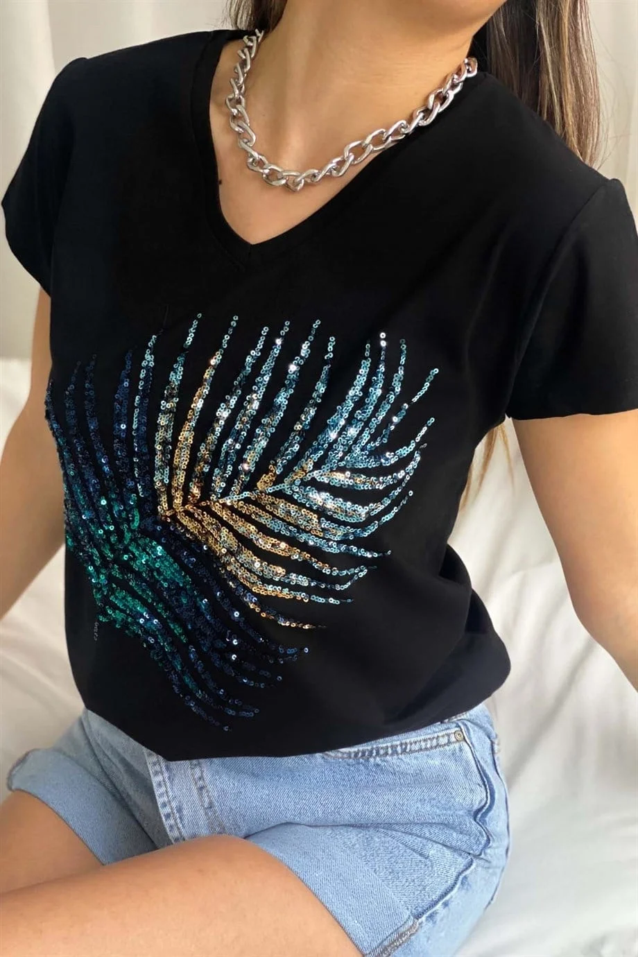Bu tasarım siyah tişörtü, siyah dar bir jean ve topuklu ayakkabılarla tamamlayarak şık bir akşam görünümü elde edebilirsiniz. Günlük kullanımda ise açık renk denim şortlar ve metalik aksesuarlarla payetlerin ışıltısını destekleyerek stilinizi parlatın.