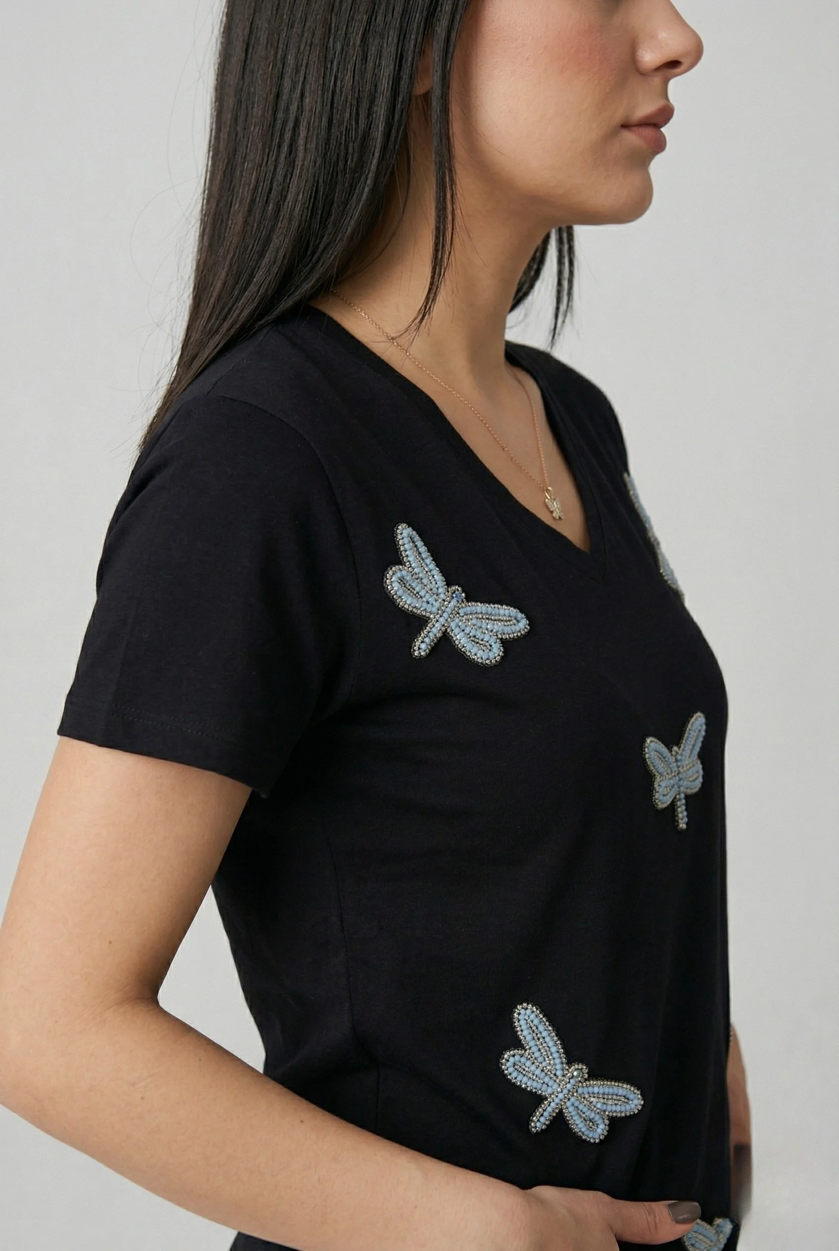 Doğanın en zarif sembollerinden biri olan yusufçuk, şimdi stilinize ışıltı katıyor! Bu siyah %100 pamuklu tişört, gövde üzerine serpiştirilmiş mavi boncuk işlemeli yusufçuk figürleriyle hem modern hem de sofistike bir duruş sunuyor. Her bir figürün özenle işlendiği bu parça, günlük şıklığınıza butik bir dokunuş eklemek için tasarlandı.