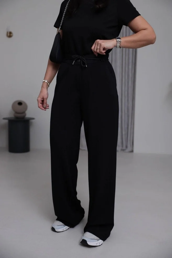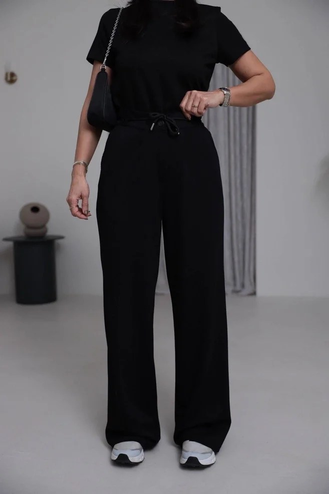 Siyahın Gücü ve Akışkanlık: Siyah rengin zarafeti, dökümlü bol paça kesimle birleşerek olduğunuzdan daha ince ve uzun bir silüet yaratır.