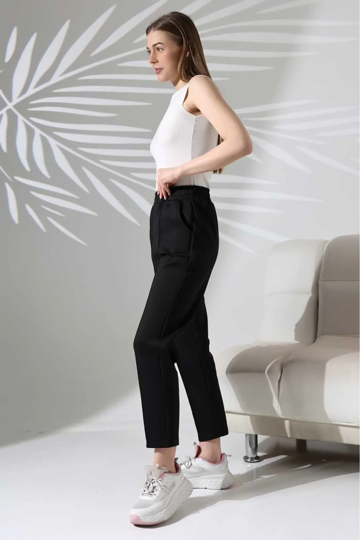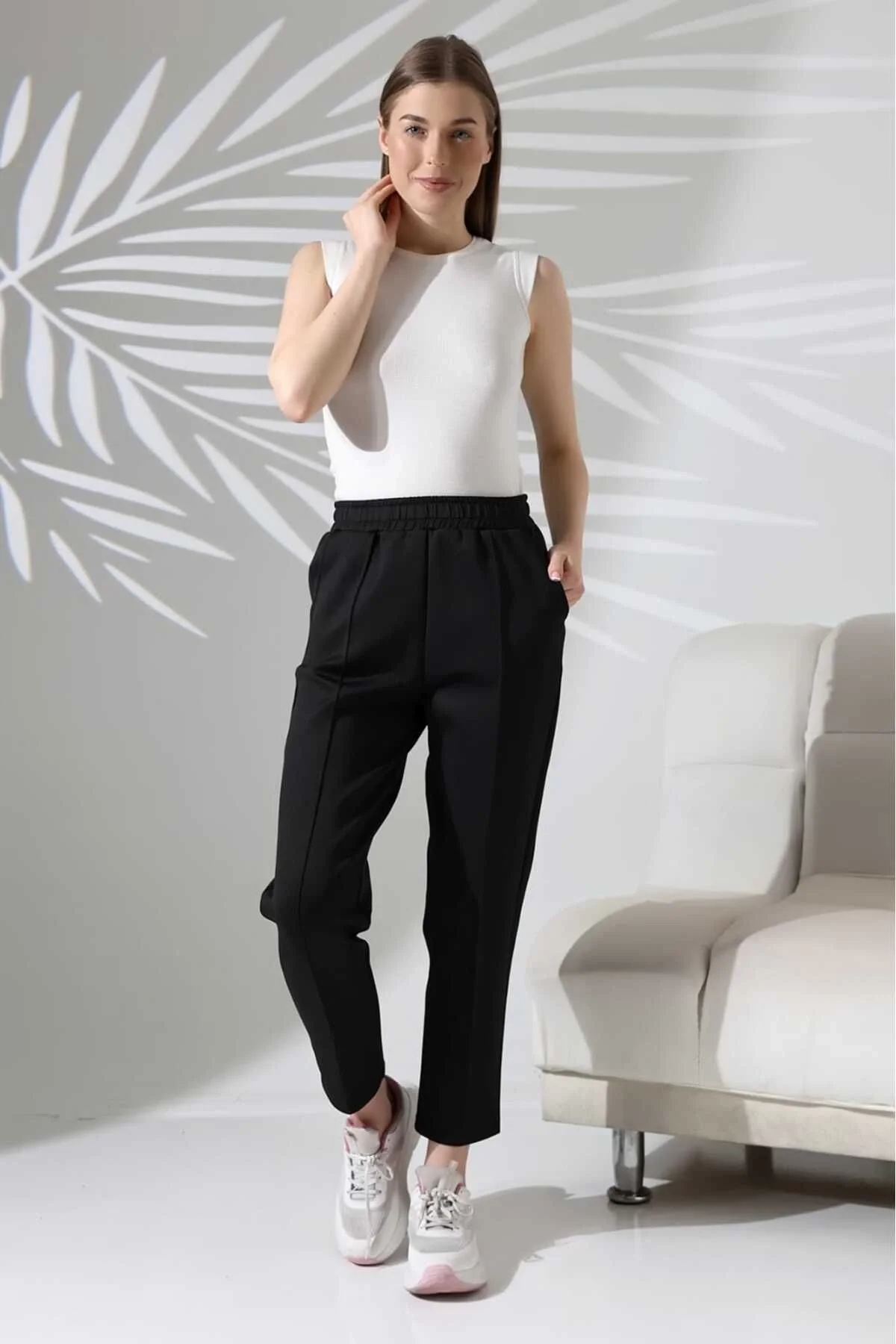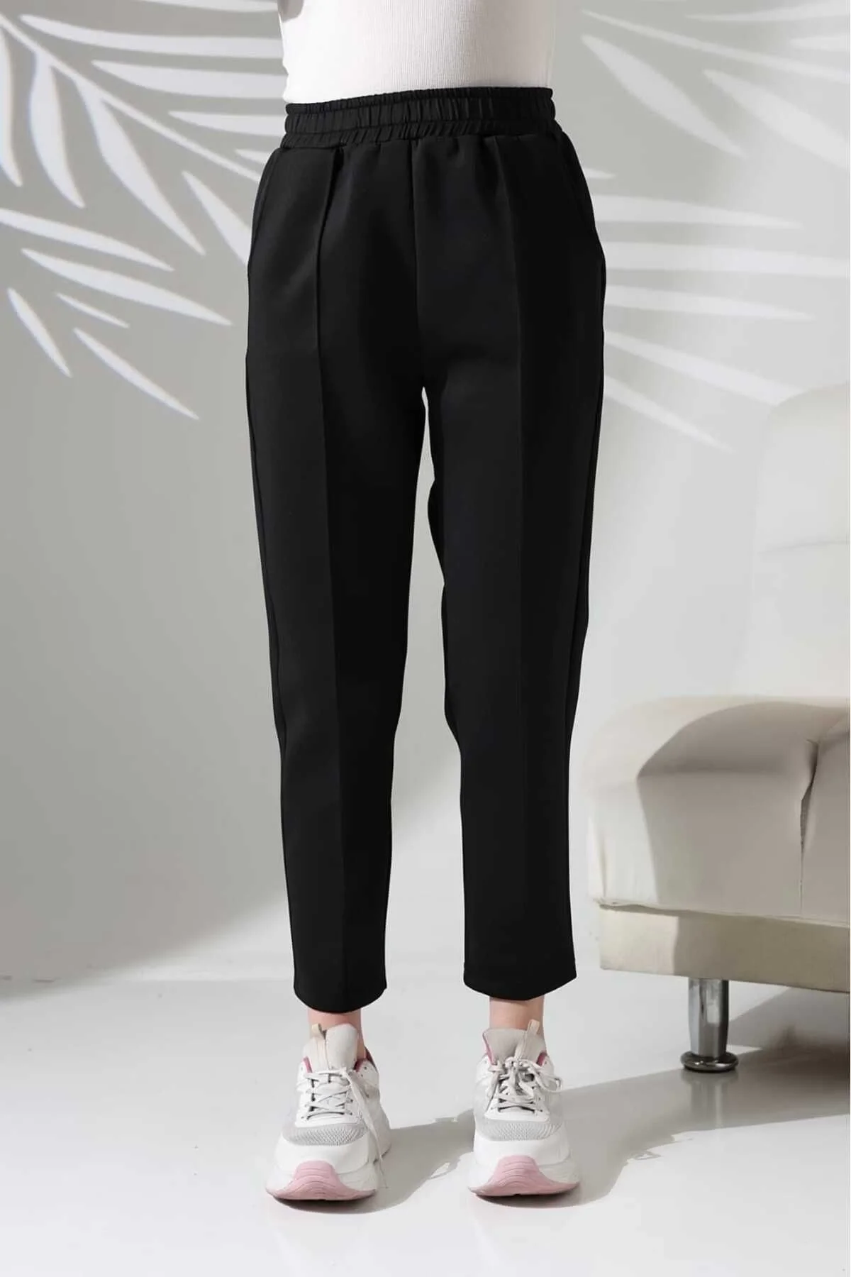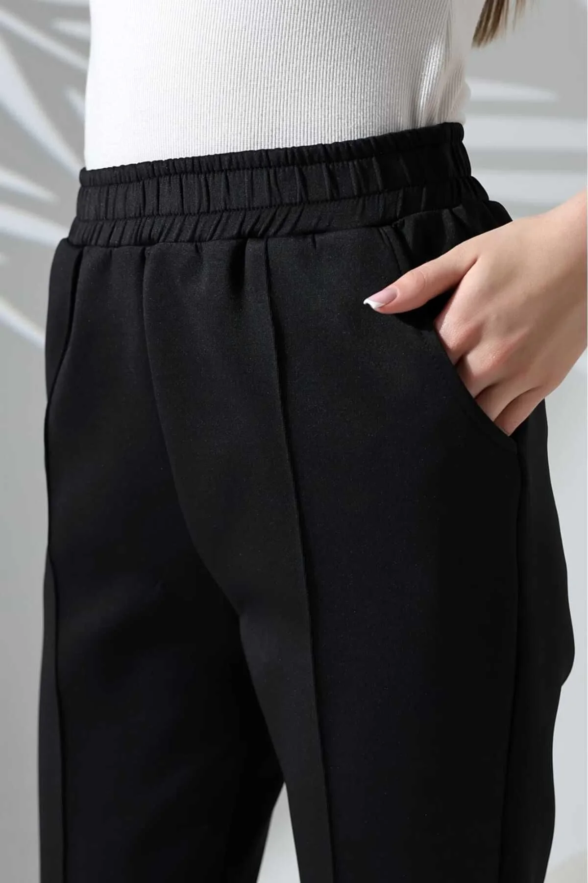 Kumaş Türü:Scuba (Esnek ve tok yapısıyla rahat hareket imkanı sağlar).; Kesim:Yüksek bel ve rahat kesim, modern bir görünüm sunar.; Boy Uzunluğu:100 cm (Bilek boy tasarımıyla şıklığı tamamlar).; Kullanım Alanı:Hem şık kombinler hem de günlük spor tarz için ideal.; Cep Detayı:Yan cepleriyle işlevsellik sağlar.; Renk:Siyah (Her kombine uyumlu).; Ürün Avantajları:; Esnek yapısıyla gün boyu rahatlık sunar.; Kırışmaya dayanıklı kumaşı sayesinde zahmetsiz kullanım.; Şık ve spor kombinlerde kullanılabilir.; Yüksek bel tasarımıyla vücudu daha fit gösterir.; Bakım ve Yıkama Talimatları:; Makinede 30 derece hassas yıkama yapınız.; Ütü gerektirmez, kolayca kullanıma hazır.;