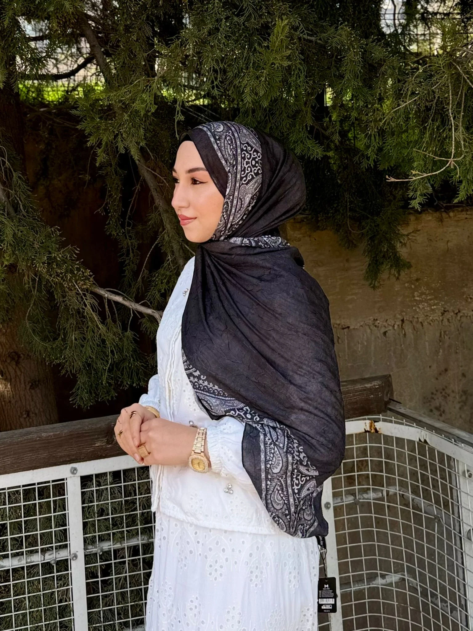 Bu siyah etnik desenli şalı, beyaz fisto bir tunik veya antrasit bir takım elbise ile kombinleyerek asil bir görünüm elde edebilirsiniz. Gri veya gümüş rengi aksesuarlarla desenin rengini vurgulayarak profesyonel bir stil yaratın.
