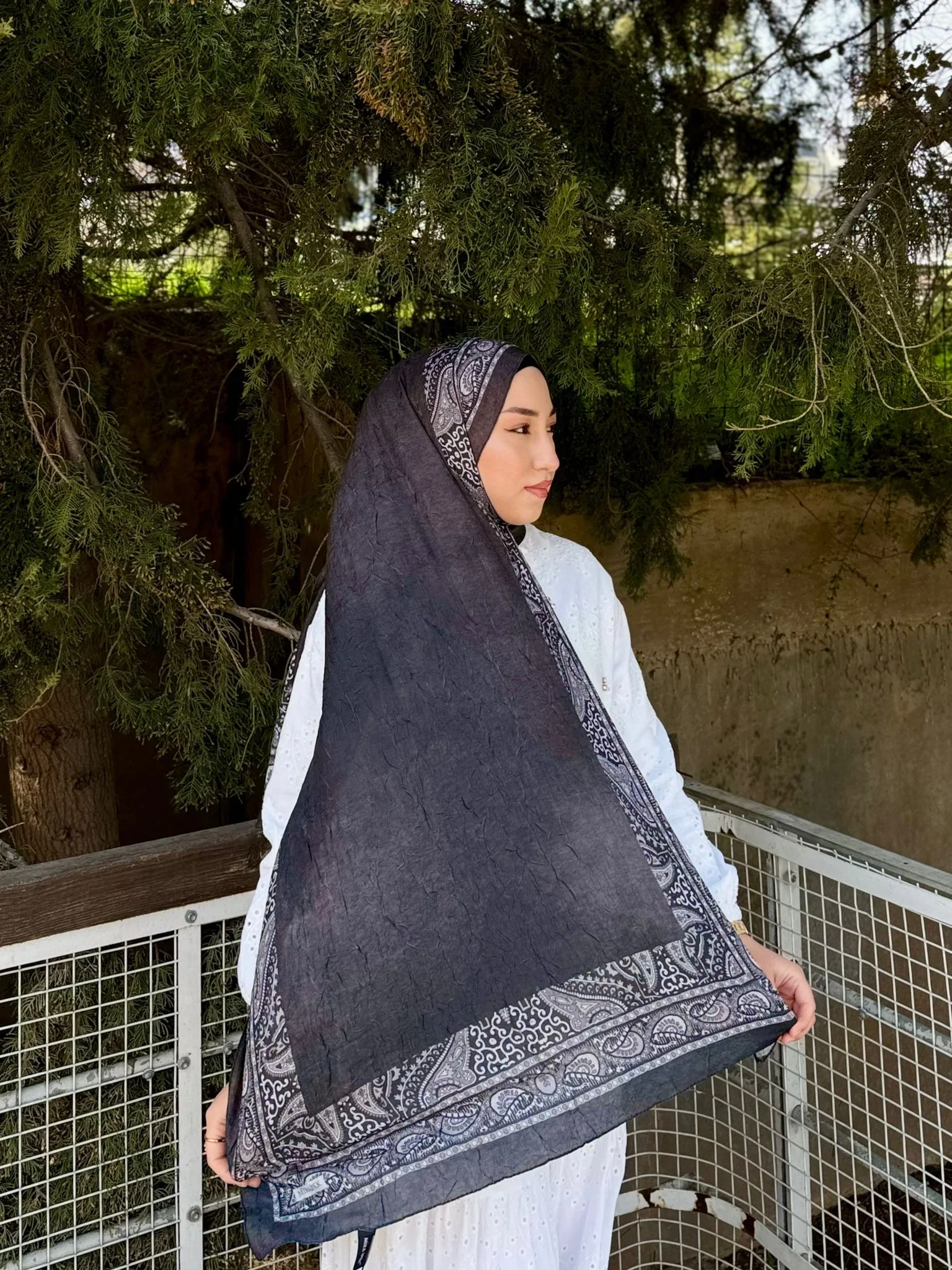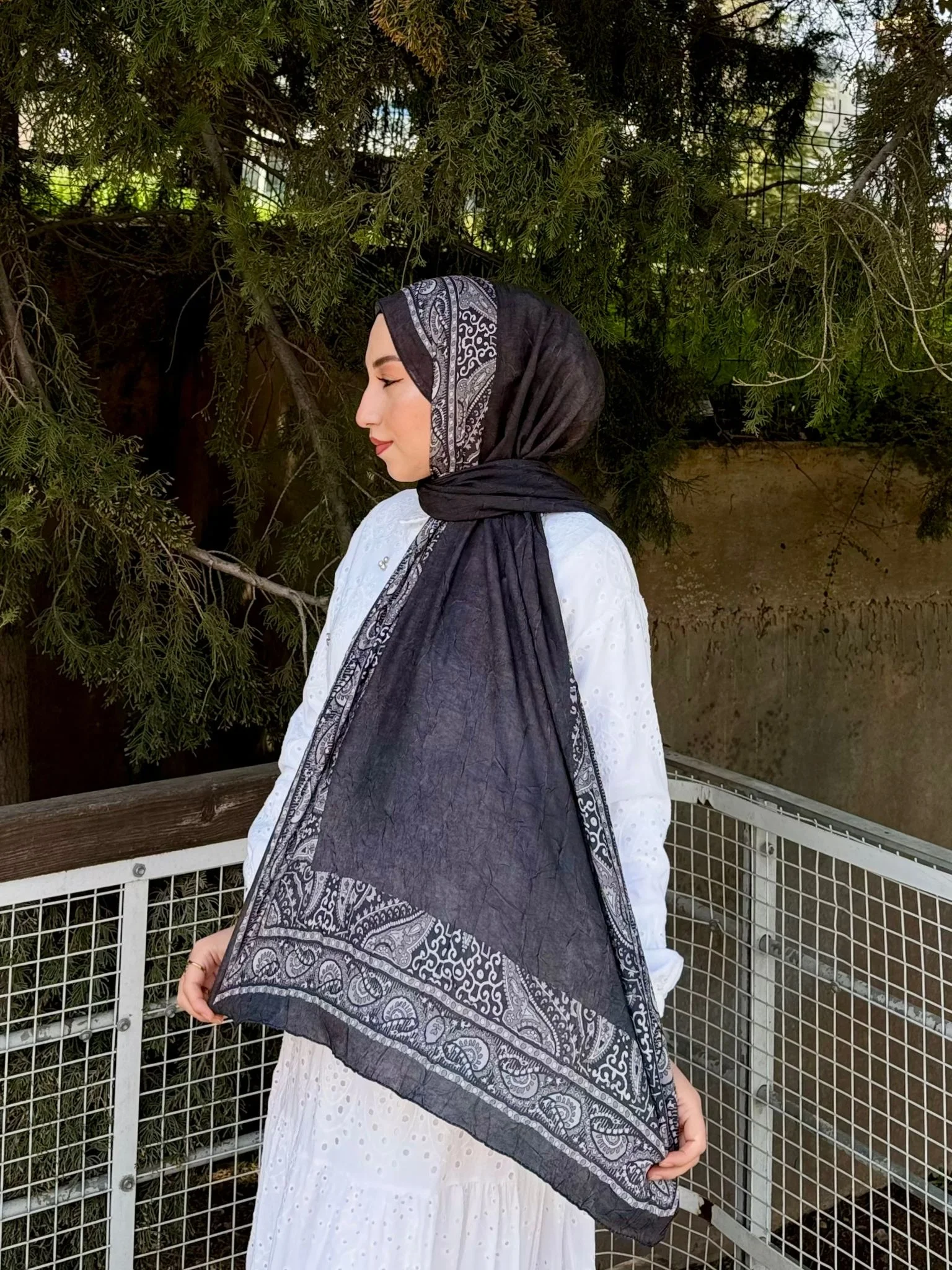 Siyahın zamansız gücünü geleneksel etnik motiflerle buluşturan bu siyah pamuklu bambu şal, ağırbaşlı ve sofistike bir stil vadediyor. Şalın kenarlarını çevreleyen gri paisley (şal desen) detayları, bambu lifinin doğal parlaklığı ve pamuğun konforuyla birleşerek günlükten geceye her ana uyum sağlar.