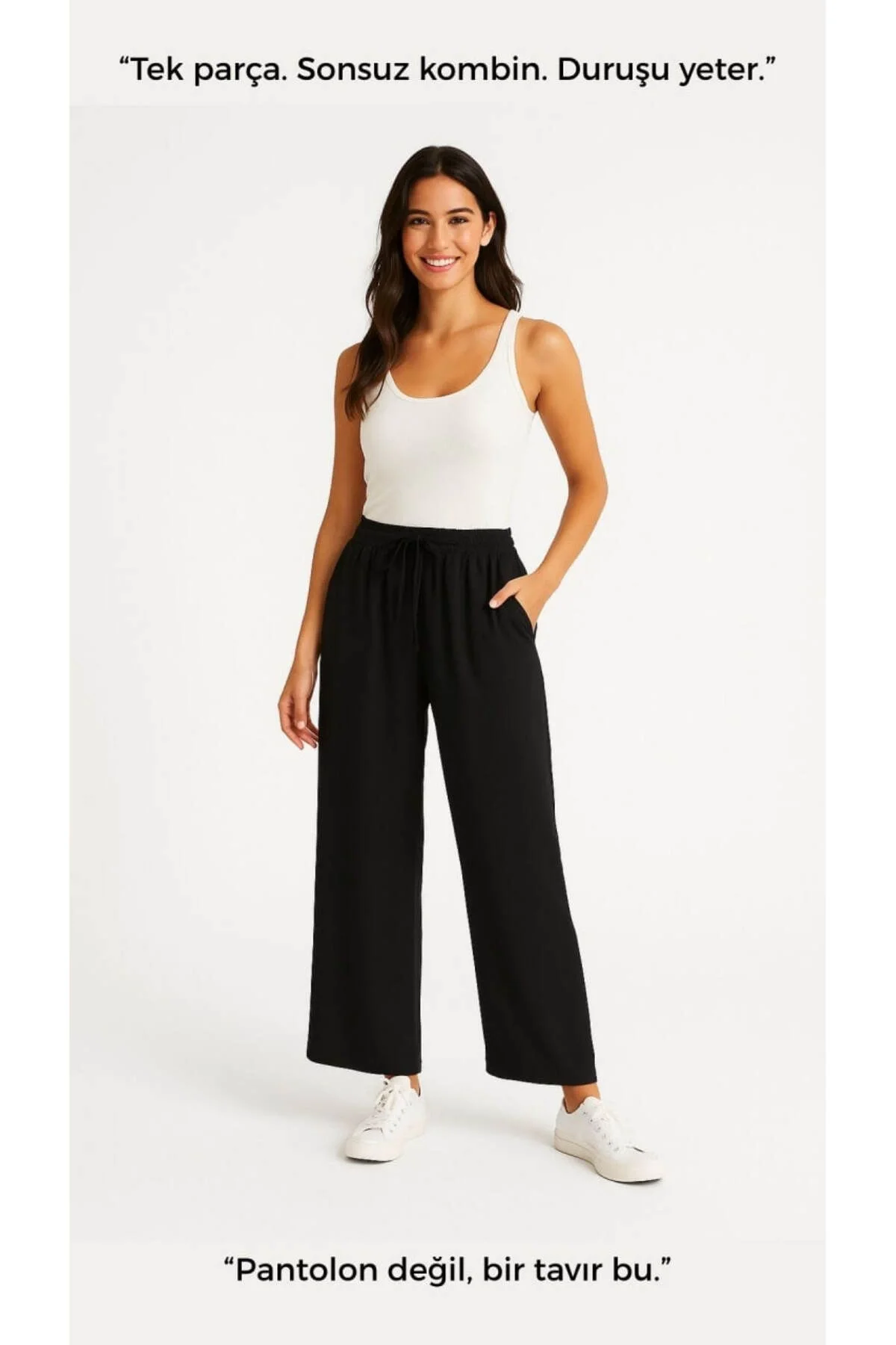 Geniş paça kesimiyle modern ve şık bir görünüm sunar.