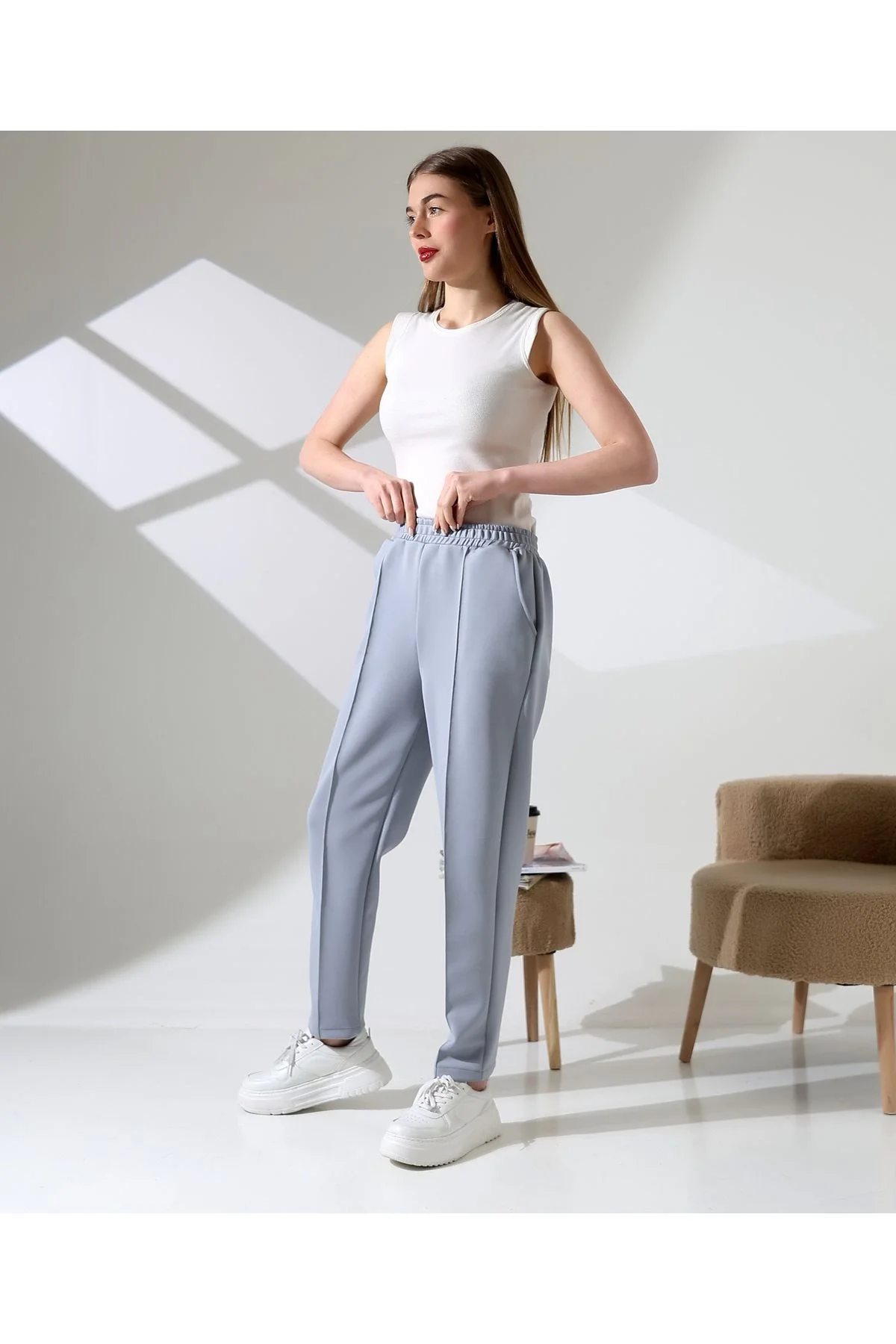 Kadın Yüksek Bel Lastikli Düz Renk Cepli Çizgili Bilek Boy Scuba Kumaş Jogger Pantolon