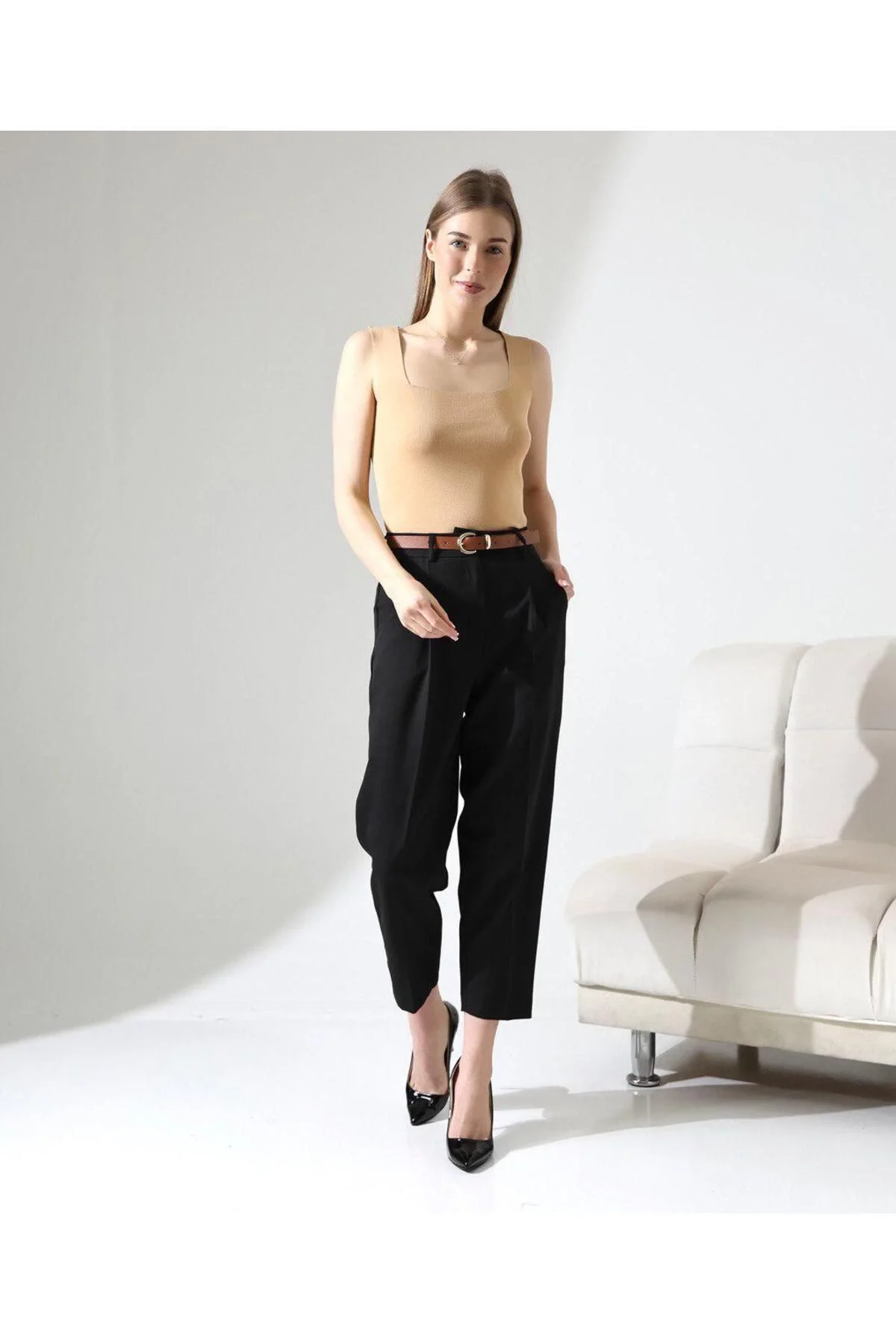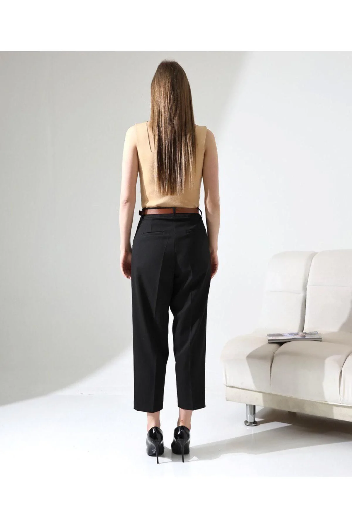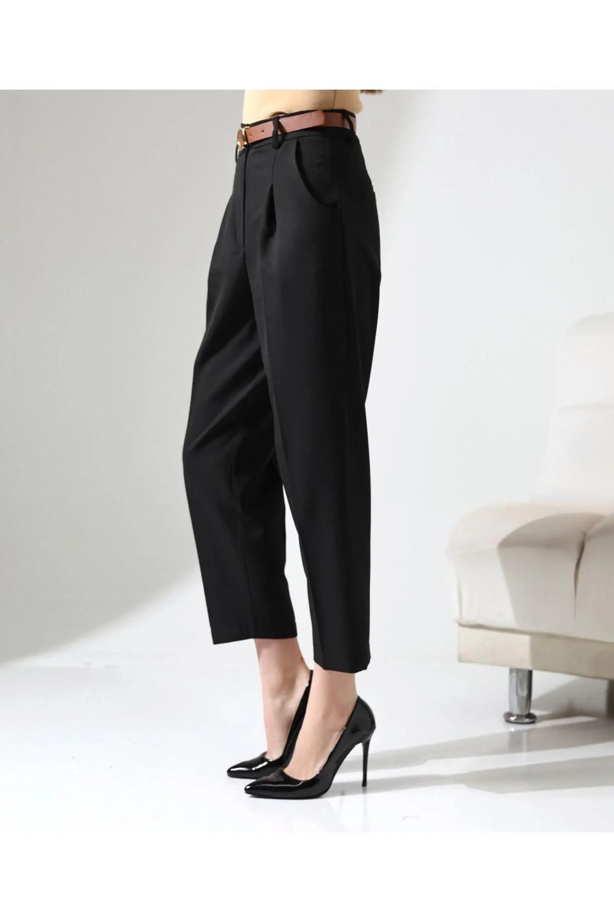 Kadın Yüksek Bel Straight Havuç Kesim Pileli Kemerli Kumaş Pantolon - Siyah
