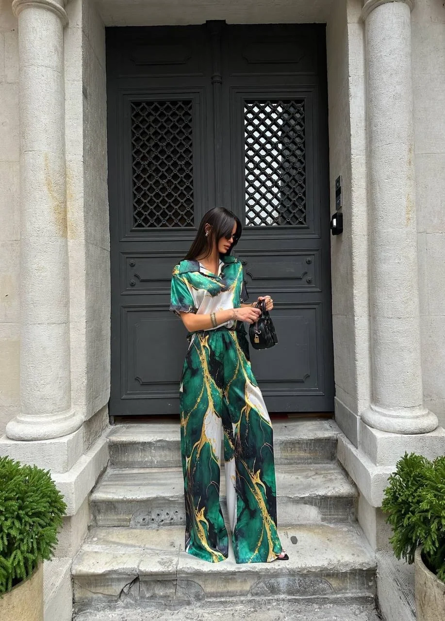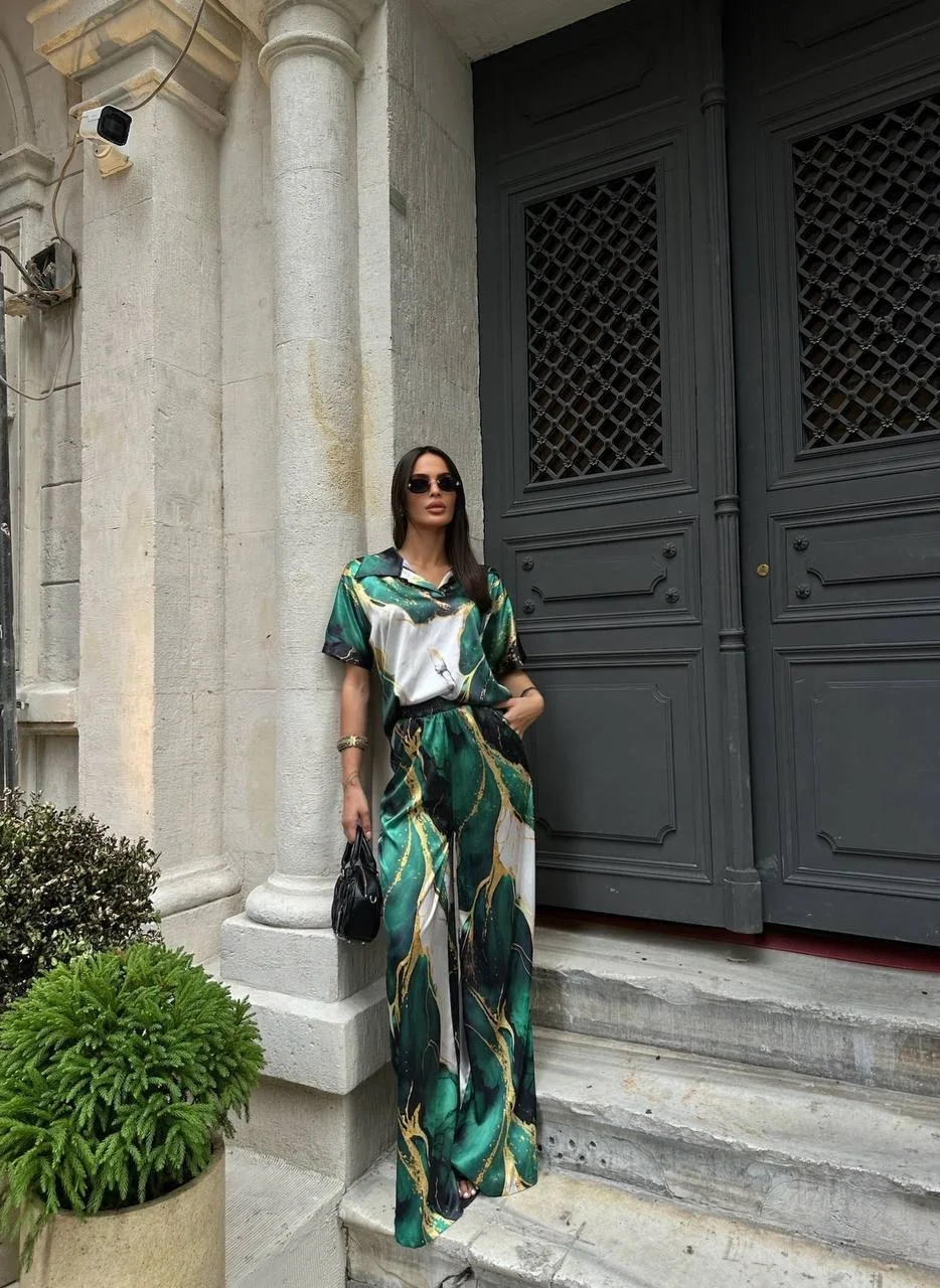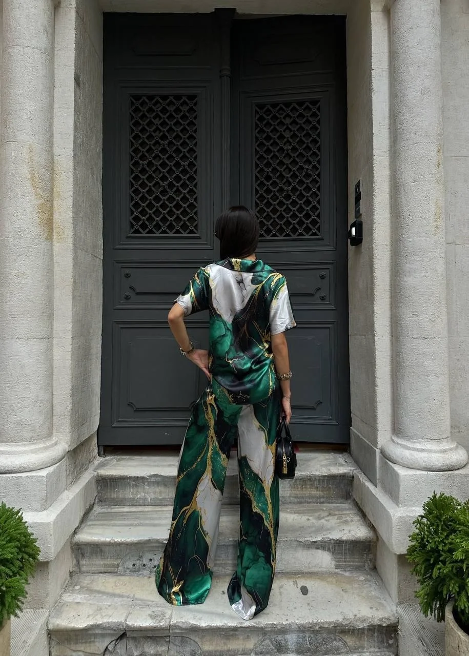 Satenin ipeksi dokunuşu ve mermer deseninin büyüleyici estetiği bir arada... Bu zümrüt yeşili saten takım pijama şıklığı trendini sokak modasına taşıyor. Akışkan kumaş yapısı ve altın sarısı detaylarla zenginleşen deseniyle hem konforu hem de lüks görünümü aynı anda sunuyor.