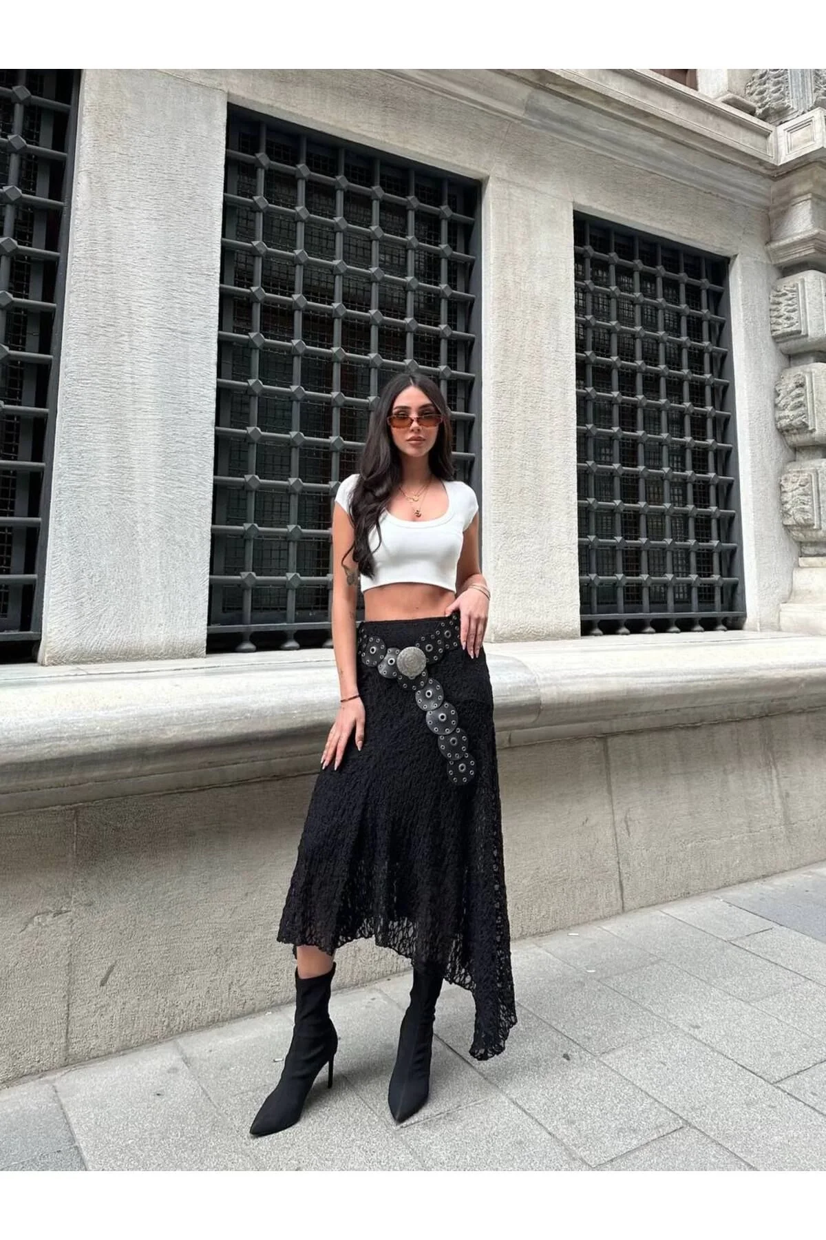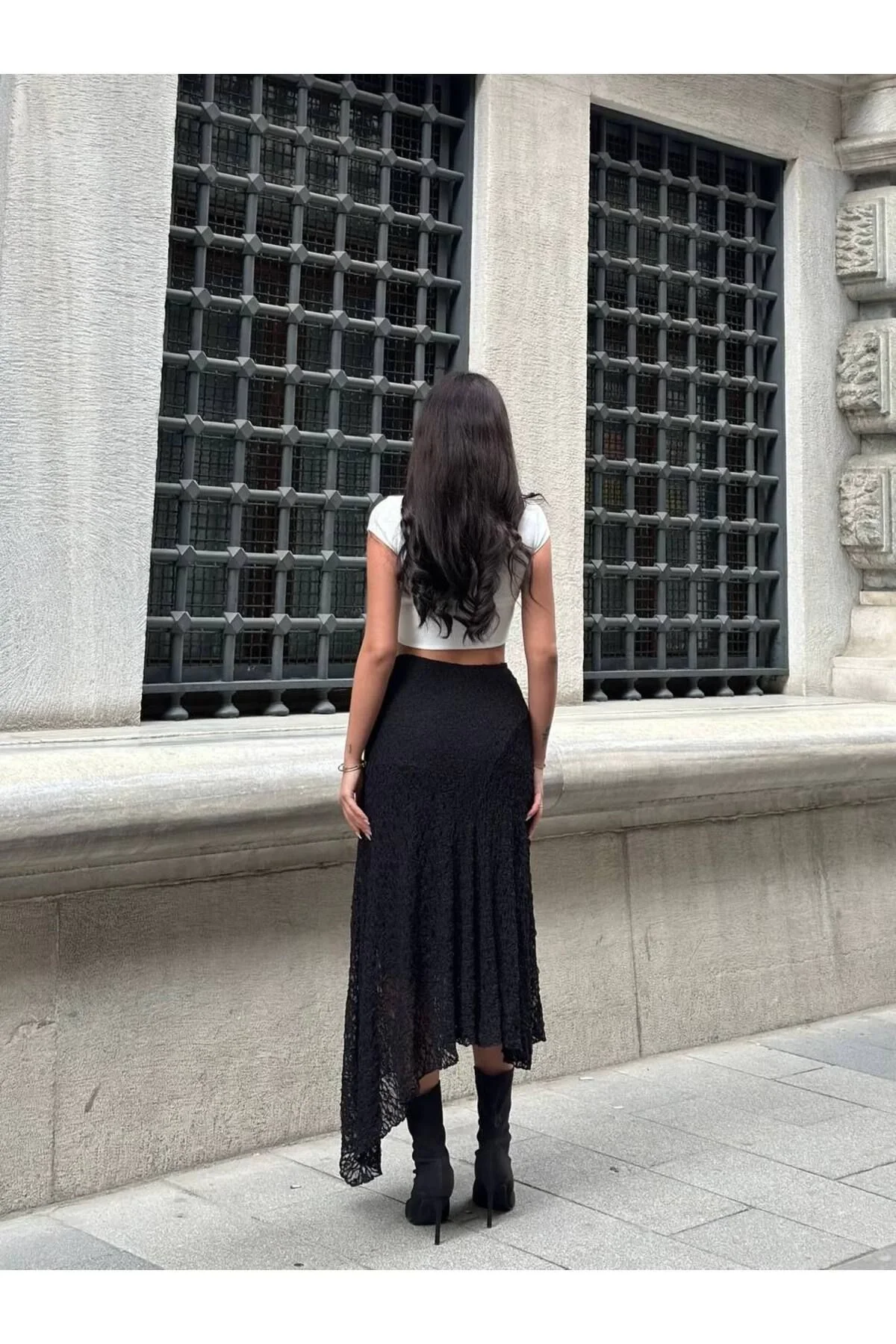 Kadın Yüksek Bel Beli Lastikli Asimetrik Kesim Dantelli Midi Boy Etek - Siyah