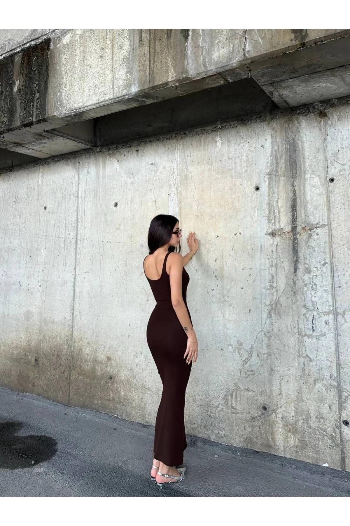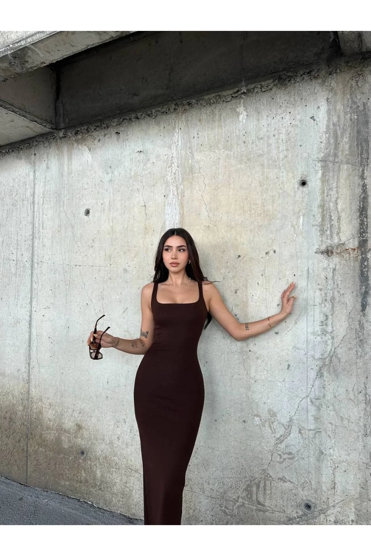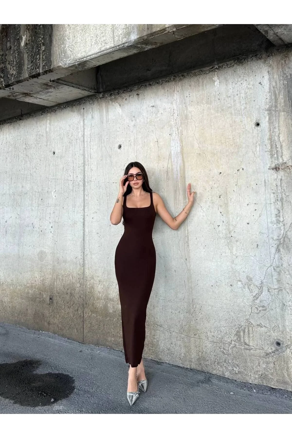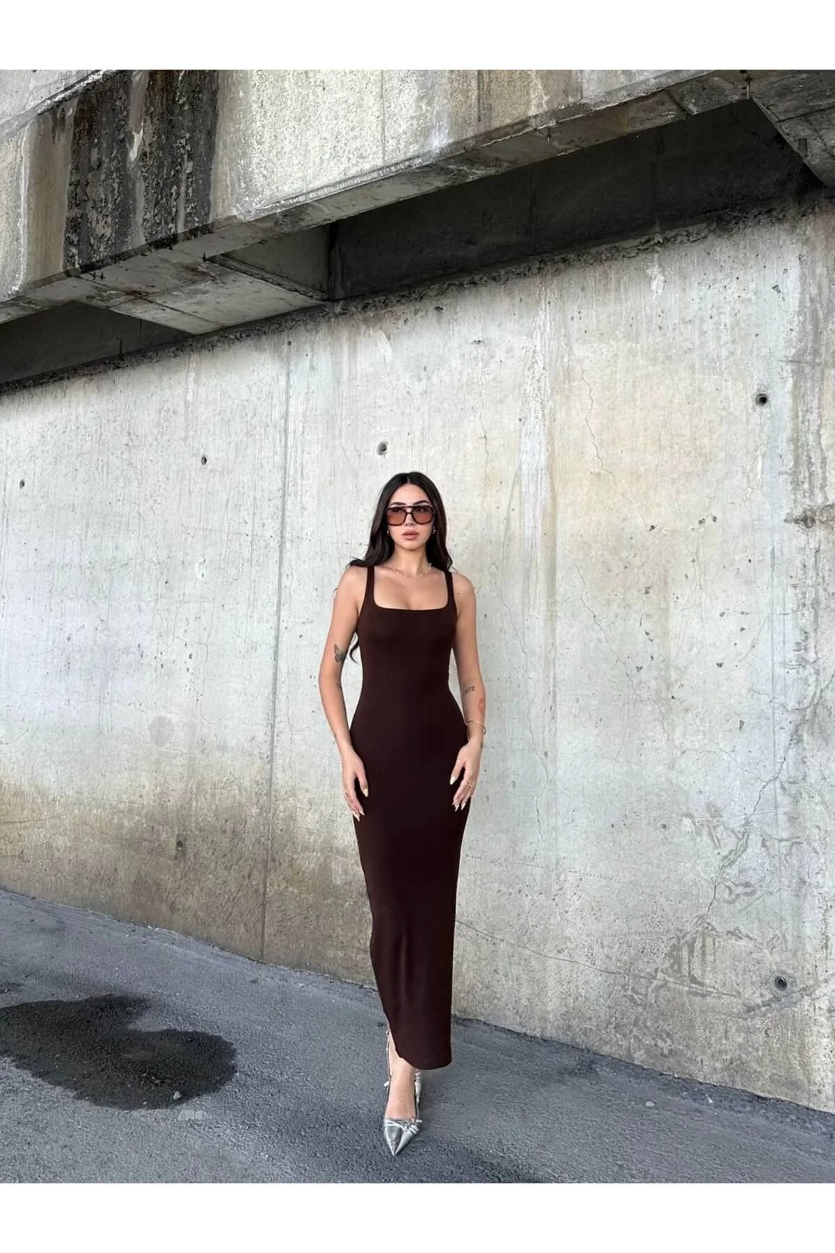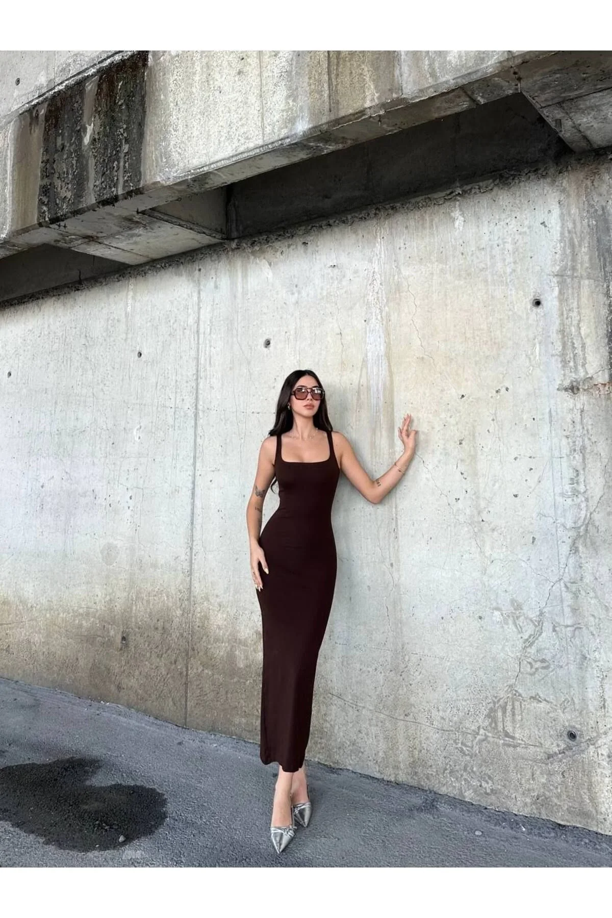 Kadın Kalın Askılı Kare Yaka Yırtmaçlı Kaşkorse Kalem Elbise - Kahverengi