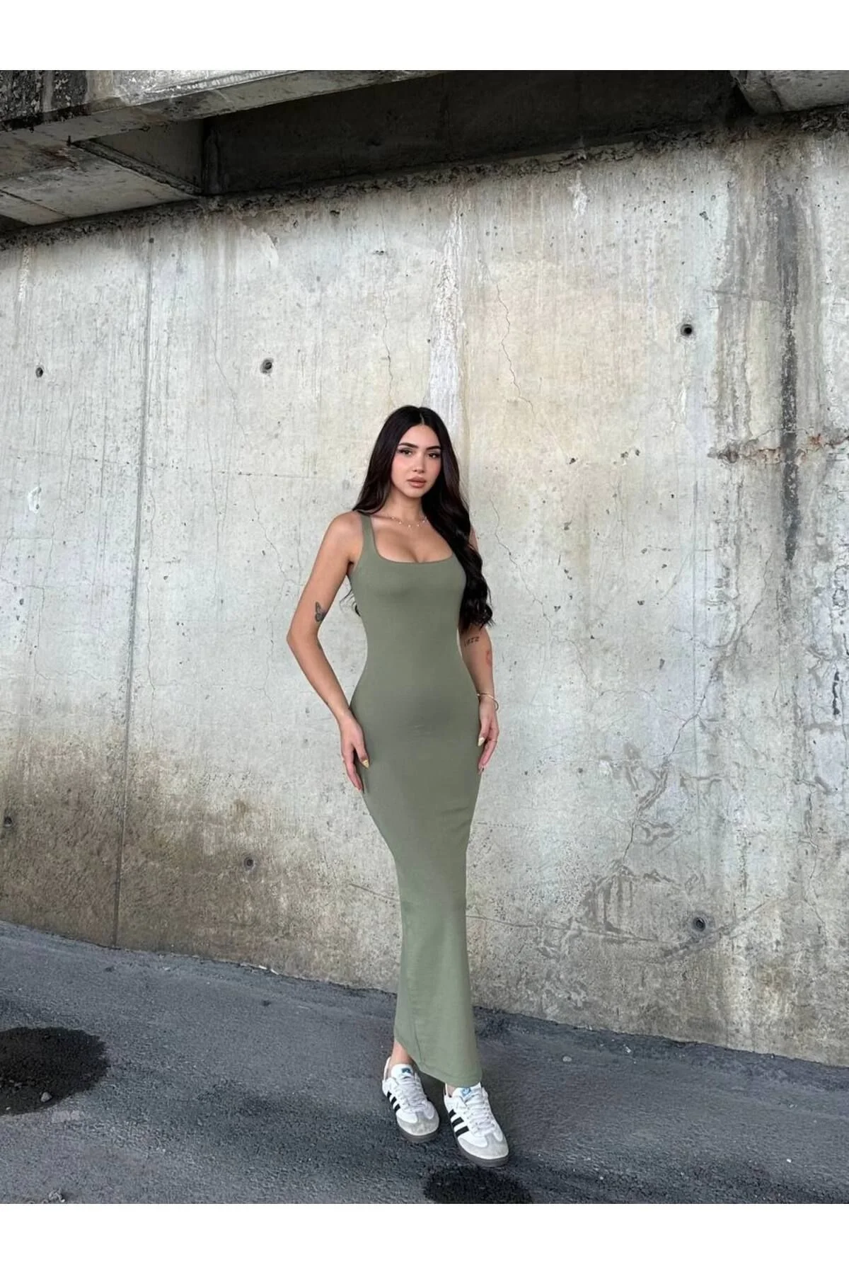 Kadın Kare Yaka Kalın Askılı Vücudu Saran Kaşkorse Maxi Boy Elbise - Haki