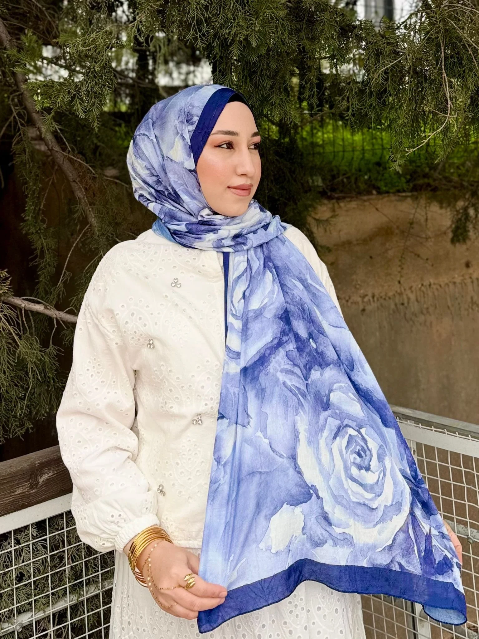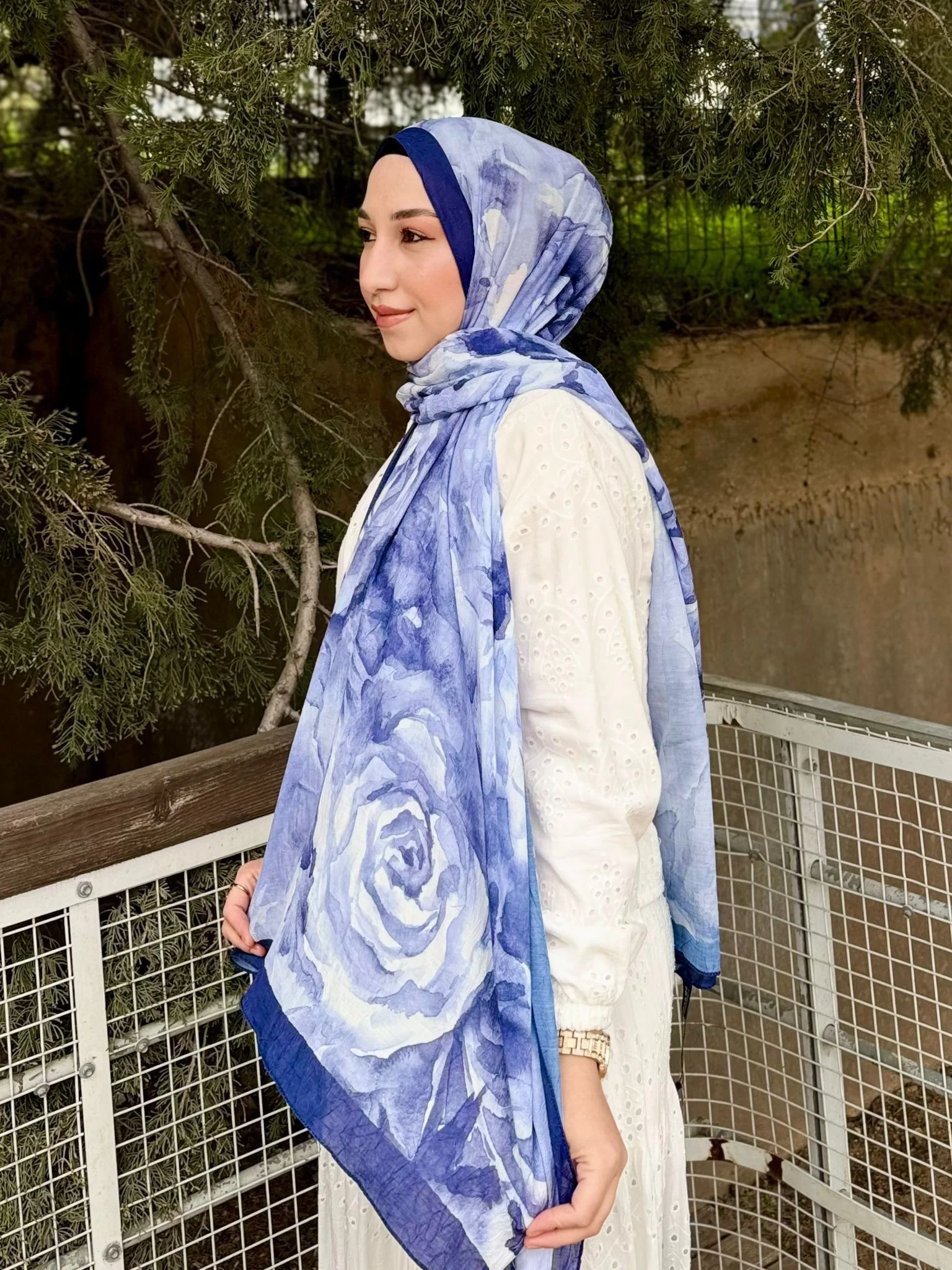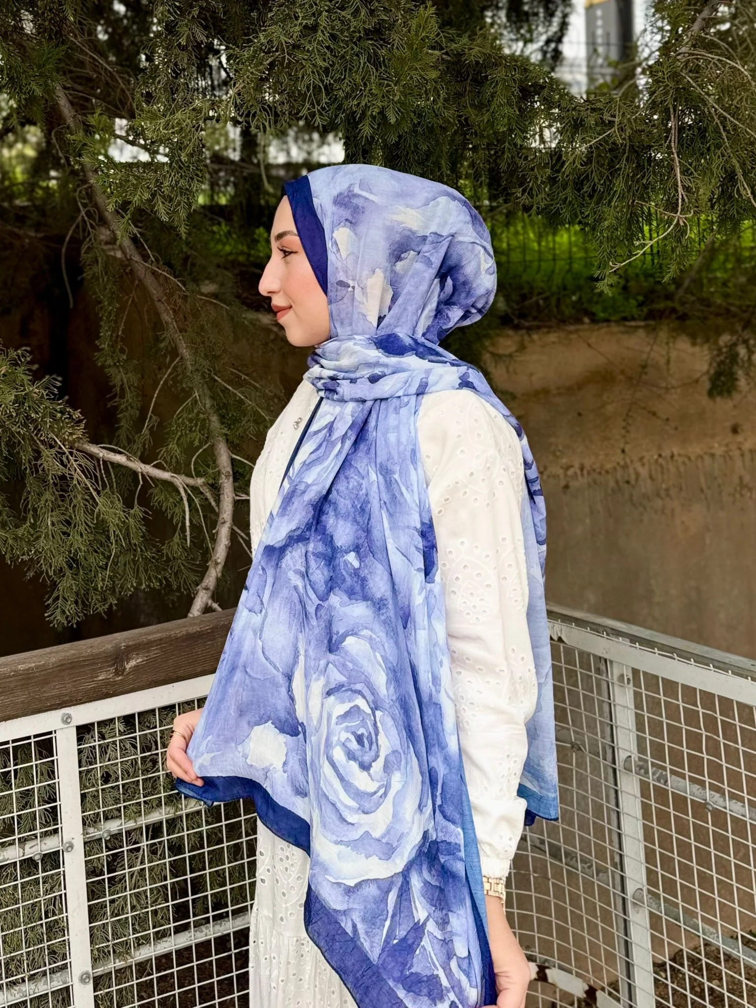 Bu mavi desenli bambu şalı, beyaz fisto elbiselerinizle kombinleyerek yazın en romantik stilini yakalayabilirsiniz. Daha spor bir görünüm için kot ceket ve açık renkli basic tunikler ile eşleştirerek mavinin huzurunu tarzınıza yansıtın.