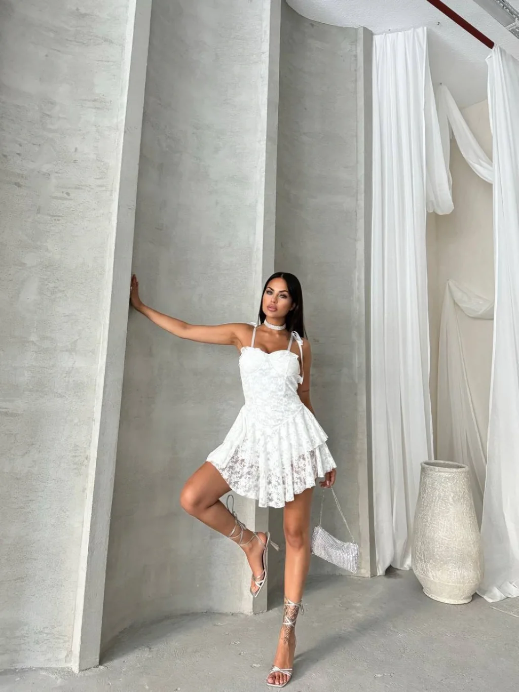 Bu beyaz dantel elbise, iddialı bir stil ifadesidir. Onu platform topuklu ayakkabılar veya ince bantlı stiletto'lar ile tamamlayarak partinin en dikkat çekici ismi olun. Minimalist gümüş rengi takılar ve şık bir clutch çanta, görünümünüzü mükemmel bir şekilde tamamlayacaktır.
