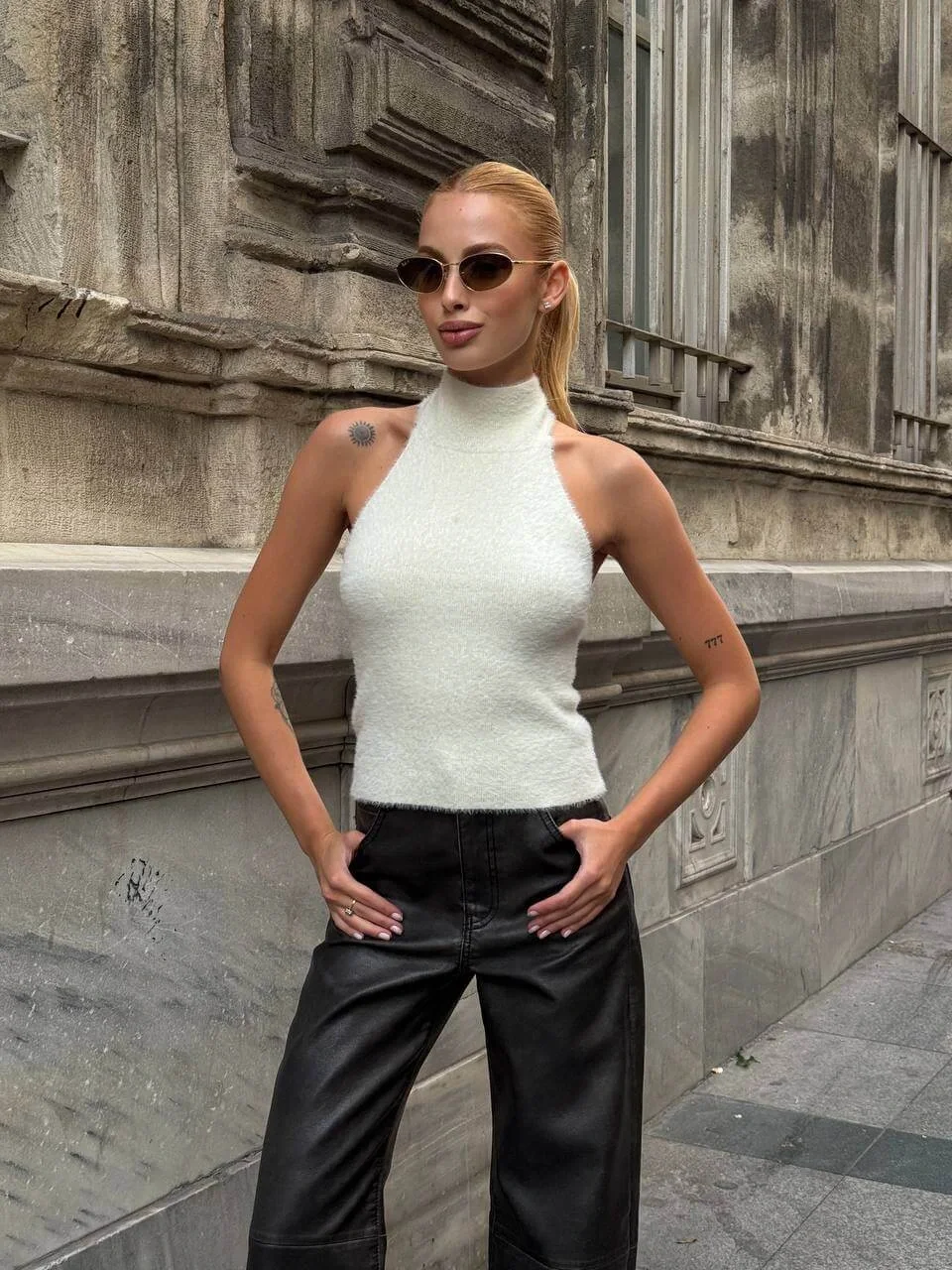 Dokusuyla büyüleyen, tasarımıyla kendine hayran bırakan bir parça... Sırtı Açık Tüylü Triko Bluz, sofistike ve cesur detayları bir araya getirerek stilinize unutulmaz bir dokunuş katıyor.