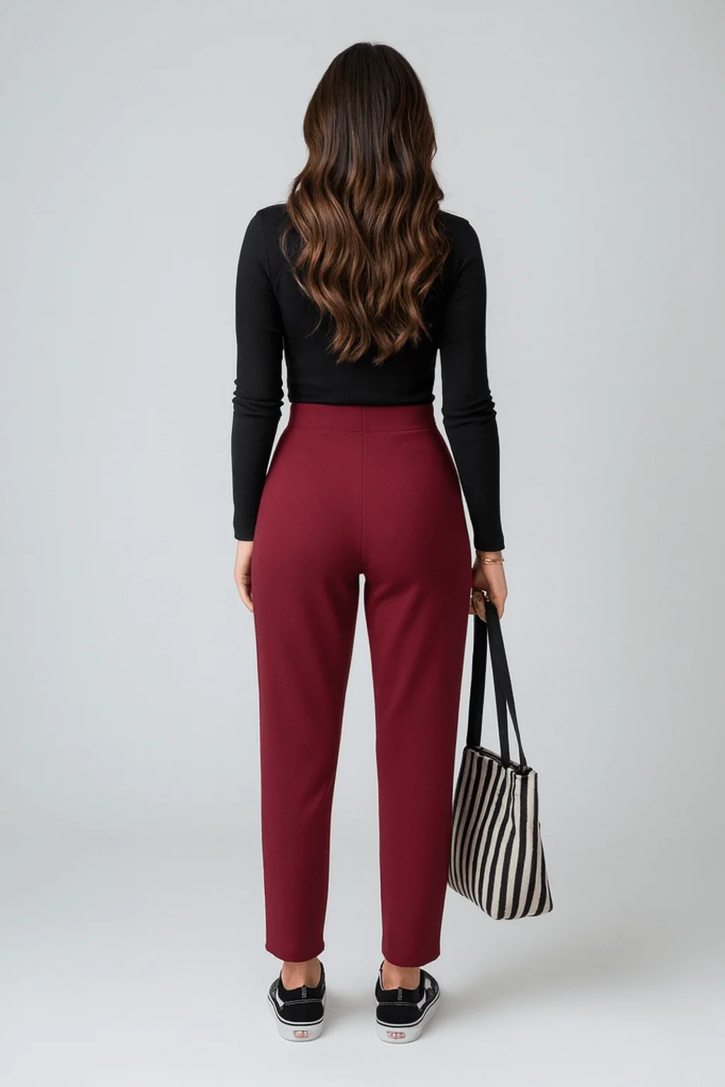 Bu bordo krep pantolon, renkli ve cesur bir stilin anahtarıdır. Onu krem, bej veya siyah renkli bir bluzla kombinleyerek rengin gücünü ortaya çıkarabilirsiniz. Ekose bir blazer ceket ve loafer'larla ofis stilinize modern bir yorum katabilir, ince bir triko ve topuklu botlarla şıklığınızı tamamlayabilirsiniz.